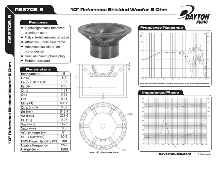 10" Reference Shielded Woofer 8 Ohm 10" Reference Shielded Woofer 8 Ohm RS270S-8 RS270S-8 * Lightweight black anodized aluminum cone * Fully shielded magnetic structure * Attractive 6-hole cast frame * Advanced low distortion motor design * Solid aluminum phase plug * Rubber surround @ 1 kHz 8 6.9 1.23 26.9 1.81 0.53 0.41 40.03 0.87 346.4 228.6 9.27 147.2 6.6 51 90.5 100 25 1500 Note: Due to testing limitations, response below 200 Hz is not an actual representation. 50 180° 45 90° 40 0 deg 35 -90° 30 -180° 25 20 15 10 5 0