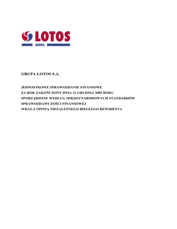 GRUPA LOTOS S.A. JEDNOSTKOWE SPRAWOZDANIE FINANSOWE ZA ROK ZAKOŃCZONY DNIA 31 GRUDNIA 2005 ROKU SPORZĄDZONE WEDŁUG MIĘDZYNARODOWYCH STANDARDÓW SPRAWOZDAWCZOŚCI FINANSOWEJ WRAZ Z OPINIĄ NIEZALEŻNEGO BIEGŁEGO REWIDENTA GRUPA LOTOS S.A. BILANSE na dzień 31 grudnia 2005 roku i 31 grudnia 2004 roku w tysiącach złotych 31 grudnia 2005 31 grudnia 2004 12 13 14 1.885.333 44.035 686.507 ---------2.615.875 1.801.271 43.911 252.904 --------2.098.086 15 1.258.336 768.075 1.066.411 722.544 - 7.859 Nota AKTYWA Aktywa trwałe Rzeczowe aktywa trwałe Wartości niematerialne Aktywa finansowe Aktywa obrotowe Zapasy Należności z tytułu dostaw oraz pozostałe należności, w tym z tytułu: - należności z tytułu podatku dochodowego Czynne rozliczenia międzyokresowe kosztów Krótkoterminowe aktywa finansowe Środki pieniężne i ich ekwiwalenty Aktywa razem 16 16 17 18 19 2.022 133.938 298.981 ---------2.759.688 3.494 43.234 79.897 ---------1.617.244 ========== 5.375.563 ========== ========== 3.715.330 ========== 2 GRUPA LOTOS S.A. BILANSE na dzień 31 grudnia 2005 roku i 31 grudnia 2004 roku w tysiącach złotych 31 grudnia 2005 31 grudnia 2004 22 22 113.700 970.951 2.993.782 --------4.078.433 78.700 2.473.654 --------2.552.354 25 26 34 14.288 178.079 --------192.367 112.289 15.442 190.959 --------318.690 27 1.060.609 27 25 26 60.211 44.154 --------1.104.763 177.544 50.647 --------844.286 ========== 5.375.563 ========== ========== 3.715.330 ========== Nota PASYWA Kapitał własny Kapitał akcyjny Kapitał zapasowy Zyski zatrzymane Kapitał własny razem Zobowiązania długoterminowe Kredyty i pożyczki Rezerwy długoterminowe Rezerwa na podatek odroczony Zobowiązania długoterminowe razem Zobowiązania krótkoterminowe Zobowiązania z tytułu dostaw i usług, rozliczenia międzyokresowe bierne oraz pozostałe zobowiązania, w tym: - zobowiązania z tytułu podatku dochodowego Kredyty i pożyczki Rezerwy krótkoterminowe Zobowiązania krótkoterminowe razem Pasywa razem 616.095 3 GRUPA LOTOS S.A. RACHUNKI ZYSKÓW I STRAT za rok zakończony 31 grudnia 2005 roku i 31 grudnia 2004 roku Nota za rok zakończony 31 grudnia 2005 za rok zakończony 31 grudnia 2004 Przychody ze sprzedaży 29 8.545.728 6.590.719 Koszt własny sprzedaży 30 (7.549.452) --------996.276 (5.585.188) --------1.005.531 Pozostałe przychody operacyjne 31 9.828 12.828 Koszty sprzedaży Koszty ogólnego zarządu Pozostałe koszty operacyjne 30 30 32 (312.637) (148.242) (10.144) --------535.081 (248.141) (135.025) (105.219) --------529.974 33 33 139.156 (27.067) --------647.170 123.705 (29.959) --------623.720 34 (114.902) --------532.268 ========= (128.305) --------495.415 ========= w tysiącach złotych Zysk na sprzedaży Zysk operacyjny Przychody finansowe Koszty finansowe Zysk przed opodatkowaniem Podatek dochodowy od osób prawnych Zysk netto Zysk na jedną akcję - podstawowy - rozwodniony 24 5,51 - 6,29 - 4 GRUPA LOTOS S.A. RACHUNKI PRZEPŁYWÓW PIENIĘŻNYCH za rok zakończony 31 grudnia 2005 roku i 31 grudnia 2004 roku w tysiącach złotych Przepływy środków pieniężnych z działalności operacyjnej Zysk netto Korekty o pozycje: Amortyzacja Zyski z tytułu różnic kursowych Odsetki i dywidendy zapłacone netto (Zysk)/strata z tytułu działalności inwestycyjnej Podatek dochodowy bieżącego okresu Podatek dochodowy zapłacony Zwiększenie stanu należności Zwiększenie stanu zapasów Zwiększenie/(zmniejszenie) stanu zobowiązań Zwiększenie stanu rozliczeń międzyokresowych biernych Zwiększenie/(zmniejszenie) stanu rezerw Zmniejszenie stanu rozliczeń międzyokresowych czynnych Pozostałe pozycje netto Nota 21 21 21 21 Środki pieniężne netto z działalności operacyjnej Przepływy środków pieniężnych z działalności inwestycyjnej Przychody ze sprzedaży środków trwałych i wartości niematerialnych (Zakup)/sprzedaż aktywów finansowych Dywidendy otrzymane Odsetki otrzymane Zakup środków trwałych i wartości niematerialnych (Zakup)/sprzedaż długoterminowych aktywów finansowych Pozostałe pozycje netto 21 Środki pieniężne netto z działalności inwestycyjnej Przepływy środków pieniężnych z działalności finansowej Wpływy z tytułu zaciągniętych kredytów i pożyczek Emisja akcji Wydatki z tytułu spłaty kredytów i pożyczek Wykup krótkoterminowych papierów dłużnych Zapłacone odsetki Zapłacone dywidendy Pozostałe pozycje netto 22 23 Środki pieniężne netto z działalności finansowej Zmiana stanu środków pieniężnych z tytułu różnic kursowych Zmiana stanu środków pieniężnych netto Środki pieniężne na początek okresu 21 Środki pieniężne na koniec okresu 21 - o ograniczonej możliwości dysponowania za rok zakończony 31 grudnia 2005 za rok zakończony 31 grudnia 2004 532.268 495.415 173.211 (45.284) (25.501) 114.902 (57.592) (351.726) (490.261) 371.499 13.961 (2.254) 1.472 3 --------234.698 --------- 164.119 (36.821) (12.992) 44.900 128.305 (136.503) (13.292) (287.111) (82.258) 5.656 40.198 271 19.801 --------329.688 --------- 1.478 (90.193) 51.387 298 (269.659) (234.890) (171.600) --------(713.179) --------- 22.291 106.437 23.805 703 (122.302) (17.675) (61.968) --------(48.709) --------- 1.015.000 (289.316) (6.985) (15.740) (5.394) --------697.565 --------- 24 (208.065) (18.000) (11.684) (6.217) (7.521) --------(251.463) --------- ========= 219.084 ========= 79.897 ========= 298.981 ========= 29.516 ========= 50.381 ========= 79.897 - 12.540 5 GRUPA LOTOS S.A. SPRAWOZDANIE ZE ZMIAN W KAPITALE WŁASNYM za rok zakończony 31 grudnia 2005 roku i 31 grudnia 2004 roku w tysiącach złotych 1 stycznia 2004* Zmiana standardów rachunkowości i polityk rachunkowości Transfery 1 stycznia 2004 skorygowany Zysk netto za rok zakończony 31 grudnia 2004 Dywidendy dla akcjonariuszy z podziału zysku za 2003 rok 31 grudnia 2004 Zysk netto za rok zakończony 31 grudnia 2005 Dywidendy dla akcjonariuszy z podziału zysku za 2004 rok Emisja akcji Nadwyżka ceny emisyjne