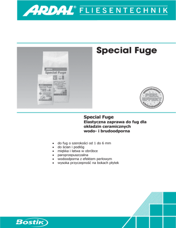 Special Fuge Flexibler Fugenmörtel für Keramikbeläge wasser- und schmutzabweisend Special Fuge Elastyczna zaprawa do fug dla okáadzin ceramicznych wodo- i brudoodporna x x x x x x do fug o szerokoĞci od 1 do 6 mm do Ğcian i podáóg miĊkka i áatwa w obróbce paroprzepuszczalna wodoodporna z efektem peráowym wysoka przyczepnoĞü na bokach páytek Special Fuge Elastyczna zaprawa do fug dla okładzin ceramicznych wodo- i brudoodporna Opis produktu Elastyczna zaprawa do fugowania okładzin ceramicznych dla szerokości fug od 1 do 6 mm. Hydraulicznie wiążąca Special Fuge jest miękka i łatwa w obróbce. mrozoodporna, paroprzepuszczalna oraz nadaje się do podłóg ogrzewanych. Special Fuge dają znaczną, pewną przyczepność na bokach płytek, jest wodo- i brudoodporna oraz twardnieje bez pęknięć. Special Fuge jest zaprawą o niewielkiej zawartości chromianów wg TRGS 613. Zastosowanie Special Fuge nadaje się do fugowania ceramicznych okładzin ściennych i podłogowych, płytek gresowych, mozaiki szklanej oraz niewrażliwych na przebarwienia kamieni naturalnych wewnątrz i na zewnątrz budynków. Można ją stosować również na podłogach ogrzewanych oraz w szczególności do fugowania ceramiki o wrażliwej powierzchni. Dla kamionki szlachetnej oraz płyt łupanych zalecamy stosowanie ARDAL Maxi Fuge (szerokości fugi od 2 do 20 mm), w obszarach o dużym obciążeniu wilgocią oraz pod wodą ARDAL Flex Fuge (szerokości fug od 3 do 15 mm), natomiast przy dużym obciążeniu chemicznym ARDAL Unipox Fugen-Epoxi. Wymagania podłoża wobec Przed rozpoczęciem pracy należy fugi wydrapać i powierzchnie oczyścić. Fugi muszą być wolne od resztek zaprawy. Przy fugowaniu szczególnie ważne jest, aby podłoże było równomiernie suche. Różne wartości wilgoci w podłożu mogą spowodować powstanie plam lub zmarmurkowanie materiału do fugowania. Sposób użycia Special Fuge nie stosować w temperaturach pomieszczeń i podłoża poniżej +5°C. Fugowanie rozpocząć dopiero po związaniu zaprawy do układania płytek lub kleju cienkowarstwowego, w zależności od stosowanego kleju najwcześniej po upływie 3 do 24 godzin od ułożenia płytek. W czystym pojemniku przygotować 0,5 do 7,0 l wody na 25 kg proszku lub 1,3 do 1,4 l wody na 5 kg proszku. Special Fuge należy wmieszać za pomocą mieszadła o prędkości obrotowej ok. 600 min-1 do zimnej, czystej wody i całość dobrze wymieszać. Następnie odstawić na około 3 minuty i jeszcze raz krótko przemieszać. Czas przydatności do stosowania wynosi w temperaturze +18°C około 2 godziny. Masę do fugowania nakłada się za pomocą gumowej szpachli najlepiej najpierw w poprzek, a następnie jeszcze raz po przekątnej do fugi. Należy uważać, aby fugi zostały wypełnione w całości. Kiedy zaprawa 4QJTUSFžDJ nieco stężeje, powierzchnię okładzin zmywa się mokrą gąbką. Po wyschnięciu zaprawy, ok. 24 godziny po fugowaniu, pozostałe na powierzchni okładziny smugi zaprawy usunąć suchą, czystą i nie barwiącą szmatką. Świeżo zafugowane powierzchnie chronić przed przeciągiem i promieniowaniem słonecznym. Zużycie 0,4 do 0,8 kg/m2 w zależności od głębokości fugi i wielkości płytki. Dane techniczne: Szerokości fug od 1 do 6 mm Przygotowanie 5 kg proszku na 1,3-1,4 l wody 25 kg proszku na 6,5-7,0 l wody Czas przydatności do stosowania ok. 2 godziny w temperaturze +18°C Temperatura obróbki +5°C do +25°C Możliwość wejścia posadzkę po ok. 12 godzinach na Pełne obciążenie po ok. 24 godzinach Czyszczenie Narzędzia wyczyścić niezwłocznie wodą. Pielęgnacja i czyszczenie zafugowanych powierzchni tylko przy użyciu neutralnych środków czyszczących. Powierzchnie po fugowaniu spłukać czystą wodą. BHP Produkt zawiera cement i reaguje z wodą alkalicznie. Należy chronić oczy i skórę. Przestrzegać ostrzeżeń i wskazówek bezpieczeństwa, podanych na opakowaniach oraz w arkuszach danych bezpieczeństwa. Ważna wskazówka Możliwe są niewielkie różnice w kolorach. Dla powierzchni ciągłych stosować materiał z jednej partii oraz fugować je w tej samej temperaturze. GISCODE ZP 1 Przechowywanie W miejscu chłodnym i suchym. Oryginalnie zapakowany: ok. 12 miesięcy Opakowania/kolory worek 5 kg (opakowanie zbiorcze 4 sztuki): biały, srebrnoszary, jasnoszary, sanitarnoszary, antracytowy, pergamonowy worek 25 kg: biały, srebrnoszary, sanitarnoszary 4QJTUSFžDJ 1PXZƒT[ZDIXTLB[ØXFLVE[JFMBNZ1BŴTUXVOBQPETUBXJFQS[FQSPXBE[POZDIQSØCJEPžXJBED[FŴ/JFHXBSBOUVKFNZKFEOBL[B FGFLULPŴDPXZXKFEOPTULPXZNQS[ZQBELV[QPXPEVNPƒMJXPžDJS؃OPSPEOFHP[BTUPTPXBOJBOBT[ZDIQSPEVLUØXKBLJOJF[B MFƒOZDIPEOBTXBSVOLØXNBHB[ZOPXBOJBJVƒZDJB0CPXJŕ[VKFUPSØXOJFƒXXZQBELVSPT[D[FŴX[HMŢEFNOBT[ZDIEPSBEDØX UFDIOJD[OZDIJIBOEMPXZDI;BMFDBTJŢQS[FQSPXBE[BOJFXBTOZDIQSØC 8NPNFODJFVLB[BOJBTJŢOJOJFKT[FHPQSPTQFLUVXT[ZTULJFXZEBOJB[PTUBKŕVOJFXBƒOJPOF8ZEBOP #PTUJL1PMTLB4Q[PPtVMĽSFE[LBt,MFT[D[FXPL1P[OBOJB Bostik Sp. z o.o. • ul. Średzka 8 • 63-005 Kleszczewo k./Poznania 5FM'BYt5FMt5FM Tel. / Fax 061 / 663 88 87 • Tel. 061 / 663 88 86 • Tel. 502 / 16 16 26