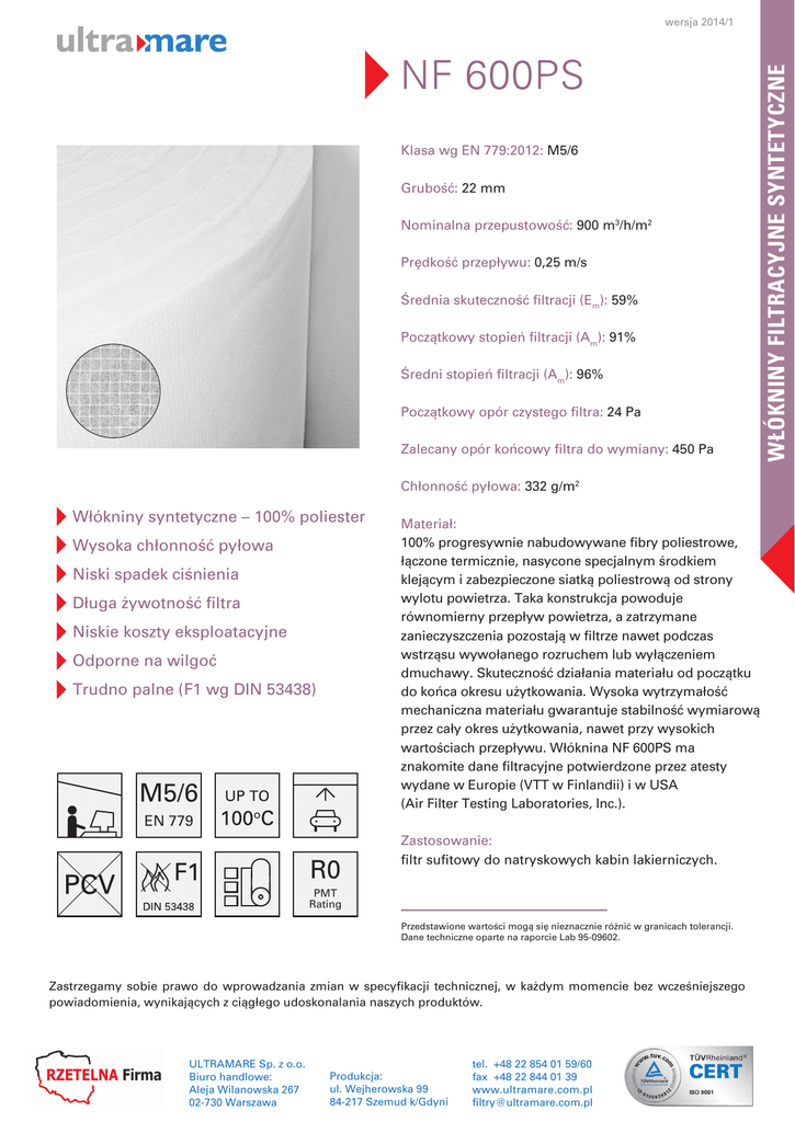 NF 600PS Klasa wg EN 779:2012: M5/6 Grubość: 22 mm Nominalna przepustowość: 900 m3/h/m2 Prędkość przepływu: 0,25 m/s Średnia skuteczność filtracji (Em): 59% Początkowy stopień filtracji (Am): 91% Średni stopień filtracji (Am): 96% Początkowy opór czystego filtra: 24 Pa Zalecany opór końcowy filtra do wymiany: 450 Pa Chłonność pyłowa: 332 g/m2 Włókniny syntetyczne – 100% poliester Wysoka chłonność pyłowa Niski spadek ciśnienia Długa żywotność filtra Niskie koszty eksploatacyjne Odporne na wilgoć Trudno palne (F1 wg DIN 53438) M5/6 Materiał: 100% progresywnie nabudowywane fibry poliestrowe, łączone termicznie, nasycone specjalnym środkiem klejącym i zabezpieczone siatką poliestrową od strony wylotu powietrza. Taka konstrukcja powoduje równomierny przepływ powietrza, a zatrzymane zanieczyszczenia pozostają w filtrze nawet podczas wstrząsu wywołanego rozruchem lub wyłączeniem dmuchawy. Skuteczność działania materiału od początku do końca okresu użytkowania. Wysoka wytrzymałość mechaniczna materiału gwarantuje stabilność wymiarową przez cały okres użytkowania, nawet przy wysokich wartościach przepływu. Włóknina NF 600PS ma znakomite dane filtracyjne potwierdzone przez atesty wydane w Europie (VTT w Finlandii) i w USA (Air Filter Testing Laboratories, Inc.). EN 779 R0 Zastosowanie: filtr sufitowy do natryskowych kabin lakierniczych. PMT Rating Przedstawione wartości mogą się nieznacznie różnić w granicach tolerancji. Dane techniczne oparte na raporcie Lab 95-09602. Zastrzegamy sobie prawo do wprowadzania zmian w specyfikacji technicznej, w każdym momencie bez wcześniejszego powiadomienia, wynikających z ciągłego udoskonalania naszych produktów. ULTRAMARE Sp. z o.o. Biuro handlowe: Aleja Wilanowska 267 02-730 Warszawa Produkcja: ul. Wejherowska 99 84-217 Szemud k/Gdyni tel. +48 22 854 01 59/60 fax +48 22 844 01 39 www.ultramare.com.pl [email protected] WŁÓKNINY FILTRACYJNE SYNTETYCZNE wersja 2014/1