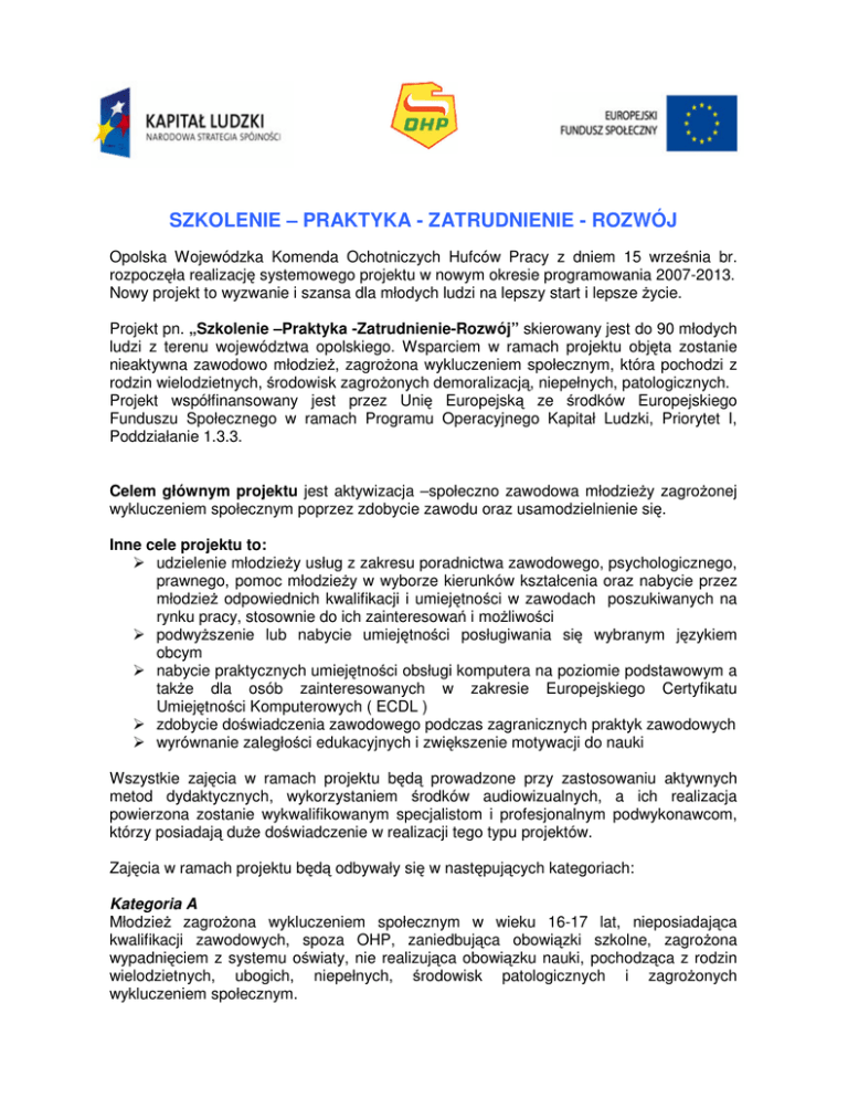 SZKOLENIE – PRAKTYKA - ZATRUDNIENIE - ROZWÓJ Opolska Wojewódzka Komenda Ochotniczych Hufców Pracy z dniem 15 września br. rozpoczęła realizację systemowego projektu w nowym okresie programowania 2007-2013. Nowy projekt to wyzwanie i szansa dla młodych ludzi na lepszy start i lepsze życie. Projekt pn. „Szkolenie –Praktyka -Zatrudnienie-Rozwój” skierowany jest do 90 młodych ludzi z terenu województwa opolskiego. Wsparciem w ramach projektu objęta zostanie nieaktywna zawodowo młodzież, zagrożona wykluczeniem społecznym, która pochodzi z rodzin wielodzietnych, środowisk zagrożonych demoralizacją, niepełnych, patologicznych. Projekt współfinansowany jest przez Unię Europejską ze środków Europejskiego Funduszu Społecznego w ramach Programu Operacyjnego Kapitał Ludzki, Priorytet I, Poddziałanie 1.3.3. Celem głównym projektu jest aktywizacja –społeczno zawodowa młodzieży zagrożonej wykluczeniem społecznym poprzez zdobycie zawodu oraz usamodzielnienie się. Inne cele projektu to: udzielenie młodzieży usług z zakresu poradnictwa zawodowego, psychologicznego, prawnego, pomoc młodzieży w wyborze kierunków kształcenia oraz nabycie przez młodzież odpowiednich kwalifikacji i umiejętności w zawodach poszukiwanych na rynku pracy, stosownie do ich zainteresowań i możliwości podwyższenie lub nabycie umiejętności posługiwania się wybranym językiem obcym nabycie praktycznych umiejętności obsługi komputera na poziomie podstawowym a także dla osób zainteresowanych w zakresie Europejskiego Certyfikatu Umiejętności Komputerowych ( ECDL ) zdobycie doświadczenia zawodowego podczas zagranicznych praktyk zawodowych wyrównanie zaległości edukacyjnych i zwiększenie motywacji do nauki Wszystkie zajęcia w ramach projektu będą prowadzone przy zastosowaniu aktywnych metod dydaktycznych, wykorzystaniem środków audiowizualnych, a ich realizacja powierzona zostanie wykwalifikowanym specjalistom i profesjonalnym podwykonawcom, którzy posiadają duże doświadczenie w realizacji tego typu projektów. Zajęcia w ramach projektu będą odbywały się w następujących kategoriach: Kategoria A Młodzież zagrożona wykluczeniem społecznym w wieku 16-17 lat, nieposiadająca kwalifikacji zawodowych, spoza OHP, zaniedbująca obowiązki szkolne, zagrożona wypadnięciem z systemu oświaty, nie realizująca obowiązku nauki, pochodząca z rodzin wielodzietnych, ubogich, niepełnych, środowisk patologicznych i zagrożonych wykluczeniem społecznym. Kategoria B Młodzież w wieku 18-25 lat zagrożona wykluczeniem społecznym, mająca trudności ze znalezieniem zatrudnienia z powodu braku wystarczających kwalifikacji odpowiadających potrzebom rynku pracy. Działania przewidziane w ramach projektu dla beneficjentów z tej grupy umożliwią im podjęcie pracy w zawodach, na które jest zapotrzebowanie na lokalnym rynku pracy. Ze względu na poziom wykształcenia i kwalifikacje zawodowe grupa jest podzielona na dwie podgrupy: Podkategoria B1 – osoby posiadające kwalifikacje zawodowe, ale wymagające podwyższenia ich poziomu lub przekwalifikowania; w ramach projektu uczestnicy odbędą zagraniczne praktyki zawodowe u pracodawców. Podkategoria B2 - osoby nie posiadające kwalifikacji, wymagające nabycia podstawowych umiejętności w drodze specjalistycznego szkolenia zawodowego (kursu); w ramach projektu uczestnicy odbędą zagraniczne praktyki zawodowe u pracodawców Kategoria C Młodzież zagrożona wykluczeniem społecznym, która ma ukończone 16 lat i co najmniej rok edukacji w ramach OHP. Wykaz zajęć w ramach projektu: 1.Grupowe integracyjne treningi i warsztaty psychologiczne (20 h/grupę) 2. Indywidualne poradnictwo psychologiczne (średnio 2 h/osobę) 3. Zajęcia z prawnikiem (5h/grupę) (uczestnicy kategorii B) 4. Zajęcia z lekarzem (5h/grupę) (uczestnicy kategorii A i C) 5. Zajęcia grupowe z doradcą zawodowym (30 h/grupę) 6. Indywidualne konsultacje z doradcą zawodowym (średnio 2 h/osobę) 7. Szkolenia i kursy w zakresie ABC przedsiębiorczości (20 h/grupę) 8. Profesjonalne szkolenia komputerowe - ECDL (120 h/grupę) (1/4 uczestników kategorii B) 9. Podstawowy kurs komputerowy (30 h/grupę) 10. Kursy języków obcych (60 h/grupę) 11. Szkolenia zawodowe (średnio 150 h/grupę) (uczestnicy kategorii B) 12. Kursy prawa jazdy (60 h/osobę) (1/3 uczestników kategorii B i C) 13. Wsparcie edukacyjne – zajęcia wyrównawcze z przedmiotów szkolnych (50 h/grupę) (uczestnicy kategorii A i C) 14. Zagraniczne praktyki zawodowe (6 tygodni/grupę) (wszyscy uczestnicy kategorii B) Do realizacji projektu zostały wytypowane następujące jednostki OWK OHP: 1.ŚHP w Nysie ul. Słowiańska 15 48-300 Nysa tel. 077 409 33 25 2.ŚHP Brzeg Żłobizna 80 49-305 Brzeg tel. 077 411 47 32 3. Ośrodek Szkolenia i Wychowania w Oleśnie ul. Wielkie Przedmieście 43 46-300 Olesno tel. 034 358 46 23 Koordynatorzy terenowi w ww. jednostkach rozpoczęli działania rekrutacyjne. W celu sprawnego przeprowadzenia rekrutacji współpracują m.in. z lokalnymi władzami, szkołami, poradniami psychologiczno-pedagogicznymi oraz parafiami rzymsko-katolickimi. Jesteśmy przekonani, że projekt ten przyczyni się do poprawy sytuacji młodych ludzi na rynku pracy a także do zmniejszenia ryzyka marginalizacji społecznej osób objętych wsparciem w ramach projektu. Bernadeta Orlikowska- Koordynator Wojewódzki