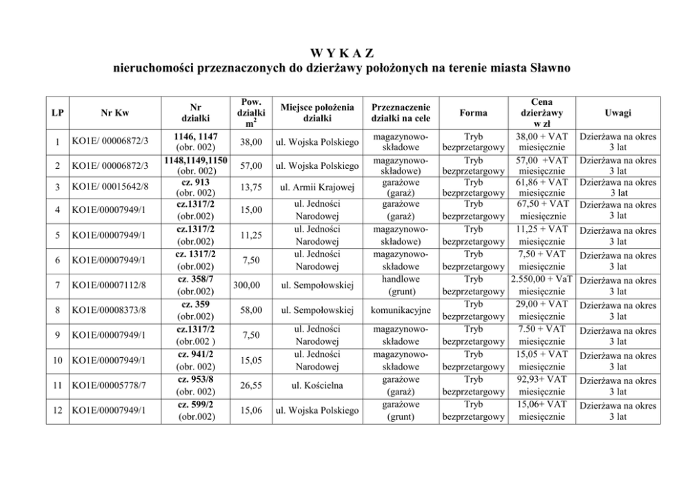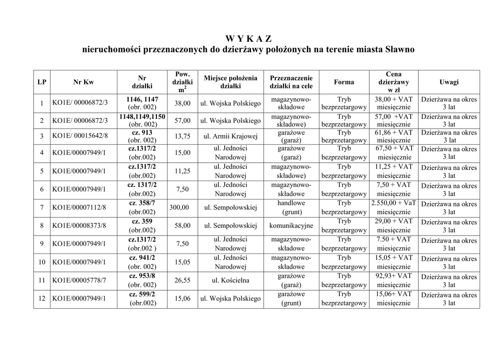 W Y K A Z nieruchomości przeznaczonych do dzierżawy położonych
