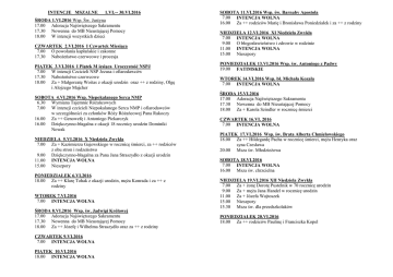 ZALNE INTENCJE MSZALNE 1.VI.-- 30.VI.2016 ŚRODA 1.VI.2016 Wsp. Św. Justyna 17.00 Adoracja Najświętszego Sakramentu 17.30 Nowenna do MB Nieustającej Pomocy 18.00 W intencji wszystkich dzieci CZWARTEK 2.VI.2016 I Czwartek Miesiąca 7.00 O powołania kapłańskie i zakonne 17.30 Nabożeństwo czerwcowe i procesja PIĄTEK 3.VI.2016 I Piątek M iesiąca Uroczystość NSPJ 7.00 W intencji Czcicieli NSP Jezusa i ofiarodawców 17.30 Nabożeństwo czerwcowe 18.00 Za + Małgorzatę Woitas z okazji urodzin oraz ++ z rodziny, Olgę i Alojzego Majcher SOBOTA 4.VI.2016 Wsp. Niepokalanego Serca NMP 6.30 Wymiana Tajemnic Różańcowych 7.00 W intencji czcicieli Niepokalanego Serca NMP i ofiarodawców w szczególności za członków Róży Różańcowej Pana Rakoczy 16.00 Za ++ Genowefę i Antoniego Piekarczyk 16.00 Dziękczynno-błagalna z okazji 18 rocznicy urodzin Dominiki Nowak NIEDZIELA 5.VI.2016 X Niedziela Zwykła 7.00 Za + Kazimierza Gajewskiego w rocznicę śmierci, za ++ rodziców z obu stron i rodzeństwo 9.00 Dziękczynno-błagalna za Pana Jana Straszydło z okazji urodzin 11.00 INTENCJA WOLNA 15.00 Nieszpory PONIEDZIAŁEK 6.VI.2016 18.00 Za ++ Klarę Tohak z okazji urodzin, męża Konrada i za ++ z rodziny WTOREK 7.VI.2016 7.00 INTENCJA WOLNA ŚRODA 8.VI.2016 Wsp. św. Jadwigi Królowej 17.00 Adoracja Najświętszego Sakramentu 17.30 Nowenna do MB Nieustającej Pomocy 18.00 Za ++ Józefę i Wilhelma Straszydło oraz za ++ z rodziny CZWARTEK 9.VI.2016 7.00 INTENCJA WOLNA PIĄTEK 10.VI.2016 18.00 INTENCJA WOLNA SOBOTA 11.VI.2016 Wsp. św. Barnaby Apostoła 7.00 INTENCJA WOLNA 16.00 Za ++ rodziców Marię i Bronisława Poniedziałek i za ++ z rodziny NIEDZIELA 12.VI.2016 XI Niedziela Zwykła 7.00 INTENCJA WOLNA 9.00 O błogosławieństwo i zdrowie w rodzinie 11.00 INTENCJA WOLNA 15.00 Nieszpory PONIEDZIAŁEK 13.VI.2016 Wsp. św. Antoniego z Padwy 19.00 FATIMSKIE WTOREK 14.VI.2016 Wsp. bł. Michała Kozala 7.00 INTENCJA WOLNA ŚRODA 15.VI.2016 17.00 Adoracja Najświętszego Sakramentu 17.30 Nowenna do MB Nieustającej Pomocy 18.00 Za + Karola Szindler w rocznicę śmierci CZWARTEK 16.VI. 2016 7.00 INTENCJA WOLNA PIĄTEK 17.VI.2016 Wsp. św. Brata Alberta Chmielowskiego 18.00 Za ++ Hildegardę Pacha w rocznicę śmierci, męża Henryka oraz syna Czesława 20.00 Msza św. Młodzieżowa SOBOTA 18.VI.2016 7.00 INTENCJA WOLNA 16.00 Msza św. chrzcielna NIEDZIELA 19.VI.2016 XII Niedziela Zwykła 7.00 Za + żonę Dorotę Pustelnik w 70 rocznicę urodzin 9.00 Za + męża Jana Handel w rocznicę urodzin 11.00 Za + Józefa Wojtoszek 15.00 Nieszpory 15.30 Msza św. dla przedszkolaków PONIEDZIAŁEK 20.VI.2016 18.00 Za ++ rodziców Paulinę i Franciszka Kopel WTOREK 21.VI.2016 Wsp .św Alojzego Gonzagi 7.00 INTENCJA WOLNA ŚRODA 22.VI.2016 17.00 Adoracja Najświętszego Sakramentu 17.30 Nowenna do MB Nieustającej Pomocy 18.00 Za + Martę Gałązka z okazji urodzin CZWARTEK 23.VI.2016 7.00 Za + Joannę Jurecki 15.00 Zakończenie Szkoły Podstawowej dla klas VI PIĄTEK 24.VI.2016 Uroczystość narodzenia św. Jana Chrzciciela 8.00 Zakończenie roku szkolnego 18.00 Za ++ Rozalię Kałus w rocznicę śmierci, męża Wiktora i rodziców z obu stron SOBOTA 25.VI.2016 7.00 INTENCJA WOLNA 12.00 Ślub Rzymski Szymura Klęczek 16.00 Dziękczynno-błagalna z okazji 70 rocznicy urodzin Alojzego Gajda NIEDZIELA 26.VI.2016 XIII Niedziela Zwykła 7.00 INTENCJA WOLNA 9.00 INTENCJA WOLNA 11.00 Dziękczynno-błagalna z okazji 90 rocznicy urodzin Klary Pojda i o błogosławieństwo dla rodziny 15.00 Nieszpory PONIEDZIAŁEK 27.VI.2016 18.00 Za ++ Agnieszkę Szymura z okazji urodzin i męża Ludwika WTOREK 28.VI.2016 Wsp. św. Ireneusza bpa i męczennika 7.00 Za ++ Klarę i Franciszka ŚRODA 29.VI.2016 Uroczystość św. Apostołów Piotra i Pawła 17.00 Adoracja Najświętszego Sakramentu 17.30 Nowenna do MB Nieustającej Pomocy 18.00 Za ++ Franciszka Kaczmarczyk, żony Annę i Gertrudę oraz teściów Pawła i Hildegardę Otremba CZWARTEK 30.VI. 2016 I Czwartek Miesiąca 7.00 O powołania kapłańskie i zakonne