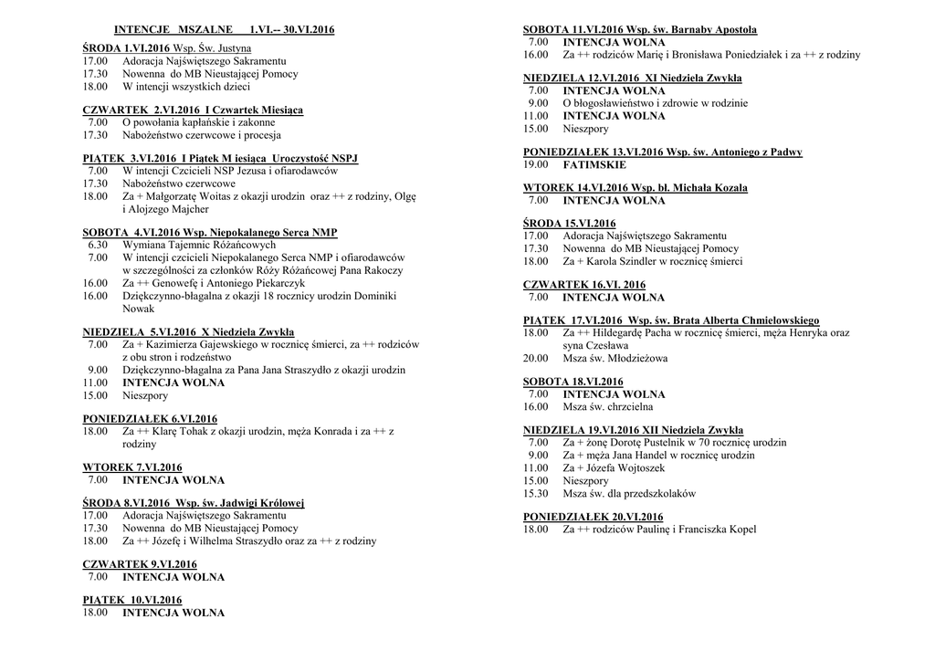 Intencje mszalne - czerwiec 2016 r.