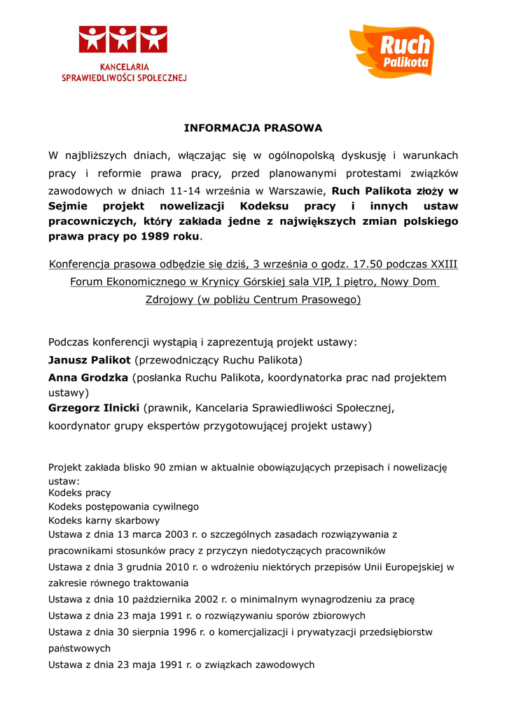 INFORMACJA PRASOWA W najbliższych dniach, włączając się w ogólnopolską dyskusję i warunkach pracy i reformie prawa pracy, przed planowanymi protestami związków zawodowych w dniach 11-14 września w Warszawie, Ruch Palikota złoży w Sejmie projekt nowelizacji Kodeksu pracy i innych ustaw pracowniczych, który zakłada jedne z największych zmian polskiego prawa pracy po 1989 roku. Konferencja prasowa odbędzie się dziś, 3 września o godz. 17.50 podczas XXIII Forum Ekonomicznego w Krynicy Górskiej sala VIP, I piętro, Nowy Dom Zdrojowy (w pobliżu Centrum Prasowego) Podczas konferencji wystąpią i zaprezentują projekt ustawy: Janusz Palikot (przewodniczący Ruchu Palikota) Anna Grodzka (posłanka Ruchu Palikota, koordynatorka prac nad projektem ustawy) Grzegorz Ilnicki (prawnik, Kancelaria Sprawiedliwości Społecznej, koordynator grupy ekspertów przygotowującej projekt ustawy) Projekt zakłada blisko 90 zmian w aktualnie obowiązujących przepisach i nowelizację ustaw: Kodeks pracy Kodeks postępowania cywilnego Kodeks karny skarbowy Ustawa z dnia 13 marca 2003 r. o szczególnych zasadach rozwiązywania z pracownikami stosunków pracy z przyczyn niedotyczących pracowników Ustawa z dnia 3 grudnia 2010 r. o wdrożeniu niektórych przepisów Unii Europejskiej w zakresie równego traktowania Ustawa z dnia 10 października 2002 r. o minimalnym wynagrodzeniu za pracę Ustawa z dnia 23 maja 1991 r. o rozwiązywaniu sporów zbiorowych Ustawa z dnia 30 sierpnia 1996 r. o komercjalizacji i prywatyzacji przedsiębiorstw państwowych Ustawa z dnia 23 maja 1991 r. o związkach zawodowych Najważniejsze postulaty: Przeciwdziałanie umowom śmieciowym - Uściślenie definicji stosunku pracy, jako lepsza ochrona przed zatrudnieniem śmieciowym oraz wprowadzenie domniemania zatrudnienia w ramach stosunku pracy, dla osób, które wykonywały pracę bez umowy na piśmie. - Pracownik, który ujawnił przed właściwym organem lub sądem pracy zatrudnienie na czarno nie będzie podlegać odpowiedzialność karnoskarbowej. Ochrona stabilności pracy - Wprowadzenie zasady, że druga umowa na czas określony lub praca wykonywana w sposób ciągły przez 24 miesiące, to stosunek pracy zawarty na czas nieokreślony. - Wprowadzenie obowiązku uzasadnienia oraz prawa do sądowej kontroli prawidłowości i zasadności wypowiedzenia wszystkich typów umów poza umową na okres próby. - Odszkodowania dla niesłusznie zwalnianych pracowników wzrosną nawet do 12krotności ich miesięcznego wynagrodzenia. Lepsza ochrona przed dyskryminacją - Uszczegółowienie definicji dyskryminacji. - Szersze objęcie ochroną przed dyskryminacją osób pracujących na umowach cywilnoprawnych. - Ułatwienia w dochodzeniu swoich praw dla ofiar mobbingu w pracy. - Przyznanie nowych uprawnień organizacjom pozarządowym, które wspierają osoby dotknięte dyskryminacją w pracy polegających na możliwości reprezentowaniu tych osób przed sądami powszechnymi. Głęboka reforma związków zawodowych - Wprowadzenie obowiązku uzasadnienia konsultacji wszystkich rodzajów umów o pracę, za wyjątkiem umowy na okres próby, z reprezentującą pracownika organizacją związkową. - Ograniczenie prawa do etatu związkowego w przypadku każdej osoby – tylko do połowy jej czasu pracy. - Ograniczenia w dopuszczalności sprawowania funkcji związkowej przez dwie kadencje lub 10 lat z rzędu. - Wzmocnienie prawa do strajku.