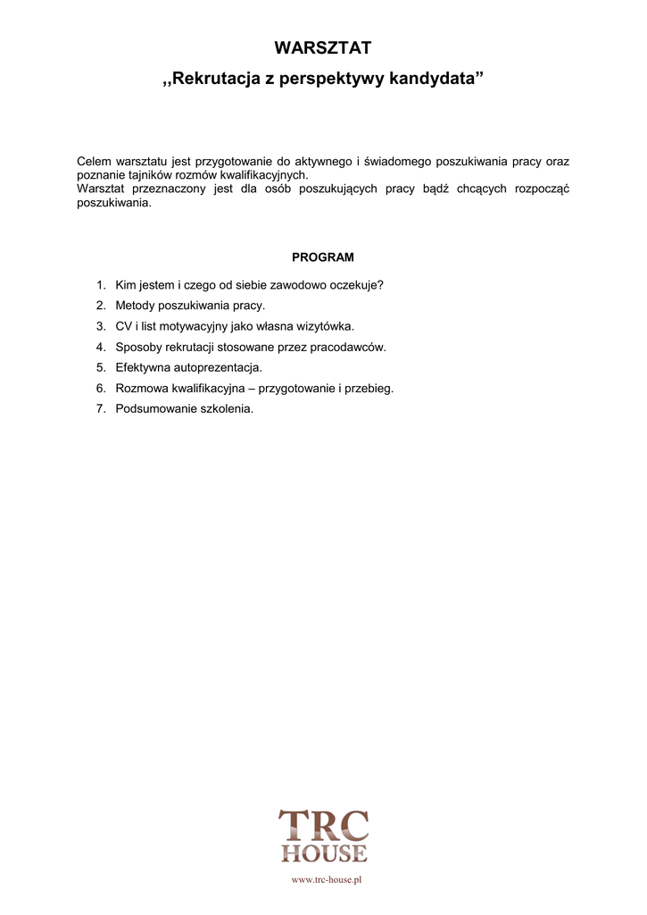 WARSZTAT ,,Rekrutacja z perspektywy kandydata” Celem warsztatu jest przygotowanie do aktywnego i świadomego poszukiwania pracy oraz poznanie tajników rozmów kwalifikacyjnych. Warsztat przeznaczony jest dla osób poszukujących pracy bądź chcących rozpocząć poszukiwania. PROGRAM 1. Kim jestem i czego od siebie zawodowo oczekuje? 2. Metody poszukiwania pracy. 3. CV i list motywacyjny jako własna wizytówka. 4. Sposoby rekrutacji stosowane przez pracodawców. 5. Efektywna autoprezentacja. 6. Rozmowa kwalifikacyjna – przygotowanie i przebieg. 7. Podsumowanie szkolenia. www.trc-house.pl Formularz Zgłoszeniowy Zgłoszenie uczestnictwa w szkoleniu prosimy o przesłanie na adres [email protected] Rekrutacja z perspektywy kandydata Termin Miejsce Cena 09.02.2016 r. 9:00-14:00 Łuków, ul. Warszawska 24 50 zł brutto Imię i nazwisko Adres e-mail Telefon Stanowisko Instytucja Warunki uczestnictwa: 1. Organizatorem szkolenia jest TRC House z siedzibą w Łukowie. 2. Cena szkolenia obejmuje: udział w szkoleniu, materiały szkoleniowe, wydanie certyfikatu udziału w szkoleniu, serwis kawowy 3. Warunkiem udziału w szkoleniu jest otrzymanie przez TRC House. 4. Opłatę za szkolenie należy dokonać przelewem po otrzymaniu potwierdzenia od organizatora. W tytule przelewu należy wpisać nazwę szkolenia oraz nazwisko uczestnika TRC House Maria Michalczuk ul. Stodolna 20/45, 21-400 Łuków Bank BGŻ BNP Paribas S.A. 302030 0045 1110 0000 0237 4610 5. O przyjęciu na szkolenie decyduje kolejność zgłoszeń. 6. W przypadku odwołania szkolenia przez TRC House, wszelkie kwoty wpłacone tytułem udziału w szkoleniu zostaną zwrócone. 7. TRC House zastrzega sobie prawo do zmiany miejsca i terminu szkolenia po uprzednim poinformowaniu uczestnika. ………………….. Podpis www.trc-house.pl