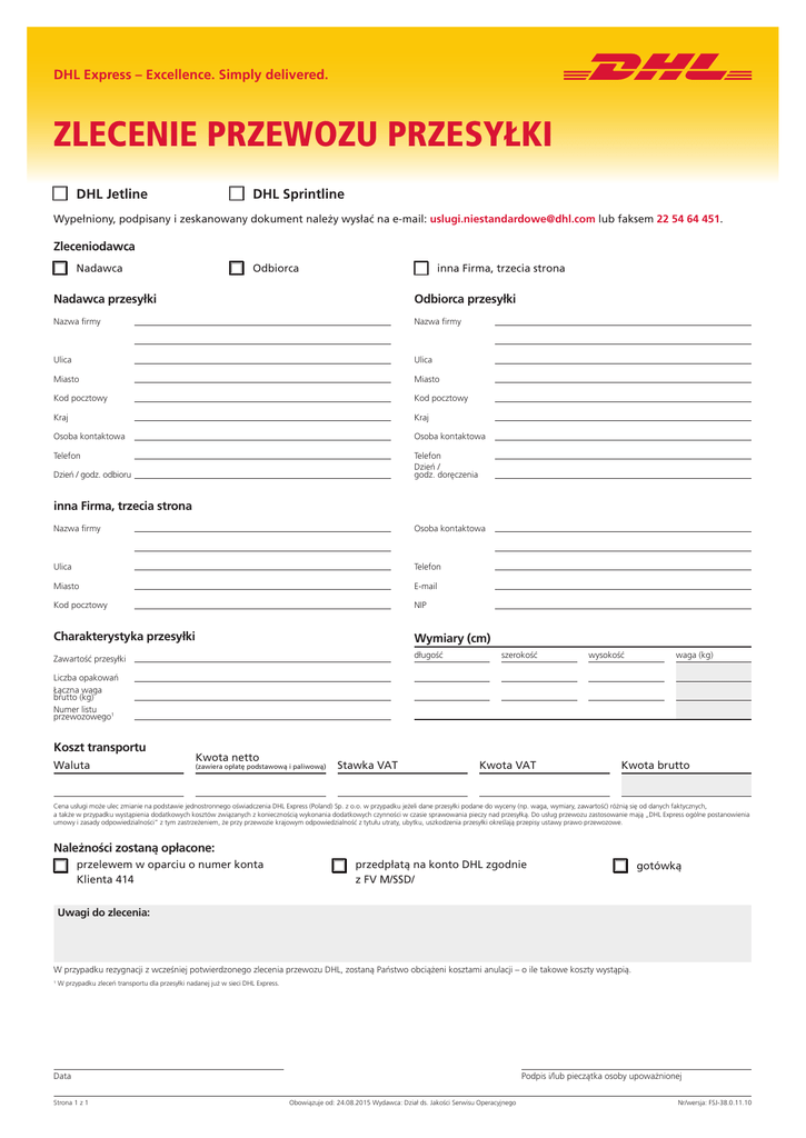 DHL Express – Excellence. Simply delivered. ZLECENIE PRZEWOZU PRZESYŁKI DHL Jetline DHL Sprintline Wypełniony, podpisany i zeskanowany dokument należy wysłać na e-mail: [email protected] lub faksem 22 54 64 451. Zleceniodawca Nadawca Odbiorca inna Firma, trzecia strona Nadawca przesyłki Odbiorca przesyłki Nazwa firmy Nazwa firmy Ulica Ulica Miasto Miasto Kod pocztowy Kod pocztowy Kraj Kraj Osoba kontaktowa Osoba kontaktowa Telefon Telefon Dzień / godz. doręczenia Dzień / godz. odbioru inna Firma, trzecia strona Nazwa firmy Osoba kontaktowa Ulica Telefon Miasto E-mail Kod pocztowy NIP Charakterystyka przesyłki Wymiary (cm) Zawartość przesyłki długość szerokość wysokość waga (kg) Liczba opakowań Łączna waga brutto (kg) Numer listu przewozowego1 Koszt transportu Waluta Kwota netto (zawiera opłatę podstawową i paliwową) Stawka VAT Kwota VAT Kwota brutto Cena usługi może ulec zmianie na podstawie jednostronnego oświadczenia DHL Express (Poland) Sp. z o.o. w przypadku jeżeli dane przesyłki podane do wyceny (np. waga, wymiary, zawartość) różnią się od danych faktycznych, a także w przypadku wystąpienia dodatkowych kosztów związanych z koniecznością wykonania dodatkowych czynności w czasie sprawowania pieczy nad przesyłką. Do usług przewozu zastosowanie mają „DHL Express ogólne postanowienia umowy i zasady odpowiedzialności” z tym zastrzeżeniem, że przy przewozie krajowym odpowiedzialność z tytułu utraty, ubytku, uszkodzenia przesyłki określają przepisy ustawy prawo przewozowe. Należności zostaną opłacone: przelewem w oparciu o numer konta Klienta 414 przedpłatą na konto DHL zgodnie z FV M/SSD/ gotówką Uwagi do zlecenia: W przypadku rezygnacji z wcześniej potwierdzonego zlecenia przewozu DHL, zostaną Państwo obciążeni kosztami anulacji – o ile takowe koszty wystąpią. 1 W przypadku zleceń transportu dla przesyłki nadanej już w sieci DHL Express. Data Strona 1 z 1 Podpis i/lub pieczątka osoby upoważnionej Obowiązuje od: 24.08.2015 Wydawca: Dział ds. Jakości Serwisu Operacyjnego Nr/wersja: FSJ-38.0.11.10