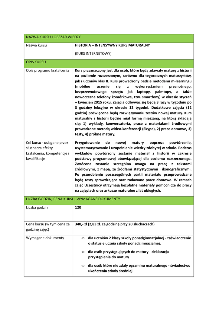 NAZWA KURSU I OBSZAR WIEDZY Nazwa kursu HISTORIA – INTENSYWNY KURS MATURALNY (KURS INTERNETOWY) OPIS KURSU Opis programu kształcenia Kurs przeznaczony jest dla osób, które będą zdawały maturę z historii na poziomie rozszerzonym, zarówno dla tegorocznych maturzystów, jak i uczniów klas II. Kurs prowadzony będzie metodami m-learningu (mobilne uczenie się z wykorzystaniem przenośnego, bezprzewodowego sprzętu jak laptopy, palmtopy, a także nowoczesne telefony komórkowe, tzw. smartfony) w okresie styczeń – kwiecień 2015 roku. Zajęcia odbywać się będą 3 razy w tygodniu po 3 godziny lekcyjne w okresie 12 tygodni. Dodatkowe zajęcia (12 godzin) poświęcone będą rozwiązywaniu testów nowej matury. Kurs maturalny z historii będzie miał formę mieszaną, na którą składają się: 1) wykłady, konwersatoria, prace z materiałami źródłowymi prowadzone metodą wideo-konferencji (Skype), 2) prace domowe, 3) testy, 4) próbne matury. Cel kursu - osiągane przez słuchacza efekty kształcenia, kompetencje i kwalifikacje Przygotowanie do nowej matury poprzez: powtórzenie, usystematyzowanie i uzupełnienie wiedzy zdobytej w szkole. Podczas wykładów powtórzony zostanie materiał z historii w zakresie podstawy programowej obowiązującej dla poziomu rozszerzonego. Zwrócona zostanie szczególna uwaga na pracę z tekstami źródłowymi, z mapą, ze źródłami statystycznymi i ikonograficznymi. Po przerobieniu poszczególnych partii materiału przeprowadzane będą testy sprawdzające oraz zadawane prace domowe. W ramach zajęć Uczestnicy otrzymają bezpłatne materiały pomocnicze do pracy na zajęciach oraz arkusze maturalne z lat ubiegłych. LICZBA GODZIN, CENA KURSU, WYMAGANE DOKUMENTY Liczba godzin 120 Cena kursu (w tym cena za godzinę zajęć) 340,- zł (2,83 zł. za godzinę przy 20 słuchaczach) Wymagane dokumenty • dla uczniów 2 klasy szkoły ponadgimnazjalnej - zaświadczenie o statusie ucznia szkoły ponadgimnazjalnej. • dla osób przystępujących do matury - deklaracja przystąpienia do matury • dla osób które nie zdały egzaminu maturalnego - świadectwo ukończenia szkoły średniej. DANE KONTAKTOWE Instytut [email protected] al. Armii Krajowej 36a (dojazd od ul. Worcella) 42-200 Częstochowa tel./fax. (+48) 34 361 41 14 lub (+48) 34 361 31 20 wew. 201 e-mail: [email protected] facebook: Instytut Historii Terminy odbywania zajęć styczeń-kwiecień 2015 r. Miejsce odbywania zajęć al. Armii Krajowej 36a (dojazd od ul. Worcella) 42-200 Częstochowa Autor kursu dr Norbert Morawiec