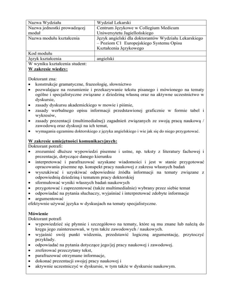 Nazwa Wydziału Nazwa jednostki prowadzącej moduł Nazwa modułu kształcenia Kod modułu Język kształcenia W wyniku kształcenia student: W zakresie wiedzy: Wydział Lekarski Centrum Językowe w Collegium Medicum Uniwersytetu Jagiellońskiego Język angielski dla doktorantów Wydziału Lekarskiego – Poziom C1 Europejskiego Systemu Opisu Kształcenia Językowego angielski Doktorant zna: konstrukcje gramatyczne, frazeologię, słownictwo pozwalające na rozumienie i przekazywanie tekstu pisanego i mówionego na tematy ogólne i specjalistyczne związane z dziedziną własną oraz na aktywne uczestnictwo w dyskursie, zasady dyskursu akademickiego w mowie i piśmie, zasady werbalnego opisu informacji przedstawionej graficznie w formie tabel i wykresów, zasady prezentacji (multimedialnej) zagadnień związanych ze swoją pracą naukową / zawodową oraz dyskusji na ich temat, wymagania egzaminu doktorskiego z języka angielskiego i wie jak się do niego przygotować. W zakresie umiejętności komunikacyjnych: Doktorant potrafi: zrozumieć dłuższe wypowiedzi pisemne i ustne, np. teksty z literatury fachowej i prezentacje, dotyczące danego kierunku interpretować i parafrazować uzyskane wiadomości i jest w stanie przygotować opracowania pisemne np. konspekt pracy naukowej z zakresu własnych badań wyszukiwać i uzyskiwać odpowiednie źródła informacji na tematy związane z odpowiednią dziedziną i tematem pracy doktorskiej sformułować wyniki własnych badań naukowych przygotować i zaprezentować (także multimedialnie) wybrany przez siebie temat odpowiadać na pytania słuchaczy, wyjaśniać i interpretować zdobyte informacje argumentować efektywnie używać języka w dyskusjach na tematy specjalistyczne. Mówienie Doktorant potrafi wypowiedzieć się płynnie i szczegółowo na tematy, które są mu znane lub należą do kręgu jego zainteresowań, w tym także zawodowych / naukowych. wyjaśnić swój punkt widzenia, przedstawić logiczną argumentację, przytoczyć przykłady. odpowiadać na pytania dotyczące jego/jej pracy naukowej i zawodowej. zreferować przeczytany tekst, parafrazować otrzymane informacje, dokonać prezentacji swojej pracy naukowej i aktywnie uczestniczyć w dyskursie, w tym także w dyskursie naukowym. Słuchanie Doktorant rozumie skomplikowane teksty, dotyczące zagadnień z dziedziny specjalizacji (treści wykładów, wystąpień i raportów, akademickich i zawodowych) Pisanie Doktorant potrafi: ● wypełniać dokumentację (raporty), ● pisać listy formalne, faksy, e-maile, ● dokonać syntezy przeczytanej lub wysłuchanej informacji, ● napisać tekst akademicki (np. streszczenie, sprawozdanie, konspekt pracy naukowej). Czytanie Doktorant rozumie szczegółowo ● artykuły i inne teksty pisane na tematy konkretne i abstrakcyjne, w tym oryginalne artykuły naukowe oraz teksty związane z jego/jej pracą zawodową. ● korespondencję związaną z własnymi zainteresowaniami oraz dotyczącą pracy naukowej / zawodowej ● instrukcje i raporty dotyczące spraw naukowych. W zakresie kompetencji społecznych: Doktorant potrafi : korzystać z literatury fachowej anglojęzycznej oraz z technologii informacyjnych do wyszukiwania informacji pracować w zespole (zespołowego rozwiązywania problemów), jak również działać autonomicznie. organizować swój proces uczenia się. Treści kształcenia: I semestr 1. Przedstawianie się w nowej grupie lub zespole, własne zainteresowania ogólne, wstępne przedstawienie własnych zainteresowań zawodowych i naukowych. 2. Przygotowanie do samodzielnej prezentacji w języku angielskim na tematy związane z zakresem studiów i prowadzonych przez siebie badań naukowych. 3. Liczby, statystyka, wykresy i diagramy. Pozajęzykowe aspekty prezentacji konferencyjnej. 4. Zagadnienia dotyczące planowania kariery naukowej: - życiorys (resume, CV) - przygotowanie do rozmowy o pracę. 5. Komunikowanie się ze środowiskiem naukowym. Środki komunikacji w świecie naukowym. Pisanie recenzji krytycznej (critical review). 6. Planowanie eksperymentu: zbiór danych, pomiary, opis materiałów i zjawisk. 7. Opis eksperymentu: proces, ewaluacja, trudności. 8. Prezentacja danych: analiza statystyczna, podsumowanie w formie wizualnej, opis pisemny danych wizualnych i diagramów 9. Ćwiczenia w zakresie słownictwa akademickiego oraz struktur występujących w tekstach naukowych (cechy języka akademickiego) 10. Podsumowanie semestru, powtórzenie wprowadzonych środków językowych. Łącznie 30 godz. lektoratu II semestr 1. Zainteresowania naukowe (przedstawienie aktualnego stanu własnych badań naukowych związanych z doktoratem). 2. Cel rozprawy doktorskiej. 3. Temat rozprawy, materiał i metody, (badania naukowe). 4. Opis materiałów i metodyki badania 5. Prezentacja uzyskanych wyników bądź spodziewanych wyników. 6. Pisanie odniesień do innych publikacji, cytowanie innych prac. 7. Pisanie bibliografii pracy naukowej 8. Wstęp do pracy naukowej. 9. Publikacje własne. 10. Uczestnictwo w konferencjach naukowych. 11. Postery i prezentacje na konferencjach naukowych. 12. Praca zawodowa 13. Spędzanie czasu wolnego. 13. Zainteresowania pozanaukowe doktoranta. 14. Oprowadzanie naukowców z zagranicy po Krakowie. 15. Ćwiczenia w zakresie akademickiej leksyki i struktur gramatycznych Łącznie 30 godz. lektoratu Wykaz literatury podstawowej i uzupełniającej, obowiązującej do zaliczenia danego modułu Literatura podstawowa: 1. Armer. 2011. Cambridge English for Scientists, (CUP). 2. O’Connel, S. 2006. Focus on IELTS Foundation. Pearson Ltd 3. McCarthy, M. 1999. Academic Vocabulary in Use, Cambridge C 4. Powell, M. 2011. Dynamic Presentations, Cambridge University Press 5. Materiały własne i zgromadzone przez lektora. Literatura uzupełniająca: 6. Wallwork, A. 2013. English for Academic Research: Grammar exercises. London: Springer. 7. Wallwork, A. 2013. English for Academic Research: Writing Exercises. Lon