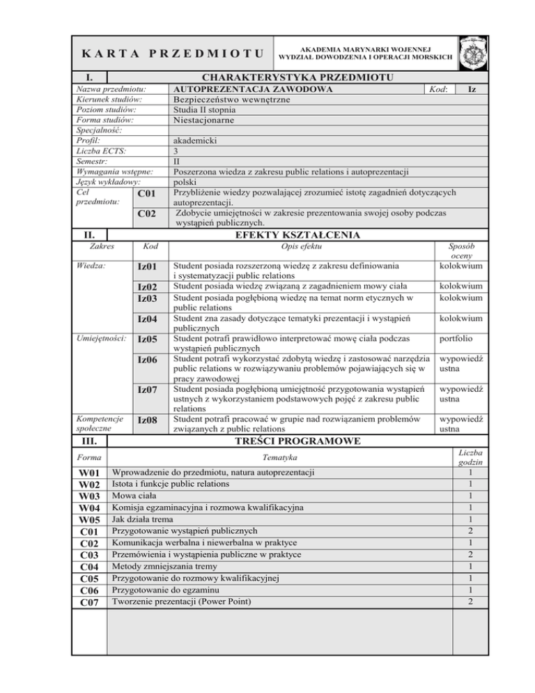 KARTA PRZEDMIOTU I. CHARAKTERYSTYKA PRZEDMIOTU Nazwa przedmiotu: Kierunek studiów: Poziom studiów: Forma studiów: Specjalność: Profil: Liczba ECTS: Semestr: Wymagania wstępne: Język wykładowy: Cel C01 przedmiotu: C02 II. Wiedza: Kod Iz01 Iz02 Iz03 Iz04 Umiejętności: Iz05 Iz06 Iz07 Kompetencje społeczne Forma W01 W02 W03 W04 W05 C01 C02 C03 C04 C05 C06 C07 AUTOPREZENTACJA ZAWODOWA Bezpieczeństwo wewnętrzne Studia II stopnia Niestacjonarne Kod: Iz akademicki 3 II Poszerzona wiedza z zakresu public relations i autoprezentacji polski Przybliżenie wiedzy pozwalającej zrozumieć istotę zagadnień dotyczących autoprezentacji. Zdobycie umiejętności w zakresie prezentowania swojej osoby podczas wystąpień publicznych. EFEKTY KSZTAŁCENIA Zakres III. AKADEMIA MARYNARKI WOJENNEJ WYDZIAŁ DOWODZENIA I OPERACJI MORSKICH Iz08 Opis efektu Sposób oceny Student posiada rozszerzoną wiedzę z zakresu definiowania i systematyzacji public relations Student posiada wiedzę związaną z zagadnieniem mowy ciała Student posiada pogłębioną wiedzę na temat norm etycznych w public relations Student zna zasady dotyczące tematyki prezentacji i wystąpień publicznych Student potrafi prawidłowo interpretować mowę ciała podczas wystąpień publicznych Student potrafi wykorzystać zdobytą wiedzę i zastosować narzędzia public relations w rozwiązywaniu problemów pojawiających się w pracy zawodowej Student posiada pogłębioną umiejętność przygotowania wystąpień ustnych z wykorzystaniem podstawowych pojęć z zakresu public relations Student potrafi pracować w grupie nad rozwiązaniem problemów związanych z public relations kolokwium kolokwium kolokwium kolokwium portfolio wypowiedź ustna wypowiedź ustna wypowiedź ustna TREŚCI PROGRAMOWE Tematyka Wprowadzenie do przedmiotu, natura autoprezentacji Istota i funkcje public relations Mowa ciała Komisja egzaminacyjna i rozmowa kwalifikacyjna Jak działa trema Przygotowanie wystąpień publicznych Komunikacja werbalna i niewerbalna w praktyce Przemówienia i wystąpienia publiczne w praktyce Metody zmniejszania tremy Przygotowanie do rozmowy kwalifikacyjnej Przygotowanie do egzaminu Tworzenie prezentacji (Power Point) Liczba godzin 1 1 1 1 1 2 1 2 1 1 1 2 IV. KORELACJA EFEKTÓW KSZTAŁCENIA Forma W01 W02 W03 W04 W05 C01 C02 C03 C04 C05 C06 C07 V. Kod efektu przedmiotu Iz01, Iz02, Iz01, Iz03, Iz01, Iz02, Iz04, Iz05, Iz06, Iz02, Iz04, Iz05, Iz06, Iz02, Iz04, Iz05, Iz06, Iz02, Iz04, Iz05, Iz06, Iz08 Iz02, Iz04, Iz05, Iz06, Iz08 Iz02, Iz04, Iz05, Iz06, Iz08 Iz02, Iz04, Iz05, Iz06, Iz08 Iz02, Iz04, Iz05, Iz06, Iz08 Iz02, Iz04, Iz05, Iz06, Iz08 Iz04, Iz06, Iz08 Kod efektu kierunkowego BW2_W01 BW2_W01 BW2_U06 BW2_U06 BW2_U06 BW2_U06, BW2_K02 BW2_U06, BW2_K02 BW2_U06, BW2_K02 BW2_U06, BW2_K02 BW2_U06, BW2_K02 BW2_U06, BW2_K02 BW2_U06, BW2_K02 Kod efektu obszarowego S2A_W01 S2A_W01 S2A_U06 S2A_U06 S2A_U06 S2A_U06, S2A_K02 S2A_U06, S2A_K02 S2A_U06, S2A_K02 S2A_U06, S2A_K02 S2A_U06, S2A_K02 S2A_U06, S2A_K02 S2A_U06, S2A_K02 NAKŁAD PRACY STUDENTA Forma aktywności Wykład Ćwiczenia Seminaria Konwersatoria Konsultacje Rozliczenie rygorów przedmiotu Przygotowanie do ćwiczeń Opanowanie informacji Przygotowanie do rozliczenia rygorów RAZEM VI. Liczba godzin kontaktowych 5 10 Liczba godzin niekontaktowych Razem liczba godzin Pkt. ECTS 75 3 15 30 20 15 10 45 METODY DYDAKTYCZNE Wykład z prezentacją multimedialną Ćwiczenia audytoryjne: dyskusja Ćwiczenia audytoryjne: praca w grupach 1. 2. 3. VII. FORMA ZALICZENIA PRZEDMIOTU Rygor Zaliczenie Kryteria składowe Średnia ze sprawdzianów na ćwiczeniach Ocena z kolokwium Ocena z przygotowania i aktywności na ćwiczeniach Waga 0,2 0,6 0,2 Egzamin VIII. 1. 2. 3. 4. LITERATURA PODSTAWOWA I UZUPEŁNIAJĄCA OBOWIĄZKOWA Wojcik K., Public relations. Wiarygodny dialog z otoczeniem., Placet, Warszawa 2010 Rozwadowska B., Public Relations. Teoria, praktyka, perspektywy., Studio Emka, Warszawa 2009 Pease A. i B., Mowa Ciała, Dom Wydawniczy REBIS, Poznań 2011 Blein B., Sztuka Prezentacji i Wystąpień Publicznych, Wydawnictwo RM, Warszawa 2010 UZUPEŁNIAJĄCA 1. 2. Leary M., Wywieranie wrażenia na innych. O sztuce Autoprezentacji, Gdańskie Wydawnictwo Psychologiczne, Gdańsk 2010 Collins A., Mowa ciała. Co znaczą nasze gesty?, Oficyna Wydawnicza RYTM, Warszawa 2002 IX. PROWADZĄCY PRZEDMIOT Stopień, Imię i nazwisko adres e-mail dr Małgorzata Porębska [email protected]