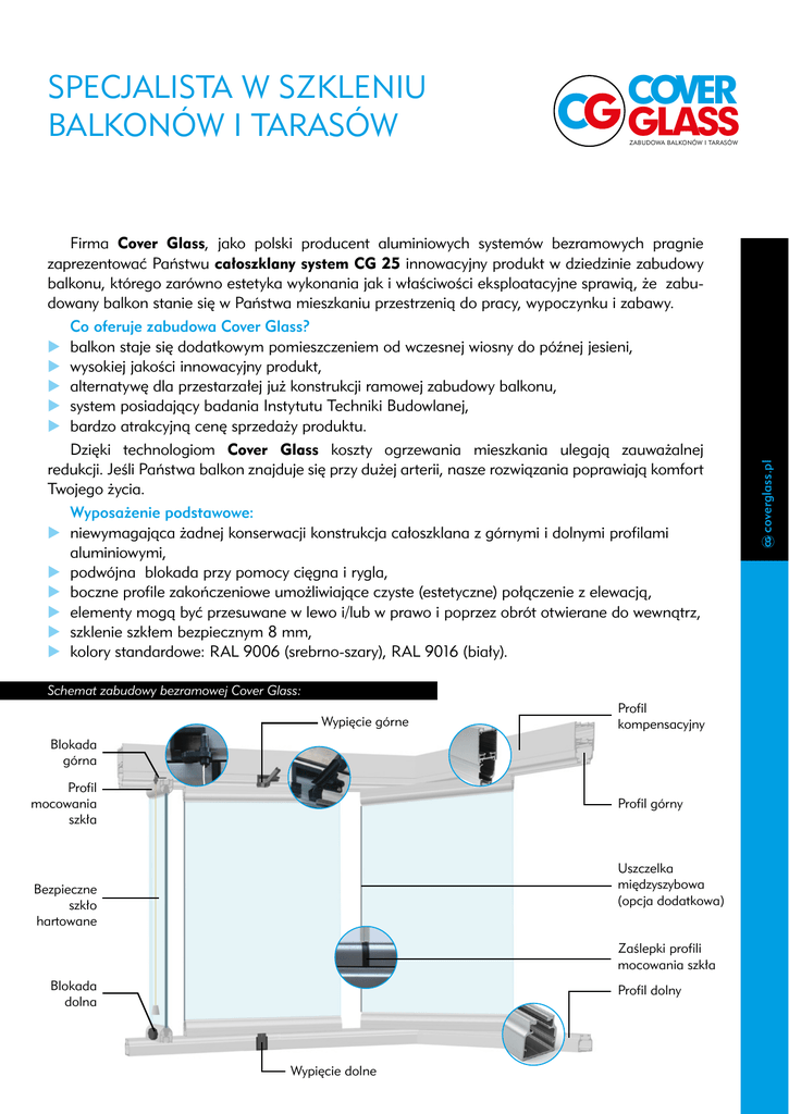 COVER GLASS ZABUDOWA BALKONÓW I TARASÓW Firma Cover Glass, jako polski producent aluminiowych systemów bezramowych pragnie zaprezentować Państwu całoszklany system CG 25 innowacyjny produkt w dziedzinie zabudowy balkonu, którego zarówno estetyka wykonania jak i właściwości eksploatacyjne sprawią, że zabudowany balkon stanie się w Państwa mieszkaniu przestrzenią do pracy, wypoczynku i zabawy. Co oferuje zabudowa Cover Glass? balkon staje się dodatkowym pomieszczeniem od wczesnej wiosny do późnej jesieni, wysokiej jakości innowacyjny produkt, alternatywę dla przestarzałej już konstrukcji ramowej zabudowy balkonu, system posiadający badania Instytutu Techniki Budowlanej, bardzo atrakcyjną cenę sprzedaży produktu. Dzięki technologiom Cover Glass koszty ogrzewania mieszkania ulegają zauważalnej redukcji. Jeśli Państwa balkon znajduje się przy dużej arterii, nasze rozwiązania poprawiają komfort Twojego życia. Wyposażenie podstawowe: niewymagająca żadnej konserwacji konstrukcja całoszklana z górnymi i dolnymi profilami aluminiowymi, podwójna blokada przy pomocy cięgna i rygla, boczne profile zakończeniowe umożliwiające czyste (estetyczne) połączenie z elewacją, elementy mogą być przesuwane w lewo i/lub w prawo i poprzez obrót otwierane do wewnątrz, szklenie szkłem bezpiecznym 8 mm, kolory standardowe: RAL 9006 (srebrno-szary), RAL 9016 (biały). Schemat zabudowy bezramowej Cover Glass: Wypięcie górne Profil kompensacyjny Blokada górna Profil mocowania szkła Profil górny Uszczelka międzyszybowa (opcja dodatkowa) Bezpieczne szkło hartowane Zaślepki profili mocowania szkła Blokada dolna Profil dolny Wypięcie dolne coverglass.pl SPECJALISTA W SZKLENIU BALKONÓW I TARASÓW OPIS SYSTEMU COVER GLASS. KONSTRUKCJE CAŁOSZKLANE Obszary zastosowań: • Balkony • Tarasy • Loggie • Przedsionki • Siedliska otwarte • Budynki wielorodzinne • Budynki jednorodzinne coverglass.pl Technika System • System transparentnego oszklenia balkonów, składający się z ruchomych skrzydeł ze szkła bezpiecznego hartowanego (ESG). • Szyby osadzone są w górnych i dolnych profilach aluminiowych. • Oba zewnętrzne skrzydła skrajne mogą być wykonane jako skrzydła obrotowe. • Pozostałe skrzydła wykonane są jako skrzydła przesuwno – obrotowe, które mogą być rozsuwane na jedną lub dwie strony, a potem otwierane przez obrót. • System oszklenia jest „zamknięty” w obrębie ciągłej ościeżnicy, co oznacza, że nie są konieczne żadne wiążące się z dużymi nakładami prace regulacyjne na obiekcie. • Cała powierzchnia konstrukcji leży w jednej płaszczyźnie, a konstrukcja posiada zintegrowany układ szyn jezdnych i prowadzących, co tworzy wzór użytkowy o miękkiej linii. • System skonstruowany jest w taki sposób, że może uwzględnić tolerancje wysokości i szerokości bez uszczerbku dla szczelności i funkcjonalności. Technika okuciowa • Wszystkie elementy okuciowe są wykonane ze stali nierdzewnej i wysokiej jakości tworzyw sztucznych, co gwarantuje ciche przesuwanie elementów zabudowy. Nie wymagają większej konserwacji, są odporne na działanie czynników atmosferycznych, wykluczają nieprawidłową obsługę i nie stukoczą. • Okucia są umieszczone w profilach i są zakryte. • Blokada skrzydła obrotowego następuje dzięki górnym i dolnym ryglom. Rygle są wykonane z tworzywa sztucznego, a więc blokada nie następuje „,metal na metal”. Wentylacja • Wentylacja balkonu odbywa się poprzez powstające między szybami szczeliny wentylacyjne o szerokości ok. 3 mm. Zespół jezdny • Każde skrzydło przesuwne wyposażone jest w dwa podwieszone do góry, nie wymagające konserwacji, poziome zespoły jezdne z dwoma rolkami jezdnymi każdy. • Rolki jezdne są na łożyskach kulkowych i poruszają się po odpornej na działanie wysokich i niskich temperatur powierzchni tocznej z tworzywa sztucznego odpornego na ścieranie. • Zespoły jezdne mogą pokonywać każdy kąt między 90ºa 180º. Szczelność • Poziomo: Pomiędzy skrzydłami a szyną jezdną i prowadzącą po 2 uszczelki szczotkowe z elastycznym mostkiem z tworzywa sztucznego. • Pionowo: Pomiędzy skrzydłami szczelina wentylacyjna odbijająca uderzenia deszczu. Szklenie • Szyby wykonane są ze szkła bezpiecznego hartowanego (ESG). • Możliwy montaż szyb 8 mm. • Szyby są mocowane w górnych i dolnych profilach aluminiowych za pomocą kleju i dodatkowo zabezpieczone przed wypadnięciem za pomocą specjalnych trzpieni. • Późniejsza wymiana szyb jest możliwa bez żadnych problemów. Czyszczenie • Czyszczenie zewnętrznych powierzchni szyb jest możliwe od strony balkonu, ponieważ wszystkie szyby mogą być do czyszczenia pojedynczo obrócone do wewnątrz. Kształty balkonów • Skomplikowane kształty balkonów są możliwe do zabudowy, ponieważ zespoły jezdne mogą pokonywać każdy kąt między 90ºa 180º. PRZEKONYWUJĄCE ARGUMENTY DLA: COVER GLASS ZABUDOWA BALKONÓW I TARASÓW …mieszkańca: - dodatkowe pomieszczenie użytkowe - zwiększona użyteczność balkonu - podwyższony standard mieszkania - wyeliminowanie wiatru, deszczu, śniegu i brudu - utrzymanie charakteru balkonu (bezproblemowe zamykanie i otwieranie) - dodatkowe zabezpieczenie przed włamaniem - ochrona roślin balkonowych i mebli coverglass.pl - dodatkowa izolacja cieplna i dźwiękowa - najprostsza obsługa - łatwe czyszczenie, także zewnętrznych powierzchni szyb - bezszmerowa technika okuciowa …inwestora: - podwyższenie wartości mieszkania - lepsza wynajmowalność (brak pustostanów) - większe zadowolenie lokatorów - wyższe dochody z wynajmu - całkowity brak konieczności konserwacji - zachowanie substancji budynku (bez konieczności dalszego odnawiania) - wysoka rentowność dzięki wzrostowi wartości nieruchomości …planisty: - łatwe uzyskanie zezwolenia budowlanego - bezspoinowa integracja z istniejącą elewacj