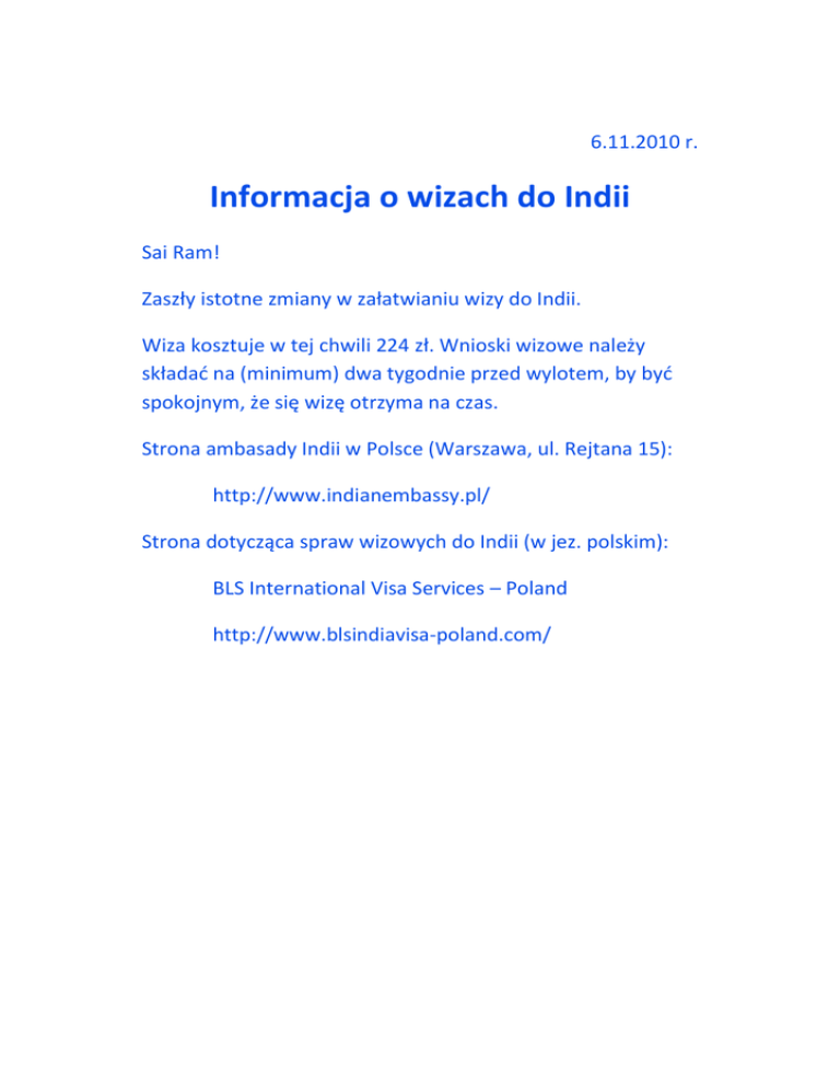 6.11.2010 r. Informacja o wizach do Indii Sai Ram! Zaszły istotne zmiany w załatwianiu wizy do Indii. Wiza kosztuje w tej chwili 224 zł. Wnioski wizowe należy składad na (minimum) dwa tygodnie przed wylotem, by byd spokojnym, że się wizę otrzyma na czas. Strona ambasady Indii w Polsce (Warszawa, ul. Rejtana 15): http://www.indianembassy.pl/ Strona dotycząca spraw wizowych do Indii (w jez. polskim): BLS International Visa Services – Poland http://www.blsindiavisa-poland.com/