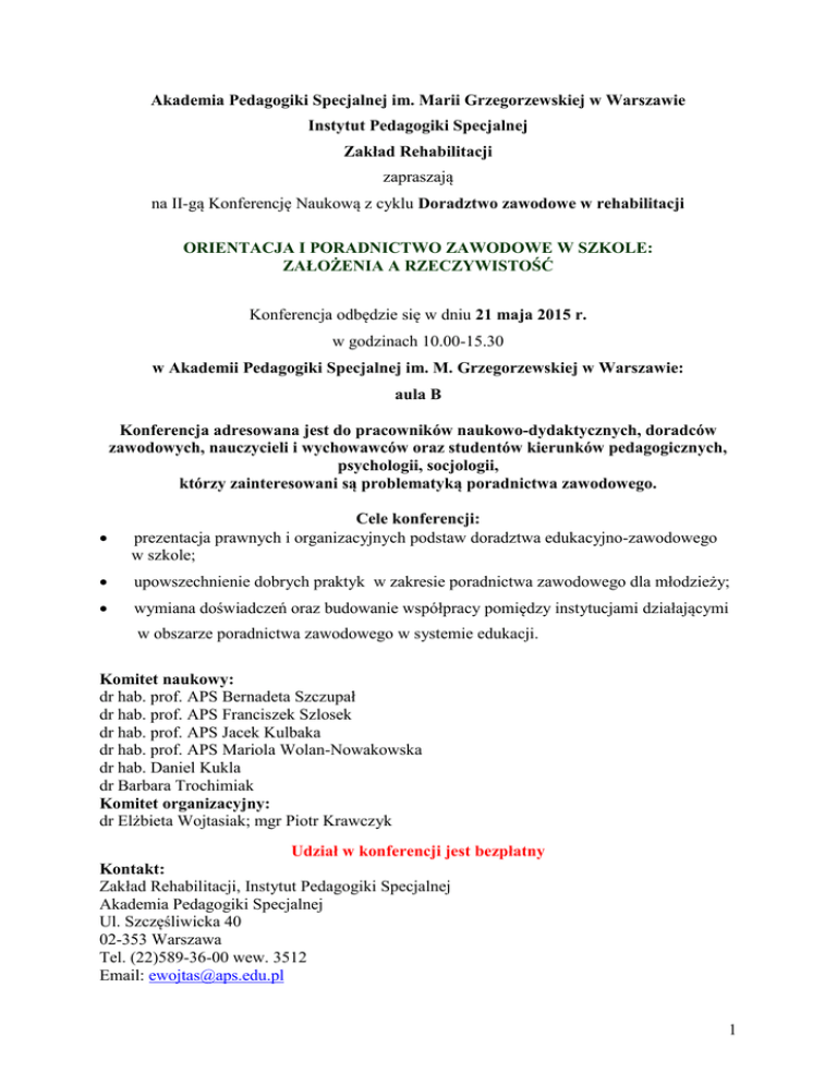 Akademia Pedagogiki Specjalnej im. Marii Grzegorzewskiej w Warszawie Instytut Pedagogiki Specjalnej Zakład Rehabilitacji zapraszają na II-gą Konferencję Naukową z cyklu Doradztwo zawodowe w rehabilitacji ORIENTACJA I PORADNICTWO ZAWODOWE W SZKOLE: ZAŁOŻENIA A RZECZYWISTOŚĆ Konferencja odbędzie się w dniu 21 maja 2015 r. w godzinach 10.00-15.30 w Akademii Pedagogiki Specjalnej im. M. Grzegorzewskiej w Warszawie: aula B Konferencja adresowana jest do pracowników naukowo-dydaktycznych, doradców zawodowych, nauczycieli i wychowawców oraz studentów kierunków pedagogicznych, psychologii, socjologii, którzy zainteresowani są problematyką poradnictwa zawodowego. Cele konferencji: prezentacja prawnych i organizacyjnych podstaw doradztwa edukacyjno-zawodowego w szkole; upowszechnienie dobrych praktyk w zakresie poradnictwa zawodowego dla młodzieży; wymiana doświadczeń oraz budowanie współpracy pomiędzy instytucjami działającymi w obszarze poradnictwa zawodowego w systemie edukacji. Komitet naukowy: dr hab. prof. APS Bernadeta Szczupał dr hab. prof. APS Franciszek Szlosek dr hab. prof. APS Jacek Kulbaka dr hab. prof. APS Mariola Wolan-Nowakowska dr hab. Daniel Kukla dr Barbara Trochimiak Komitet organizacyjny: dr Elżbieta Wojtasiak; mgr Piotr Krawczyk Udział w konferencji jest bezpłatny Kontakt: Zakład Rehabilitacji, Instytut Pedagogiki Specjalnej Akademia Pedagogiki Specjalnej Ul. Szczęśliwicka 40 02-353 Warszawa Tel. (22)589-36-00 wew. 3512 Email: [email protected] 1 10.00-10.15 OTWARCIE KONFERENCJI prof. dr hab. Stefan Kwiatkowski – Prorektor APS ds. Nauki SESJA I 10.15-11.45 prowadzi dr hab. prof. APS Bernadeta Szczupał TEORETYCZNE I ORGANIZACYJNE ZAŁOŻENIA PORADNICTWA ZAWODOWEGO W SZKOLE (czas wystąpień 15 min.) dr hab. prof. APS Franciszek Szlosek Socjoekonomiczny model rozwoju i zachowań człowieka jako przesłanka współcześnie rozumianego poradnictwa zawodowego dr hab. prof. APS Mariola Wolan-Nowakowska Młodzież wobec wyzwań związanych z przeobrażeniami wzorców kariery zawodowej dr hab. Daniel Kukla, Akademia im. J. Długosza Częstochowa Doradztwo edukacyjno-zawodowe jako wyzwanie dla współczesnej szkoły mgr Barbara Krępska Naczelnik Wydziału Szkół Ponadgimnazjalnych i Kształcenia Ustawicznego m. st. Warszawy Warszawski System Doradztwa Zawodowego jako przykład kompleksowego wsparcia uczniów w planowaniu kariery edukacyjno-zawodowej dr Justyna Bluszcz Doradca kariery w rozwoju zawodowym człowieka mgr Barbara Kowalczyk Zagadnienie pomocy i motywacji do pomagania w orientacji zawodowej 11.45-12.00 PRZERWA SESJA II 12.00-13.30 prowadzi dr hab. prof. APS Jacek Kulbaka PORADNICTWO ZAWODOWE DLA MŁODZIEŻY Z NIEPEŁNOSPRAWNOŚCIĄ dr hab. prof. APS Bernadeta Szczupał Studenci z niepełnosprawnością w systemie szkolnictwa wyższego w USA mgr Łukasz Bednarczyk Postawy wobec osób z niepełnosprawnością w środowisku akademickim dr Elżbieta Wojtasiak Uczeń ze specjalnymi potrzebami edukacyjnymi w procesie poradnictwa zawodowego mgr Izabela Baczyńska Specyfika poradnictwa edukacyjno-zawodowego dla uczniów z trudnościami w uczeniu się mgr Monika Zakrzewska Planowanie kariery ucznia o specjalnych potrzebach edukacyjnych – wyzwania rynku pracy mgr Wioleta Duda Otwarty rynek pracy szansą na poprawę jakości życia osób z niepełnosprawnością 2 13.30-13.45 PRZERWA SESJA III 13.45-15.30 prowadzą dr hab. prof. APS Mariola Wolan-Nowakowska/ dr Elżbieta Wojtasiak CELE I ZADANIA PORADNICTWA EDUKACYJNO-ZAWODOWEGO W SZKOLE mgr Piotr Krawczyk Poradnictwo edukacyjno-zawodowe w praktyce dydaktyczno-wychowawczej nauczycieli przedmiotowych i pedagogów szkolnych dr hab. prof. APS Jacek Kulbaka Informacja edukacyjno-zawodowa w nauczaniu historii mgr Monika Kieres Działalność OHP w zakresie poradnictwa zawodowego dla młodzieży dr Barbara Trochimiak Edukacja zawodowa młodzieży z niepełnosprawnością intelektualną mgr Paweł Kolański Od edukacji do samodzielności młodzieży niedostosowanej społecznie na przykładzie Młodzieżowego Ośrodka Wychowawczego Księży Orionistów mgr Marcin Lerka Poradnictwo zawodowe w szkole ponadgimnazjalnej z uwzględnieniem liceum ogólnokształcącego z oddziałami integracyjnymi mgr Grzegorz Siekierzyński-Dudek Edukacja zawodowa młodzieży niewidomej DYSKUSJA I PODSUMOWANIE KONFERENCJI 3