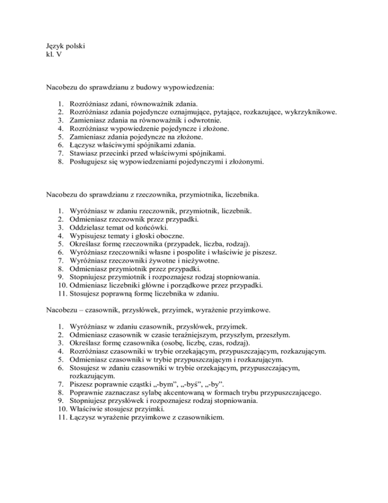 Język polski kl. V Nacobezu do sprawdzianu z budowy wypowiedzenia: 1. 2. 3. 4. 5. 6. 7. 8. Rozróżniasz zdani, równoważnik zdania. Rozróżniasz zdania pojedyncze oznajmujące, pytające, rozkazujące, wykrzyknikowe. Zamieniasz zdania na równoważnik i odwrotnie. Rozróżniasz wypowiedzenie pojedyncze i złożone. Zamieniasz zdania pojedyncze na złożone. Łączysz właściwymi spójnikami zdania. Stawiasz przecinki przed właściwymi spójnikami. Posługujesz się wypowiedzeniami pojedynczymi i złożonymi. Nacobezu do sprawdzianu z rzeczownika, przymiotnika, liczebnika. 1. Wyróżniasz w zdaniu rzeczownik, przymiotnik, liczebnik. 2. Odmieniasz rzeczownik przez przypadki. 3. Oddzielasz temat od końcówki. 4. Wypisujesz tematy i głoski oboczne. 5. Określasz formę rzeczownika (przypadek, liczba, rodzaj). 6. Wyróżniasz rzeczowniki własne i pospolite i właściwie je piszesz. 7. Wyróżniasz rzeczowniki żywotne i nieżywotne. 8. Odmieniasz przymiotnik przez przypadki. 9. Stopniujesz przymiotnik i rozpoznajesz rodzaj stopniowania. 10. Odmieniasz liczebniki główne i porządkowe przez przypadki. 11. Stosujesz poprawną formę liczebnika w zdaniu. Nacobezu – czasownik, przysłówek, przyimek, wyrażenie przyimkowe. Wyróżniasz w zdaniu czasownik, przysłówek, przyimek. Odmieniasz czasownik w czasie teraźniejszym, przyszłym, przeszłym. Określasz formę czasownika (osobę, liczbę, czas, rodzaj). Rozróżniasz czasowniki w trybie orzekającym, przypuszczającym, rozkazującym. Odmieniasz czasowniki w trybie przypuszczającym i rozkazującym. Stosujesz w zdaniu czasowniki w trybie orzekającym, przypuszczającym, rozkazującym. 7. Piszesz poprawnie cząstki „-bym”, „-byś”, „-by”. 8. Poprawnie zaznaczasz sylabę akcentowaną w formach trybu przypuszczającego. 9. Stopniujesz przysłówek i rozpoznajesz rodzaj stopniowania. 10. Właściwie stosujesz przyimki. 11. Łączysz wyrażenie przyimkowe z czasownikiem. 1. 2. 3. 4. 5. 6. Nacobezu – instrukcja. 1. 2. 3. 4. 5. Piszesz nagłówek. Instrukcję zapisujesz w punktach. Poszczególne czynności opisujesz dokładnie i precyzyjnie. Stosujesz tryb rozkazujący. Potrafisz wykonać instrukcję obrazkową (do każdej czynności wykonać rysunek). Nacobezu – przepis. 1. Piszesz wszystkie elementy kompozycyjne przepisu, tytuł, składniki, sposób wykonania. 2. Podajesz nazwę składników oraz ich ilość. 3. Opisujesz dokładnie sposób wykonania stosując bezokolicznik. 4. Poprawnie graficznie zapisujesz przepis. Nacobezu – kartka pocztowa. 1. 2. 3. 4. Właściwie adresujesz kartkę. Poprawnie piszesz pozdrowienia, stosujesz słownictwo właściwe dla danego adresata. Stosujesz zwrot do adresata, podpisujesz się. Piszesz tekst poprawny pod względem językowym, ortograficznym, interpunkcyjnym. Nacobezu – opis postaci. 1. Piszesz wypowiedź zgodną z planem opisu ( 1) przedstawienie postaci, 2) opis wyglądu zewnętrznego, 3) cechy charakteru itp.). 2. Posługujesz się słownictwem opisującym i oceniającym. 3. Piszesz opis dokładny i wyczerpujący. 4. Piszesz poprawnie pod względem językowym, ortograficznym, interpunkcyjnym. 5. Stosujesz akapity. 6. Piszesz pracę ładnie i estetycznie. Nacobezu – opis obrazu. 1. Piszesz opis zgodny z planem. 2. Stosujesz trójdzielną kompozycję – wstęp, rozwinięcie, zakończenie. 3. Posługujesz się słownictwem typowym do opisu obrazu (rodzaj malarstwa, kompozycja obrazu, plan pierwszy, tło, barwy). 4. Posługujesz się słownictwem opisowym i oceniającym. 5. Piszesz poprawnie pod względem językowym, ortograficznym, interpunkcyjnym. 6. Stosujesz akapity. Nacobezu – opowiadanie. 1. 2. 3. 4. Piszesz opowiadanie zgodnie z tematem. Nadajesz tytuł. Piszesz tekst, w którym wydarzenia mają ciąg przyczynowo-skutkowy. Stosujesz dialog. 5. Wzbogacasz treść opowiadania stosując opis (np. postaci, miejsc, uczuć), komentarz, refleksję. 6. Piszesz opowiadanie poprawne pod względem językowym, ortograficznym i interpunkcyjnym. 7. Stosujesz akapity. 8. Zapisujesz opowiadanie estetycznie. Nacobezu – sprawozdanie. 1. Stosujesz kompozycje trójdzielną – wstęp, rozwinięcie, zakończenie. 2. We wstępie umieszczasz właściwe informacje (nazwa imprezy, data, miejsce, uczestnicy, cel). 3. W rozwinięciu krótko opisujesz przebieg imprezy. 4. Stosujesz słownictwo opisujące i oceniające. 5. Piszesz tekst poprawny pod względem językowym ortograficznym i interpunkcyjnym. 6. Stosujesz akapity. 7. Zapisujesz sprawozdanie estetycznie i czytelnie.