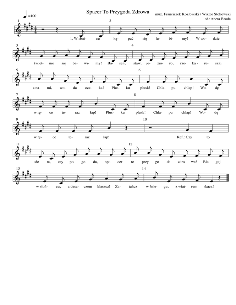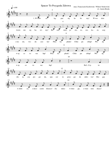 . =100 1 QQQQ \ \ & 3 & 5 & 7 & 9 & 11 & 13 & QQQQ QQQQ QQQQ QQQQ QQQQ QQQQ Spacer To Przygoda Zdrowa D . ! . świet- . ! z na- w rę- . w rę- sło- . ! . się . mi, . . nie ! ! . ce ! ! . wo- ! ce . ta, ! w słoń- ! ! . czy . cu, ! ! . 1. W słoń- ! . te- . ! ! . ba- . da ! raz te- ! . . po- ! z desz- ! . cze- . ! . wi- ! ! . ! . cu ! . my! ! . raz . go- ! . . czem . Ba- ! . ! ! . . łap! . spa- . klaszcz! ! ! ! . . ! . pać sen, Plus- Plus- da, ! ! ka! . ką- . łap! ! 2 ! . ! ! ! . . staw, . . się 4 ku ku ! ! muz. Franciszek Kozłowski / Wiktor Stokowski sł.: Aneta Broda je- . lu- ! . plusk! plusk! D bi- ! zio- . . . ! . . 6 8 ! ro, ! . ! Chla- 10 pu . pu my! ! . Chla- . ! . rze- ! ! ! . ! W wo- . . ka - . ! ru- . chlap! Wo- . . chlap! Wo- . Ref.: Czy ! . dzie ! ! . szaj . dę ! . dę . to ! ! ! ! 12 ! ! ! ! ! ! ! ! . . . . . . . . . cer . Za- ! to . ! tańcz przy14 go- . ! w śnie- da . gu, ! zdro- . ! z wiat- wa! . rem Bie- ! gaj . skacz! D
