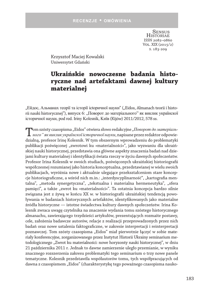 recenzje • omówienia Sensus Historiae ISSN 2082–0860 Vol. XIX (2015/2) s. 183-209 Krzysztof Maciej Kowalski Uniwersytet Gdański Ukraińskie nowoczesne badania historyczne nad artefaktami dawnej kultury materialnej „Ейдoc, Альмaнaх тeopiї тa icтopiї ictopичнoї нaуки” („Eidos, Almanach teorii i historii nauki historycznej”), випуcк 6: „Пoвopoт дo мaтepiaльнoгo” як виклик укpaїнcкoї іcтopичнoї нaуки, pod red. Iriny Kolesnik, Kиїв (Kijów) 2011/2012, 578 ss. T om szósty czasopisma „Eidos” otwiera słowo redakcyjne „Пoвopoт дo мaтepiaльнoгo” як виклик укpaїнcкoї іcтopичнoї нaуки, napisane przez redaktor odpowiedzialną, profesor Irinę Kolesnik. W tym obszernym wprowadzeniu do problematyki publikacji poświęconej „zwrotowi ku »materialności«”, jako wyzwaniu dla ukraińskiej nauki historycznej, przedstawia ona główne aspekty znaczenia badań nad dziejami kultury materialnej i identyfikacji świata rzeczy w życiu dawnych społeczeństw. Profesor Irina Kolesnik w swoich studiach, poświęconych ukraińskiej historiografii współczesnej rozumianej jako historia konceptualna, przedstawianej w wielu swoich publikacjach, wyróżnia nowe i aktualnie ulegające przekształceniom stare koncepcje historiograficzne, a wśród nich m.in.: „interdyscyplinarność”, „kartografia mentalna”, „metoda synergetyczna”, „tekstualna i materialna hermeneutyka”, „sfera pamięci”, a także „zwrot ku »materialności«”. Ta ostatnia koncepcja bardzo silnie związana jest z żywą w końcu XX w. w historiografii ukraińskiej tendencją powoływania w badaniach historycznych artefaktów, identyfikowanych jako materialne źródła historyczne — istotne świadectwa kultury dawnych społeczeństw. Irina Kolesnik zwraca uwagę czytelnika na znaczenie wydania tomu szóstego historycznego almanachu, zawierającego trzydzieści artykułów, prezentujących rozmaite postawy, cele, założenia badawcze autorów, relacje z realizacji przeprowadzonych przez nich badań oraz nowe ustalenia faktograficzne, w zakresie interpretacji i reinterpretacji poznawczej. Tom szósty czasopisma „Eidos” miał pierwotnie łączyć w sobie materiały konferencyjne, zorganizowanego przez Instytut Historii Ukrainy seminarium metodologicznego „Zwrot ku materialności: nowe horyzonty nauki historycznej”, w dniu 21 października 2011 r. Jednak to dawne zamierzenie uległo przemianie, w wyniku znacznego rozszerzenia zakresu problematyki tego seminarium o trzy nowe panele tematyczne. Kolesnik przedstawiła współautorów tomu, tych współpracujących od dawna z czasopismem „Eidos” (charakterystykę tego poważnego czasopisma nauko- 183 recenzje • omówienia wego można odszukać na stronach internetowych związanych z ukraińską nauką historyczną), i tych, którzy po raz pierwszy opublikowali w tym czasopiśmie swoje prace. Autor niniejszego omówienia odebrał jako niezwykły zaszczyt określenie jego osoby jako założyciela gdańskiej, uniwersyteckiej szkoły artefaktologii. Artykuły zaprezentowane w przedłożonym tomie wypełniły kilka grup tematycznych. W niniejszym tekście podano ich tytuły w nowej polskiej transliteracji wraz z tłumaczeniem na język polski. Po nazwisku każdego z autorów (także w nowej polskiej transliteracji) umieszczono informacje o ich pozycji naukowej i zatrudniających ich instytucjach. Ułatwi to orientację, w których placówkach naukowych na Ukrainie i w Rosji podejmowane są badania nad teorią i metodologią historii kultury materialnej. Tytuły wszystkich artykułów podano wyłącznie w dokładnym tłumaczeniu na język polski. Pierwszą grupę artykułów zatytułowano „»Povorot do material’nogo«: peredmovi, sutnist’ značennâ” („Zwrot ku materialności. Przyczyny, istota, znaczenia”). Darina Androsova-Bajda (Dniepropietrowsk, kandydat nauk historycznych, docent Katedry Ukrainoznawstwa na Dniepropietrowskim Narodowym Uniwersytecie Transportu im. V. I. Lazariana) w swoim artykule pt. „Od narodzin do śmierci: cykle życiowych przedmiotów” zastanawia się, jak należy zrozumieć naturę rzeczy istniejących w świecie i ich wpływ na inicjowanie i rozwijanie nowych koncepcji w badaniu życiorysów rzeczy. Swoje rozważania autorka opiera na dobrym rozpoznaniu prac uznanych badaczy przedmiotu, nie tylko Ukraińców i Rosjan (m.in. V. N. Toporova), ale także E. Domańskiej, W. Keane’a, E. Tofflera, Ch. Gosdena, Y. Marschalla, B. Olsena, R. Tringhama, I. Kopytoffa i B. Latoura. Eksponuje ona analizę czynników, wpływających na oczekiwaną długość życia rzeczy, przedmiotów, obiektów, którymi człowiek się posługuje, ze specjalnym wyróżnieniem makro-, mezo- i mikrofaktów i ich wzajemnych wpływów w przeszłości. Irina Kolesnik (Kijów, doktor nauk historycznych, profesor, kierownik — samodzielny pracownik naukowy Instytutu Historii Ukrainy Narodowej Akademii Nauk Ukrainy, autorka doskonałej syntezy historiograficznej Historiografia ukraińska. Historia konceptualna, Kijów 2013), w artykule „»Rzeczy wokół nas«: czy historia jako dyscyplina nauki jest gotowa na następny »zwrot«”. Autorka próbuje analizować znaczenie i funkcje „Zwrotu ku materialności” we współczesnej historii jako dyscypliny naukowej. Zasadą charakterystyczną dla takiego zwrotu są nowe formy pojmowania rzeczy. „Zwrot ku materialności” oznacza generalnie zniszczenie granic dzielących czynniki duchowe i materialne, przedmioty materialne i ludzi. W takiej sytuacji elementy ludzkie i nieludzkie tworzą połączoną sieć wzajemnych relacji społecznych. Swoje spostrzeżenia autorka zawarła w kilku częściach zatytułowanych następująco: „W wirze zwrotów”, „Z historii rzeczy. Implikacje historiograficzne”, „»Zwrot ku rzeczom«: przyczyny i znaczenia”, „Socjokulturowa historia rzeczy”,