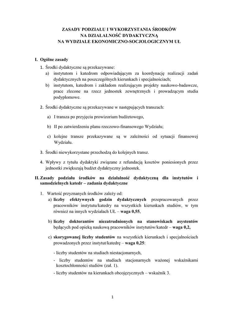 ZASADY PODZIAŁU I WYKORZYSTANIA ŚRODKÓW NA DZIAŁALNOŚĆ DYDAKTYCZNĄ NA WYDZIALE EKONOMICZNO-SOCJOLOGICZNYM UŁ I. Ogólne zasady 1. Środki dydaktyczne są przekazywane: a) instytutom i katedrom odpowiadającym za koordynację realizacji zadań dydaktycznych na poszczególnych kierunkach i specjalnościach; b) instytutom, katedrom i zakładom realizującym projekty naukowo-badawcze, prace zlecone na rzecz jednostek zewnętrznych i prowadzącym studia podyplomowe. 2. Środki dydaktyczne są przekazywane w następujących transzach: a) I transza po przyjęciu prowizorium budżetowego, b) II po zatwierdzeniu planu rzeczowo-finansowego Wydziału; c) kolejne transze przekazywane są w zależności od sytuacji finansowej Wydziału. 3. Środki niewykorzystane przechodzą do kolejnych transz. 4. Wpływy z tytułu dydaktyki związane z refundacją kosztów poniesionych przez jednostki zwiększają budżet dydaktyczny jednostek. II. Zasady podziału środków na działalność dydaktyczną dla instytutów i samodzielnych katedr – zadania dydaktyczne 1. Wartość przyznanych środków zależy od: a) liczby efektywnych godzin dydaktycznych przepracowanych przez pracowników instytutu/katedry na wszystkich kierunkach studiów, w tym również na innych wydziałach UŁ – waga 0,55, b) liczby doktorantów niezatrudnionych na stanowiskach asystentów będących pod opieką naukową pracowników instytutów/katedr – waga 0,2, c) skorygowanej liczby studentów na wszystkich kierunkach i specjalnościach prowadzonych przez instytut/katedrę – waga 0,25: - liczby studentów na studiach niestacjonarnych, - liczby studentów na studiach stacjonarnych ważonej wskaźnikami kosztochłonności studiów (zał. 1). - liczby studentów na kierunkach obcojęzycznych – wskaźnik 3. 1 2. Ustalona w poprzednim punkcie pula środków dydaktycznych podlega korekcie o saldo wykorzystania środków dydaktycznych przez instytut/katedrę za poprzedni rok kalendarzowy. III. Zasady podziału środków na działalność dydaktyczną dla instytutów, katedr i zakładów – projekty, prace zlecone i studia podyplomowe Wartość przyznanych środków zależy od: a) narzutu kosztów pośrednich naliczonych w poprzednim roku kalendarzowym w projektach naukowo-badawczych realizowanych przez katedrę/zakład; w przypadku projektów, w których biorą udział pracownicy różnych jednostek o podziale decyduje kierownik projektu; b) narzutu kosztów pośrednich naliczonych w poprzednim roku kalendarzowym w projektach (pracach zleconych) realizowanych przez katedrę/zakład na rzecz jednostek zewnętrznych; w przypadku projektów, w których biorą udział pracownicy różnych jednostek o podziale decyduje kierownik projektu; c) narzutu kosztów pośrednich naliczonych w poprzednim roku kalendarzowym w studiach podyplomowych realizowanych w instytucie/katedrze/zakładzie. 2. Wartość przyznanych środków jest dzielona proporcjonalnie do sumy określonych wyżej narzutów kosztów pośrednich. 1. IV. Zasady wykorzystania środków na działalność dydaktyczną 1. Ze środków dydaktycznych przekazanych instytutom/katedrom/zakładom mogą być finansowane m.in. następujące wydatki: a) udział w konferencjach doktorantów niezatrudnionych na stanowiskach asystentów, b) udział w konferencjach dydaktycznych, szkoleniach, kursach doszkalających pracowników katedr/zakładów, c) publikacje podręczników, d) zakup podręczników, e) zakup baz danych wykorzystywanych do celów dydaktycznych, f) zakup materiałów i usług niezbędnych do bieżącej realizacji procesu dydaktycznego, g) dofinansowanie studenckich kół naukowych, h) inne wydatki związane z procesem dydaktycznym. 2. Dla doktorantów, którzy złożyli w poprzednim roku kalendarzowym wniosek o projekt naukowo-badawczy uwzględniany przy ustalaniu kwoty dotacji podstawowej dla Wydziału według składnika badawczego, niezależnie od wyników 2 postępowania konkursowego, koszty udziału w konferencjach do kwoty 2 000 zł są pokrywane ze środków dydaktycznych Dziekana Wydziału. 3. Kierownik jednostki prowadzi na bieżąco kontrolę wykonania budżetu dydaktycznego. Przekroczenie budżetu wymaga zatwierdzenia przez Dziekana Wydziału. 4. Środki przekazane z rezerwy Dziekana wchodzą do budżetu dydaktycznego jednostki. 3 Załącznik 1 Wskaźniki kosztochłonności kierunków studiów Kierunek Obszar Dziedzina Nauki ekonomiczne 50% Nauki matematyczne 50% Wskaźnik dla dziedziny Analityka gospodarcza Nauk społecznych Nauk ścisłych Ekobiznes Nauk społecznych Nauki ekonomiczne 80% Nauk przyrodniczych Nauki biologiczne 20% 1,5 2,5 1,7 Ekonomia Ekonomia sektora publicznego Europeistyka Nauk społecznych Nauki ekonomiczne 100% 1,5 1,5 Nauk społecznych Nauki ekonomiczne 50% Nauki społeczne 50% 1,5 1,0 1,25 Finanse i rachunkowość Nauk społecznych Nauki ekonomiczne 100% 1,5 1,5 Informatyka Nauk społecznych Nauk ścisłych Nauki ekonomiczne 23% Nauki matematyczne 77% 1,5 2,0 1,885 Informatyka i ekonometria Nauk społecznych Nauk ścisłych Nauki ekonomiczne 65% Nauki matematyczne 35% 1,5 2,0 1,675 Gospodarka przestrzenna, Regionalistyka Nauk społecznych Nauki ekonomiczne 88% Nauk przyrodniczych Nauki biologiczne 4% Nauk technicznych Nauki techniczne 8% 1,5 2,5 2,5 1,62 Logistyka, Innowacyjne technologie materiałowe MSG, Biznes międzynarodowy, Finanse międzynarodowe Praca socjalna Nauk społecznych Nauk technicznych Nauki ekonomiczne 75% Nauki techniczne 25% 1,5 2,5 1,75 Nauk społecznych Nauki ekonomiczne 100% 1,5 1,5 Nauk społecznych Nauki społeczne 100% 1,0 1,0 Polityka społeczna Nauk społecznych Nauki społeczne 100% 1,0 1,0 Socjologia Nauk społecznych Nauki społeczne 100% 1,0 1,0 4 1,5 2,0 Wskaźnik ważony dla kierunku 1,75
