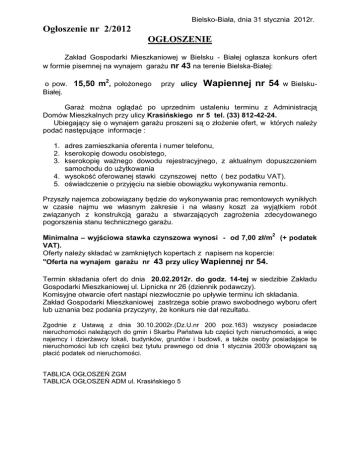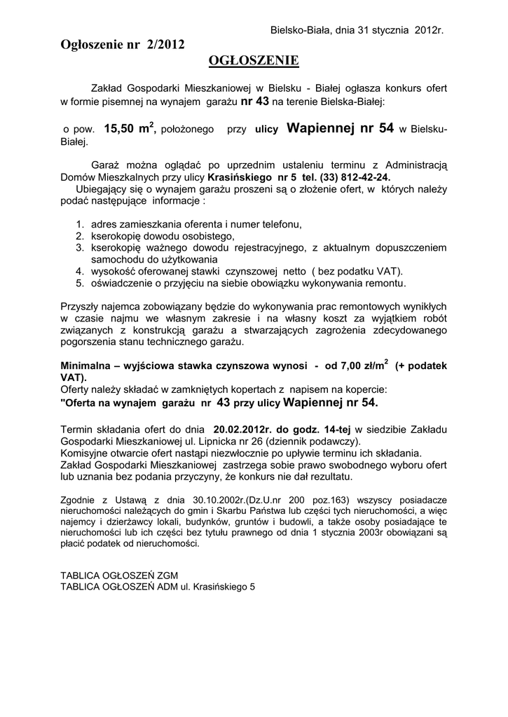 Bielsko-Biała, dnia 31 stycznia 2012r. Ogłoszenie nr 2/2012 OGŁOSZENIE Zakład Gospodarki Mieszkaniowej w Bielsku - Białej ogłasza konkurs ofert w formie pisemnej na wynajem garażu nr 43 na terenie Bielska-Białej: 2 o pow. 15,50 m , położonego Białej. przy ulicy Wapiennej nr 54 w Bielsku- Garaż można oglądać po uprzednim ustaleniu terminu z Administracją Domów Mieszkalnych przy ulicy Krasińskiego nr 5 tel. (33) 812-42-24. Ubiegający się o wynajem garażu proszeni są o złożenie ofert, w których należy podać następujące informacje : 1. adres zamieszkania oferenta i numer telefonu, 2. kserokopię dowodu osobistego, 3. kserokopię ważnego dowodu rejestracyjnego, z aktualnym dopuszczeniem samochodu do użytkowania 4. wysokość oferowanej stawki czynszowej netto ( bez podatku VAT). 5. oświadczenie o przyjęciu na siebie obowiązku wykonywania remontu. Przyszły najemca zobowiązany będzie do wykonywania prac remontowych wynikłych w czasie najmu we własnym zakresie i na własny koszt za wyjątkiem robót związanych z konstrukcją garażu a stwarzających zagrożenia zdecydowanego pogorszenia stanu technicznego garażu. Minimalna – wyjściowa stawka czynszowa wynosi - od 7,00 zł/m2 (+ podatek VAT). Oferty należy składać w zamkniętych kopertach z napisem na kopercie: "Oferta na wynajem garażu nr 43 przy ulicy Wapiennej nr 54. Termin składania ofert do dnia 20.02.2012r. do godz. 14-tej w siedzibie Zakładu Gospodarki Mieszkaniowej ul. Lipnicka nr 26 (dziennik podawczy). Komisyjne otwarcie ofert nastąpi niezwłocznie po upływie terminu ich składania. Zakład Gospodarki Mieszkaniowej zastrzega sobie prawo swobodnego wyboru ofert lub uznania bez podania przyczyny, że konkurs nie dał rezultatu. Zgodnie z Ustawą z dnia 30.10.2002r.(Dz.U.nr 200 poz.163) wszyscy posiadacze nieruchomości należących do gmin i Skarbu Państwa lub części tych nieruchomości, a więc najemcy i dzierżawcy lokali, budynków, gruntów i budowli, a także osoby posiadające te nieruchomości lub ich części bez tytułu prawnego od dnia 1 stycznia 2003r obowiązani są płacić podatek od nieruchomości. TABLICA OGŁOSZEŃ ZGM TABLICA OGŁOSZEŃ ADM ul. Krasińskiego 5