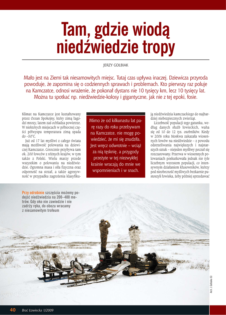 Tam, gdzie wiodà niedêwiedzie tropy JERZY GOLBIAK Ma∏o jest na Ziemi tak niesamowitych miejsc. Tutaj czas up∏ywa inaczej. Dziewicza przyroda powoduje, ˝e zapomina si´ o codziennych sprawach i problemach. Kto pierwszy raz poluje na Kamczatce, odnosi wra˝enie, ˝e pokona∏ dystans nie 10 tysi´cy km, lecz 10 tysi´cy lat. Mo˝na tu spotkaç np. niedêwiedzie-kolosy i gigantyczne, jak nie z tej epoki, ∏osie. Klimat na Kamczatce jest kszta∏towany przez Ocean Spokojny, który zimà ∏agodzi mrozy, latem zaÊ och∏adza powietrze. W niektórych miejscach w pó∏nocnej cz´Êci pó∏wyspu temperatura zimà spada do –50°C. Ju˝ od 17 lat myÊliwi z ca∏ego Êwiata majà mo˝liwoÊç polowania na dziewiczej Kamczatce. Corocznie przybywa tam ok. 200 ∏owców z ró˝nych krajów, w tym tak˝e z Polski. Wielu marzy przede wszystkim o polowaniu na niedêwiedzie. Ogromna masa i si∏a fizyczna oraz odpornoÊç na strza∏, a tak˝e agresywnoÊç w przypadku zagro˝enia klasyfiku- Mimo ˝e od kilkunastu lat par´ razy do roku przebywam na Kamczatce, nie mog´ powiedzieç, ˝e mi si´ znudzi∏a. Jest wr´cz odwrotnie – wcià˝ za nià t´skni´, a przygody prze˝yte w tej niezwyk∏ej krainie wracajà do mnie we wspomnieniach i w snach. jà niedêwiedzia kamczackiego do najbardziej niebezpiecznych zwierzàt. LiczebnoÊç populacji tego gatunku, wed∏ug danych s∏u˝b ∏owieckich, waha si´ od 10 do 12 tys. osobników. Kiedy w 2006 roku Moskwa zakaza∏a wiosennych ∏owów na niedêwiedzie – z powodu odstrzeliwania najwi´kszych i najstarszych sztuk – niejeden myÊliwy poczu∏ si´ rozczarowany. Przerwa w wiosennych polowaniach poskutkowa∏a jednak nie tyle liczebnym wzrostem populacji, co intensywnym dzia∏aniem k∏usowników, którzy pod nieobecnoÊç myÊliwych bezkarnie pustoszyli ∏owiska, ˝eby póêniej sprzedawaç Arch. J. Golbiaka (6) Przy odrobinie szcz´Êcia mo˝emy podejÊç niedêwiedzia na 200–400 metrów. Gdy oko nie zawiedzie i nie zadr˝y r´ka, do obozu wracamy z niesamowitym trofeum 40 Braç ¸owiecka 1/2009 Marzeniem ka˝dego myÊliwego jest zapolowaç na któregoÊ z najwi´kszych niedêwiedzi. Waga takiego kolosa mo˝e dochodziç do 600 kilo ∏apy i ˝ó∏ç niedêwiedzi na chiƒski rynek (na afrodyzjaki i do ekskluzywnych restauracji). Po stwierdzeniu tych faktów departament ∏owiectwa pozwoli∏ myÊliwym wróciç wiosnà na Kamczatk´, aby znów mogli prze˝ywaç niesamowità przygod´, jakà jest zmierzenie si´ z wielkim „koso∏apym”, jak potocznie nazywajà niedêwiedzia miejscowi myÊliwi. Pod koniec kwietnia i na poczàtku maja zwierz´ta po wyjÊciu z bar∏ogu intensywnie ˝erujà i sà widoczne na Êniegu z du˝ej odleg∏oÊci. Niedêwiedê pos∏uguje si´ przede wszystkim s∏uchem i w´chem; wzrok ma s∏aby. Temperatura w tym okresie waha si´ od –5 do +5°C i z regu∏y panuje pi´kna, bezwietrzna pogoda. Polecam polowanie w tym terminie myÊliwym, którzy nie lubià wylewaç potu, ˝eby zdobyç dobre trofeum. Je˝eli pokrywa Êniegu jest dostatecznie gruba, odbywa si´ to przy pomocy skutera Ênie˝nego. MyÊliwy jest ciàgni´ty na sankach za pojazdem do podnó˝a góry, a dalej podchodzi na nartach lub rakietach ‡ Przy okazji polowania na niedêwiedzia mo˝na spotkaç wilka, rysia lub przebieg∏ego rosomaka, najwi´kszego przedstawiciela ∏asicowatych, o którym miejscowi traperzy opowiadajà niesamowite historie Braç ¸owiecka 1/2009 41 Ênie˝nych. Najlepiej jest wejÊç na gór´ i z wysokoÊci wygodnie wypatrywaç zwierza. Przy dobrej pogodzie mo˝na obserwowaç teren na odleg∏oÊç kilku kilometrów. JeÊli mamy troch´ szcz´Êcia, w polu widzenia mo˝emy zobaczyç jednoczeÊnie kilka niedêwiedzi. DoÊwiadczenie miejscowych podprowadzajàcych pozwala wybraç najbardziej okaza∏e trofeum i zaplanowaç wariant podchodu z uwzgl´dnieniem wiatru oraz ukszta∏towania terenu. Miejscowi myÊliwi majà na rozk∏adzie po kilkanaÊcie niedêwiedzi, zdobytych z g∏adkostwo∏ki i patronów robionych przez siebie z „niedêwiedzià” nawa˝kà prochu. Warunkiem wyjÊcia ca∏o z takiego pojedynku jest strzelanie nie dalej ni˝ na 30 metrów. Histori´ kamczackiego ∏owiectwa tworzyli m.in.: Jura Miular, Jura Ponomariow, Michai∏ Stanin i Walery ¸ysienko. Wiele si´ od nich nauczy∏em i prze˝y∏em z nimi niezapomniane chwile. Niektórzy odeszli ju˝ do krainy wiecznych ∏owów – przed nimi nisko chyl´ czo∏o, a tych, co dalej tropià niedêwiedzie, pozdrawiam 8 polskim zwyczajem: Darz bór. Ze wzgl´du na nieprzewidywalny rodzaj terenu (tajga, tundra, góry) oraz du˝à odleg∏oÊç strza∏u, ze swego doÊwiadczenia proponowa∏bym u˝ywaç broni kal. 300 Weatherby i odpowiednio ci´˝kiej kuli Wiosnà mo˝na ustrzeliç g∏uszca kamiennego. Ptak ten nieznacznie ró˝ni si´ ubarwieniem od naszych g∏uszców i tokuje bez zwrotek, wydajàc tylko skrzekliwy g∏os. Kogut, który jeszcze nie widzia∏ cz∏owieka, mo˝e potraktowaç myÊliwego jak konkurenta i z furià go zaatakowaç 42 Braç ¸owiecka 1/2009 Wi´cej informacji o wiosennych polowaniach na Kamczatce mo˝na uzyskaç u autora, tel. 0 604 186 107 Wiosna, cudowna, bezwietrzna pogoda, pó∏tora metra Êniegu, który topnieje w oczach pod wp∏ywem ciep∏ych promieni s∏onecznych (wydaje si´, ˝e ˝ar leje si´ z nieba!). Ich odbicie od krystalicznego Êniegu pora˝a wzrok, dlatego nieodzowne sà ciemne okulary oraz ochronny krem z filtrem