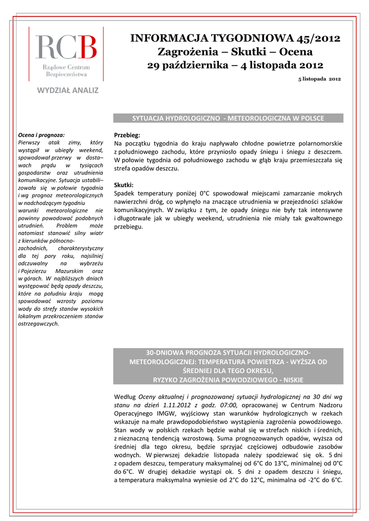 INFORMACJA TYGODNIOWA 45/2012 Zagrożenia – Skutki – Ocena 29 października – 4 listopada 2012 5 listopada 2012 WYDZIAŁ ANALIZ YTUACJA HYDROLOGICZNO-METEOROLOGICZNA - OCHŁODZENIE, ŚNIEG i ŚNIEG Z DESZCZEM SYTUACJA HYDROLOGICZNO - METEOROLOGICZNA W POLSCE Ocena i prognoza: Pierwszy atak zimy, który wystąpił w ubiegły weekend, spowodował przerwy w dosta– wach prądu w tysiącach gospodarstw oraz utrudnienia komunikacyjne. Sytuacja ustabili– zowała się w połowie tygodnia i wg prognoz meteorologicznych w nadchodzącym tygodniu warunki meteorologiczne nie powinny powodowad podobnych utrudnieo. Problem może natomiast stanowid silny wiatr z kierunków północnozachodnich, charakterystyczny dla tej pory roku, najsilniej odczuwalny na wybrzeżu i Pojezierzu Mazurskim oraz w górach. W najbliższych dniach występowad będą opady deszczu, które na południu kraju mogą spowodowad wzrosty poziomu wody do strefy stanów wysokich lokalnym przekroczeniem stanów ostrzegawczych. Przebieg: Na początku tygodnia do kraju napływało chłodne powietrze polarnomorskie z południowego zachodu, które przyniosło opady śniegu i śniegu z deszczem. W połowie tygodnia od południowego zachodu w głąb kraju przemieszczała się strefa opadów deszczu. Skutki: Spadek temperatury poniżej 0°C spowodował miejscami zamarzanie mokrych nawierzchni dróg, co wpłynęło na znaczące utrudnienia w przejezdności szlaków komunikacyjnych. W związku z tym, że opady śniegu nie były tak intensywne i długotrwałe jak w ubiegły weekend, utrudnienia nie miały tak gwałtownego przebiegu. 30-DNIOWA PROGNOZA SYTUACJI HYDROLOGICZNOMETEOROLOGICZNEJ: TEMPERATURA POWIETRZA - WYŻSZA OD ŚREDNIEJ DLA TEGO OKRESU, RYZYKO ZAGROŻENIA POWODZIOWEGO - NISKIE Według Oceny aktualnej i prognozowanej sytuacji hydrologicznej na 30 dni wg stanu na dzieo 1.11.2012 z godz. 07:00, opracowanej w Centrum Nadzoru Operacyjnego IMGW, wyjściowy stan warunków hydrologicznych w rzekach wskazuje na małe prawdopodobieostwo wystąpienia zagrożenia powodziowego. Stan wody w polskich rzekach będzie wahał się w strefach niskich i średnich, z nieznaczną tendencją wzrostową. Suma prognozowanych opadów, wyższa od średniej dla tego okresu, będzie sprzyjad częściowej odbudowie zasobów wodnych. W pierwszej dekadzie listopada należy spodziewad się ok. 5 dni z opadem deszczu, temperatury maksymalnej od 6°C do 13°C, minimalnej od 0°C do 6°C. W drugiej dekadzie wystąpi ok. 5 dni z opadem deszczu i śniegu, a temperatura maksymalna wyniesie od 2°C do 12°C, minimalna od -2°C do 6°C. INFORMACJA TYGODNIOWA 29 października – 4 listopada 2012 W trzeciej dekadzie, liczba dni z opadem deszczu oraz śniegu wyniesie ok. 6, przy temperaturze maksymalnej od 0°C do 7°C i minimalnej od -5°C do 3°C. POCIĄGI NA KURSIE KOLIZYJNYM W KATOWICACH Ocena i prognoza: Przyczyny zdarzenia wyjaśnia specjalna komisja. To już czwarte w tym roku zdarzenie tego typu na polskiej kolei. Najtragiczniejsze w skutkach miało miejsce 3 marca pod Szczekocinami, gdzie śmierd poniosło 16 osób, a 92 odniosły obrażenia. Przebieg: W niedzielę (4.10) przed dworcem w Katowicach, dwa pociągi na torze kolizyjnym. W incydencie uczestniczył pociąg EuroCity, należący do spółki PKP Intercity, jadący z Wiednia do Warszawy oraz pusty pociąg Przewozów Regionalnych, który manewrował przed planowanym wyjazdem na trasę do Kozłowa. Maszyniści wyhamowali i nie doszło do kolizji. Skutki: Nikt nie odniósł obrażeo. MARSZ NIEPODLEGŁOŚCI W DNIU 11 LISTOPADA Ocena i prognoza: Mając na uwadze przebieg ubiegłorocznych wydarzeo pod– czas manifestacji 11 listopada w Warszawie, należy brad pod uwagę możliwą eskalację napięcia i objąd miejsca zgromadzeo szczególnym monitoringiem ze względu na potencjalne zakłócenia porządku i zagrożenie dla bezpieczeostwa nie tylko uczestników, ale także osób postronnych. Przebieg: W dniu Święta Niepodległości 11 listopada 2012 r., w Warszawie odbędą się co najmniej trzy manifestacje: „Marsz Niepodległości” organizowany przez środowiska narodowej prawicy, „demonstracja antyfaszystowska” organizowana przez środowiska liberalne i lewicowe oraz marsz pod hasłem „Razem dla Niepodległej”, którego organizatorem jest Kancelaria Prezydenta wspólnie z przedstawicielami kombatantów. Trasy marszów zastały zaplanowane w taki sposób, aby nie kolidowały ze sobą. Skutki: W chwili obecnej trudno ocenid potencjalne skutki wydarzenia. Mimo deklaracji przedstawicieli organizacji anarchistycznych o nieblokowaniu tegorocznego marszu, zgromadzenie w jednym miejscu ok. 60 tys. uczestników o odmiennych poglądach jest potencjalnym zagrożeniem dla bezpieczeostwa publicznego. Zagrożeniem jest także ewentualne dołączenie się do manifestacji osób o nastawieniu radykalnym i agresywnym. USA/UE – PLANOWANY NA 5 LISTOPADA ATAK HAKERÓW Ocena i prognoza: Hakerzy z grupy Anonymous sprzeciwiają się cenzurze Internetu i ograniczaniu swobód obywatelskich. W październiku br. przeprowadzili m.in. atak cybernetyczny na stronę internetową Sejmu RP. Akcja miała bardzo ograniczony zasięg i polegała na czasowym zablokowaniu strony. Przebieg: Wg informacji Ministerstwa Spraw Zagranicznych, 5 listopada, międzynarodowa grupa hakerów komputerowych występującą pod kryptonimem Anonymous planuje zaatakowad strony internetowe instytucji paostwowych, banków, a także konta wybranych instytucji na Facebooku. Zapowiedź dotyczy krajów Unii Europejskiej i Stanów Zjednoczonych. Skutki: Na chwilę obecną brak. Rządowe Centrum Bezpieczeństwa Al. Ujazdowskie 5, 00-583 Warszawa | tel./fax +48 22 236 59 75 [email protected] | www . r c b . g o v . p l 2 INFORMACJA TYGODNIOWA 29 października – 4 listopada 2012 REFERENDUM W SPRAWIE GENERALNEGO STRAJKU OSTRZEGAWCZEGO NA ŚLĄSKU Ocena i prognoza: Referenda oznaczają przygotowania do zapowiadanego na luty 2013 r. generalnego strajku 