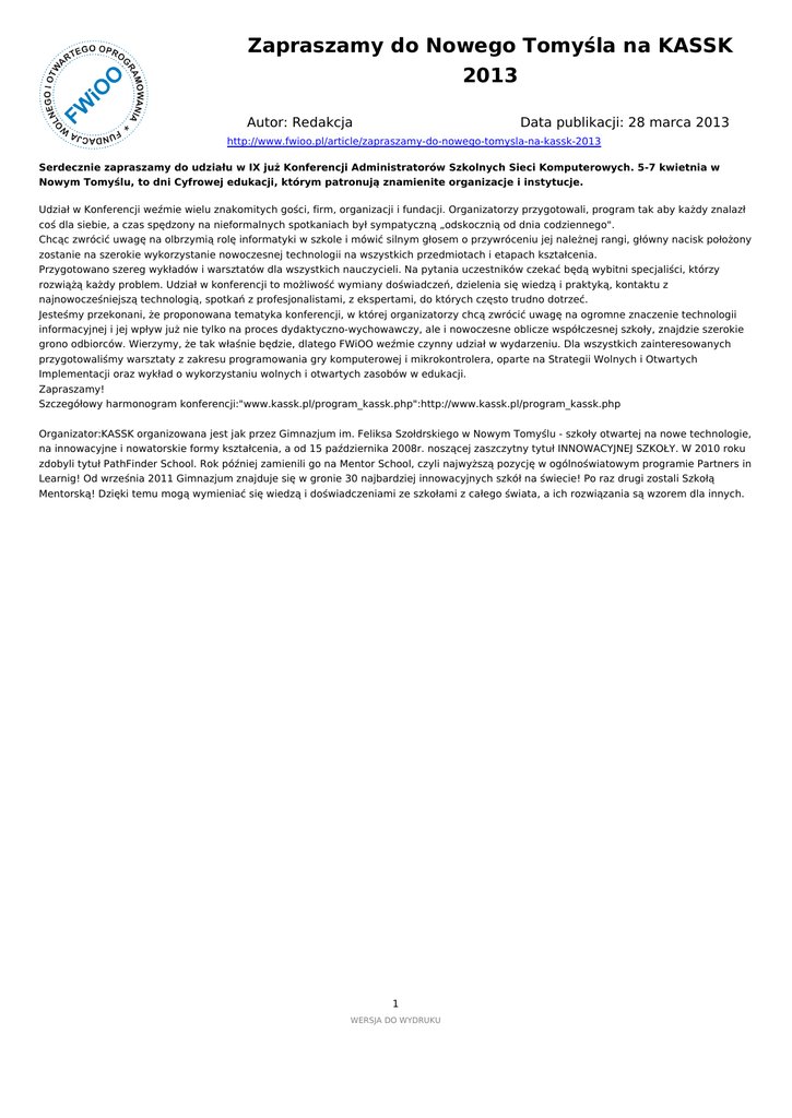 Zapraszamy do Nowego Tomyśla na KASSK 2013 Autor: Redakcja Data publikacji: 28 marca 2013 http://www.fwioo.pl/article/zapraszamy-do-nowego-tomysla-na-kassk-2013 Serdecznie zapraszamy do udziału w IX już Konferencji Administratorów Szkolnych Sieci Komputerowych. 5-7 kwietnia w Nowym Tomyślu, to dni Cyfrowej edukacji, którym patronują znamienite organizacje i instytucje. Udział w Konferencji weźmie wielu znakomitych gości, firm, organizacji i fundacji. Organizatorzy przygotowali, program tak aby każdy znalazł coś dla siebie, a czas spędzony na nieformalnych spotkaniach był sympatyczną „odskocznią od dnia codziennego". Chcąc zwrócić uwagę na olbrzymią rolę informatyki w szkole i mówić silnym głosem o przywróceniu jej należnej rangi, główny nacisk położony zostanie na szerokie wykorzystanie nowoczesnej technologii na wszystkich przedmiotach i etapach kształcenia. Przygotowano szereg wykładów i warsztatów dla wszystkich nauczycieli. Na pytania uczestników czekać będą wybitni specjaliści, którzy rozwiążą każdy problem. Udział w konferencji to możliwość wymiany doświadczeń, dzielenia się wiedzą i praktyką, kontaktu z najnowocześniejszą technologią, spotkań z profesjonalistami, z ekspertami, do których często trudno dotrzeć. Jesteśmy przekonani, że proponowana tematyka konferencji, w której organizatorzy chcą zwrócić uwagę na ogromne znaczenie technologii informacyjnej i jej wpływ już nie tylko na proces dydaktyczno-wychowawczy, ale i nowoczesne oblicze współczesnej szkoły, znajdzie szerokie grono odbiorców. Wierzymy, że tak właśnie będzie, dlatego FWiOO weźmie czynny udział w wydarzeniu. Dla wszystkich zainteresowanych przygotowaliśmy warsztaty z zakresu programowania gry komputerowej i mikrokontrolera, oparte na Strategii Wolnych i Otwartych Implementacji oraz wykład o wykorzystaniu wolnych i otwartych zasobów w edukacji. Zapraszamy! Szczegółowy harmonogram konferencji:"www.kassk.pl/program_kassk.php":http://www.kassk.pl/program_kassk.php Organizator:KASSK organizowana jest jak przez Gimnazjum im. Feliksa Szołdrskiego w Nowym Tomyślu - szkoły otwartej na nowe technologie, na innowacyjne i nowatorskie formy kształcenia, a od 15 października 2008r. noszącej zaszczytny tytuł INNOWACYJNEJ SZKOŁY. W 2010 roku zdobyli tytuł PathFinder School. Rok później zamienili go na Mentor School, czyli najwyższą pozycję w ogólnoświatowym programie Partners in Learnig! Od września 2011 Gimnazjum znajduje się w gronie 30 najbardziej innowacyjnych szkół na świecie! Po raz drugi zostali Szkołą Mentorską! Dzięki temu mogą wymieniać się wiedzą i doświadczeniami ze szkołami z całego świata, a ich rozwiązania są wzorem dla innych. 1 WERSJA DO WYDRUKU