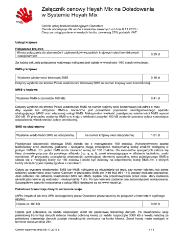 Załącznik cenowy Heyah Mix na Doładowania w Systemie Heyah Mix Cennik usług telekomunikacyjnych Operatora Cennik obowiązuje dla umów i aneksów zawartych od dnia 6.11.2013 r. Ceny za usługi podane w kwotach brutto, zawierają 23% podatek VAT Usługi krajowe Połączenia krajowe Minuta połączenia do abonentów i użytkowników wszystkich krajowych sieci komórkowych i stacjonarnych 0,29 zł Za każdą sekundę połączenia krajowego naliczana jest opłata w wysokości 1/60 stawki minutowej. SMS-y krajowe Wysłanie wiadomości tekstowej SMS 0,18 zł Dotyczy wysłania na terenie Polski wiadomości tekstowej SMS na numer krajowy sieci komórkowej. MMS-y krajowe Wysłanie MMS-a (za każde 100 kB) 0,41 zł Dotyczy wysłania na terenie Polski wiadomości MMS na numer krajowy sieci komórkowej lub adres e-mail. Aby wysłać lub otrzymać MMS-a, konieczne jest posiadanie poprawnie skonfigurowanego aparatu obsługującego MMS oraz włączonej usługi MMS. Maksymalna wielkość pojedynczej wiadomości MMS wynosi 300 kB. W przypadku wysłania MMS-a w kraju o wielkości powyżej 100 kB zostanie pobrana opłata stanowiąca odpowiednią wielokrotność opłaty cennikowej. SMS na stacjonarny Wysłanie wiadomości SMS na stacjonarny na numer krajowy sieci stacjonarnej 1,01 zł Pojedyncza wiadomość tekstowa SMS składa się z maksymalnie 160 znaków. Wykorzystywany aparat telefoniczny oraz elementy graficzne i specjalne mogą zmniejszać maksymalną liczbę znaków dostępną w jednym SMS-ie, tzn. jeden SMS może zawierać mniej niż 160 znaków. Do elementów specjalnych zalicza się litery charakterystyczne dla polskiego alfabetu (np. ą, ę, ł), znaki niewystępujące w alfabecie łacińskim, znaki narodowe. W przypadku przesyłania wiadomości zawierającej elementy specjalne, tekst pojedynczego SMS-a składa się z mniejszej liczby niż 160 znaków i może być dzielony na odpowiednią liczbę SMS-ów, z których każdy obciążany jest opłatą zgodnie z cennikiem. Opłaty za wysłanie wiadomości SMS lub MMS naliczane są niezależnie od tego, czy numer telefonu lub adres odbiorcy wiadomości oraz numer Centrum w przypadku SMS-ów (+48 602 951 111) zostały wpisane poprawnie. Jeśli odbiorca nie odbierze wiadomości SMS lub MMS, będzie ona przechowywana przez czas, który nadawca określił jako termin jej ważności - maksymalnie 7 dni. Po tym terminie zostanie ona automatycznie wykasowana. Szczegółowe warunki korzystania z usług MMS dostępne są na www.heyah.pl. Pakietowa transmisja danych na terenie kraju (APN: heyah.pl lub inny APN udostępniony przez Operatora przeznaczony do połączeń z Internetem ogólnego użytku) Opłata za 100 kB 0,02 zł Opłata jest pobierana za każde rozpoczęte 3000 kB pakietowej transmisji danych. Po zakończeniu sesji pakietowej transmisji danych różnica miedzy pobraną kwotą za każde rozpoczęte 3000 kB a kwotą należną za pakietową transmisję danych zostaje niezwłocznie zwrócona na konto klienta. Zwrot kwoty może nastąpić w terminie maksymalnie 24h. Cennik ważny od dnia 06.11.2013 r. 1/4 Opłata za 100 kB, naliczana jest łącznie za dane wysłane i odebrane na poziomie protokołu internetowego (IP). Po zakończeniu połączenia lub o godz. 24.00 dane są zaokrąglane w górę, do pełnej jednostki taryfikacyjnej. Warunkiem korzystania z usługi jest posiadanie stanu konta na kwotę co najmniej 0,60 zł dla każdego połączenia oraz posiadanie skonfigurowanego aparatu umożliwiającego Pakietową transmisję danych oraz aktywnej usługi pakietowej transmisji danych. Szczegółowe warunki korzystania z usługi dostępne są na www.heyah.pl Poczta głosowa *1111 lub 888001111 Połączenie krajowe z numerem Poczty głosowej, w tym odsłuchanie wiadomości bezpłatne na terenie Polski Poczta głosowa dzwoni do Abonenta Heyah Mix bezpłatnie na terenie Polski SMS powiadamiający o próbie połączenia bezpłatny W przypadku niekorzystania z usługi Poczta głosowa przez okres 3 miesięcy usługa zostaje wyłączona, ponowna aktywacja jest bezpłatna. Bezpośrednie zostawienie wiadomości w Poczcie głosowej (połączenie z numerem 888000011) na terenie Polski - płatne jak za połączenie do Abonenta Heyah Mix. Warunkowe przeniesienie połączeń do Poczty głosowej na terenie Polski jest bezpłatne. Usługi międzynarodowe Połączenia do STREFY 1 Połączenia do STREFY 2 Połączenia do STREFY 3 Połączenia do sieci satelitarnych SMS międzynarodowy MMS międzynarodowy (za każde 100 kB) Połączenia do STREFY 1a 0,59 zł Połączenia do STREFY 1b 1,71 zł 2,20 zł 4,17 zł 10,82 zł 0,62 zł 2,46 zł Połączenia głosowe - wybrany numer należy poprzedzić prefiksem „+” lub „00”. SMS-y i MMS-y - wybrany numer należy poprzedzić prefiksem „+”. Lista krajów i stref STREFA 1a STREFA 1 b STREFA 2 STREFA 3 Lista sieci satelitarnych Austria, Azory, Belgia, Bułgaria, Cypr, Czechy, Dania, Estonia, Finlandia, Francja, Gibraltar, Grecja, Gujana Francuska, Gwadelupa, Hiszpania, Holandia, Irlandia, Islandia, Liechtenstein, Litwa, Luksemburg, Łotwa, Madera, Malta, Martynika, Niemcy, Norwegia, Portugalia, Reunion, Rumunia, Słowacja, Słowenia, Szwecja, Watykan, Węgry, Wielka Brytania, Włochy, Wyspy Kanaryjskie Albania, Andora, Białoruś, Bośnia i Hercegowina, Chorwacja, Czarnogóra, Macedonia, Mołdawia, Monako, Rosja, San Marino, Serbia, Szwajcaria, Ukraina, Wyspy Owcze Algieria, Armenia, Australia, Azerbejdżan, Egipt, Gruzja, Izrael, Kanada, Kazachstan, Kirgizja, Maroko, Nowa Zelandia, Tadżykistan, Tunezja, Turcja, USA, Uzbekistan, Wietnam Pozostałe kraje Emsat, Inmarsat, Iridium, Thuraya Opłaty za połączenia międzynarodowe naliczane są za każdą rozpoczętą minutę. Połączenia międzynarodowe oraz możliwość wysyłania wiadomości SMS i MMS do niektórych krajów mogą być ograniczone. Maksymalna wielkość pojedynczej wiadomości MMS międzynarodowy wynosi 300 kB. W przypadku wysłania MMS-a międzynarod