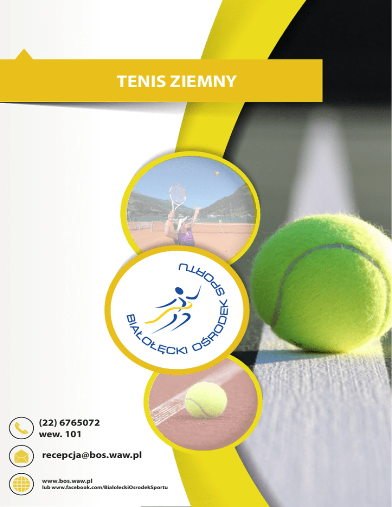 TENIS ZIEMNY (22) 6765072 wew. 101 [email protected] www.bos.waw.pl lub www.facebook.com/BialoleckiOsrodekSportu CENNIK CZAS * KLIENCI INDYWIDUALNI**** KLUBY ***** PONIEDZIAŁEK WTOREK ŚRODA CZWARTEK PIĄTEK SOBOTA NIEDZIELA 60 min. 60 min. KORT TENISOWY DZIEŃ** WIECZÓR*** 26,00 zł karnet 10 wejść: 185,00 zł. - - 7:00 - 21:00 KORT TENISOWY o łącznej powierzchni 688 m2 Arena o wymiarach 36,6 x 18,6 m z pełnowymiarowym kortem do gry deblowej z nawierzchnią z trawy syntetycznej w kolorze ceglastym i zielonym o wysokości włókien 20 mm z zasypką piaskiem kwarcowym typ Edel Elite LSR 20, certyfikowana przez SONY DSCMiędzynarodową Federację Tenisową (ITF) jako nawierzchnia 3 klasy szybkości.. Dodatkowa powierzchnia 335 m2 przy ściance treningowej z wyznaczoną połowa kortu z nawierzchnią jak na korcie głównym.