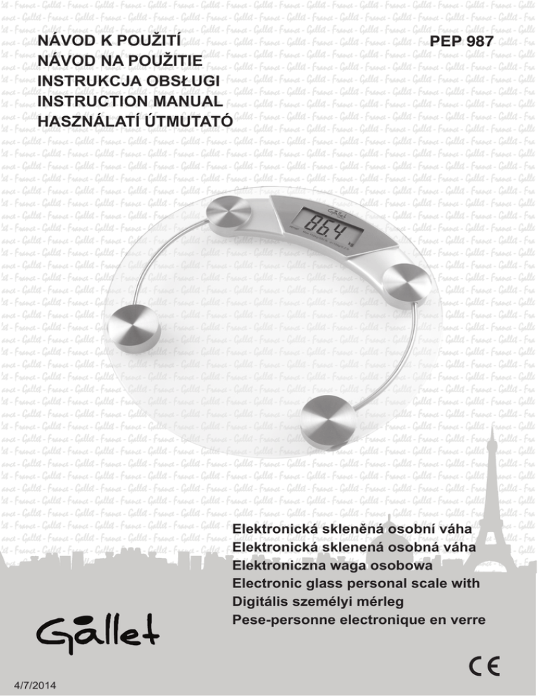 NÁVOD K POUŽITÍ NÁVOD NA POUŽITIE Instrukcja obsługi INSTRUCTION MANUAL HASZNÁLATÍ ÚTMUTATÓ PEP 987 Elektronická skleněná osobní váha Elektronická sklenená osobná váha Elektroniczna waga osobowa Electronic glass personal scale with Digitális személyi mérleg Pese-personne electronique en verre 4/7/2014 Vážený zákazníku, děkujeme Vám za zakoupení našeho produktu. Před uvedením tohoto přístroje do provozu si velmi pozorně přečtěte návod k obsluze a tento návod spolu se záručním listem, pokladním dokladem a podle možností i s obalem a vnitřním obsahem obalu dobře uschovejte. Všeobecné bezpečnostní pokyny • Používejte tento přístroj výlučně pro soukromou potřebu a pro stanovené účely. Tento přístroj není určen pro komerční použití. • Chraňte ho před horkem, přímým slunečním zářením, vlhkostí (v žádném případě jej neponořujte do kapalin) a stykem s ostrými hranami. Nepoužívejte přístroj v případě, že máte vlhké ruce. Vyvarujte se styku s vodou. • Přístroj vypněte jestliže ho nebudete používat, nebo v případě poruchy. • Neopravujte přístroj vlastními silami, nýbrž vyhledejte autorizovaný servis. • Respektujte, prosím, následující „Speciální bezpečnostní pokyny pro tento přístroj“. Speciální bezpečnostní pokyny pro tento přístroj • Přístroj používejte pouze v souladu s parametry uvedenými na štítku přístroje. • Přístroj nepokládejte na mokrá místa a vyvarujte váhu styku s vodou, může to poškodit elektroniku. • Povrch čistěte jen suchým hadříkem. Abyste předešli poškození přístroje, zabraňte styku přístroje s vodou a ani nepoužívejte čistící prostředky. • Váhu vždy používejte na tvrdém, rovném povrchu. NEPOUŽÍVEJTE ji na koberci. • NEPOUŽÍVEJTE váhu na mokré a kluzké podlaze. NESTOUPEJTE na okraj váhy. Měřící plocha váhy je kluzká v případě, že je mokrá. Udržujte ji v suchu! • Vždy se važte na stejném místě. Nerovná plocha může ovlivňovat údaje. • Vždy se važte bez oděvů, bez obuvi a před jídlem. Ideální čas pro vážení je hned po ránu. • Vaše váha zaokrouhluje naměřenou hodnotu nahoru nebo dolů k nebližším s rozdělením 100g. • Pokud nebudete váhu delší dobu používat, vyjměte baterie. • Pro zajištění přesnosti měření NEPOUŽÍVEJTE váhu v prostředí se silným elektromagnetickým polem. • NEPOUŽÍVEJTE váhu na místech se silnými otřesy, neskákejte na ní. Při měření stůjte na váze klidně. • Přístroj nepouštějte z výšky na zem, pokládejte. Vyvaruj přístroj nárazům a nešetrným zacházením. Váha obsahuje citlivé přesné měřící zařízení. • Tento spotřebič není určen pro používání osobami (včetně dětí), jimž fyzická, smyslová, nebo mentální neschopnost či nedostatek zkušeností a znalostí zabraňuje v bezpečném používání spotřebiče, pokud na ně nebude dohlíženo nebo pokud nebyly instruovány ohledně použití spotřebiče osobou zodpovědnou za jejich bezpečnost. • Na děti by se mělo dohlížet, aby se zajistilo, že si nebudou se spotřebičem hrát. CZ - 2 CZ Popis ovládacích prvků P1. Jednotka váhy P2. Displej P3. Skleněná plocha Pokyny k použití Baterie Součást balení je 1 ks baterie CR2032. Před prvním použitím otevřete kryt baterie umístěn na spodní straně váhy a odstraňte vytažením izolační proužek v prostoru pod baterií. Výměna baterie Vložení: 1) Otevřete kryt baterie umístěn na zadní straně váhy. 2) Vložte bateri CR 2032 do prostoru pro baterie jak je zobrazeno na obrázku a baterii zatlačte až zapadne mezi kontakty. Poté uzavřete krytem baterií. Vyjmutí: 1) Otevřete kryt baterie umístěn na zadní straně váhy. 2) Zatlačte na černý výstupek na okraji prostoru baterie. Baterie se uvolní. Pro vyjmuti použijte tenký úzký předmět. Při výměně dodržte správnou polaritu baterie. CZ - 3 Použití Položte váhu na rovnou tvrdou plochu (vyvarujte se koberců nebo jiných měkkých povrchů). Postavte sa na váhu, tím sa váha automaticky zapne. Nehýbejte se a počkejte na zvážení. Potom sa na displeji zobrazí naměřená hmotnost a zůstane chvíli zobrazená. Automatické vypnutí Po sestoupení z váhy se bude zobrazovat naměřená hodnota hmotnosti a poté se váha vypne. Pokud se při zobrazování „0.0“ na displeji nepostavíte na váhu, váha se po 10 sekundách automaticky vypne. Poznámka: Při přemístění váhy na jiné místo se může při prvním zapnutí projevit chyba při nulování. Ponechte váhu v klidu pro její vypnutí a poté zapněte nášlapem. Přepínání jednotek vážení Na spodní straně jednotky váhy je přepínač jednotek vážení. Pohybem přepínače vpravo nebo vlevo můžete měnit jednotky vážení mezi kg - lb. CZ - 4 CZ Odstraňování poruch Varovné indikátory Na displeji se zobrazují varovné symboly pro upřesnění chyb vzniklé při používání váhy. Pro odstranění jednoduše sestupte z váhy, případně ji ponechte vypnout a znovu zapněte. Pokud se po nášlapu displej nerozsvítí nebo se zobrazuje „LO“ jsou baterie slabé. Vyměňte je za nové. Přetížení váhy je zobrazováno na displeji: Pokud se na displeji po sestoupeni z váhy zobrazí „ C “ nastala chyba vážení. Proveďte vážení ještě jednou. Možné příčiny nesprávné funkce • Zkontrolujte správné umístění baterie, polaritu. • V případě slabé baterie ji vyměňte za novou. • Zkontrolujte, zda je váha umístěna na tvrdém rovném povrchu a nedotýká se stěny. Čištění a údržba 1) Váhu čistěte suchou nebo mírně navlhčenou měkkou látkou. NEPONOŘUJTE ji do vody a nepoužívejte pro čistění chemické čistící prostředky, líh, nebo technický benzín. 2) Povrch váhy po očištění může být 
