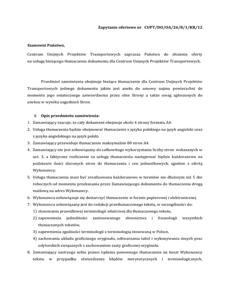 Zapytanie ofertowe nr CUPT/DO/OA/26/8/1/KR/12 Szanowni Państwo, Centrum Unijnych Projektów Transportowych zaprasza Państwa do złożenia oferty na usługę bieżącego tłumaczenia dokumentu dla Centrum Unijnych Projektów Transportowych. Przedmiot zamówienia obejmuje bieżące tłumaczenie dla Centrum Unijnych Projektów Transportowych jednego dokumentu jakim jest aneks do umowy najmu powierzchni do momentu jego ostatecznego zatwierdzenia przez obie Strony a także uwag zgłoszonych do aneksu w wyniku uzgodnień Stron. I. Opis przedmiotu zamówienia: 1. Zamawiający szacuje, że cały dokument obejmuje około 4 strony formatu A4. 2. Usługa tłumaczenia będzie obejmować tłumaczenie z języka polskiego na język angielski oraz z języka angielskiego na język polski. 3. Zamawiający przewiduje tłumaczenie maksymalnie 80 stron A4. 4. Zamawiający nie jest zobowiązany do całkowitego wykorzystania liczby stron wskazanych w ust. 3, a faktyczne rozliczenie za usługę tłumaczenia następować będzie każdorazowo na podstawie ilości zleconych stron do tłumaczenia i cen jednostkowych, zgodnie z ofertą Wykonawcy. 5. Usługa tłumaczenia musi być zrealizowana każdorazowo w terminie nie dłuższym niż 5 dni roboczych od momentu przekazania przez Zamawiającego dokumentu do tłumaczenia drogą mailową na adres Wykonawcy. 6. Wykonawca zobowiązuje się dostarczyć tłumaczenie w formie papierowej i elektronicznej. 7. Wykonawca zobowiązany jest do redakcji przetłumaczonego tekstu, w szczególności do: 1) stosowania prawidłowej terminologii właściwej dla tłumaczonego tekstu, 2) zapewnienia jednolitości zastosowanego słownictwa i frazeologii wszystkich tłumaczonych tekstów, 3) zapewnienia zgodności terminologii z terminologią stosowaną w Polsce, 4) zachowania układu graficznego oryginału, odtwarzania tabel i wykonywania innych prac edytorskich związanych z zachowaniem szaty graficznej oryginału. 8. Zamawiający zastrzega sobie prawo żądania ponownego tłumaczenia na koszt Wykonawcy tekstu w przypadku stwierdzenia błędów merytorycznych i terminologicznych, uniemożliwiających wykorzystanie tekstu – w terminie 7 dni kalendarzowych od daty zgłoszenia błędu przez Zamawiającego. 9. Wykonawca zobowiązuje się w ramach wynagrodzenia do przeniesienia na Zamawiającego autorskich praw majątkowych przetłumaczonego tekstu lub jego fragmentów, na następujących polach eksploatacji: 1) użytkowanie, 2) kopiowanie (zwielokrotnienie dowolną techniką), 3) modyfikowanie 4) przetwarzanie, 5) wprowadzenie do obrotu, 6) utrwalanie, 7) wprowadzanie do pamięci komputera oraz wyświetlanie na monitorze komputera. II. Formularz cenowy 1. Oferta powinna zawierać: 1.1 Kalkulację cenową obejmującą całkowity koszt usługi według wg poniższego zestawienia: Przedmiot zamówienia Cena jedn. netto w PLN Stawka VAT (%) Cena jedn. brutto w PLN Liczba stron A4 1 strona tłumaczenia (1800 znaków) tekstu zwykłego z języka polskiego na język angielski 40 1 strona tłumaczenia (1800 znaków) tekstu zwykłego z języka angielskiego na język polski 40 Redakcja 1 strony przetłumaczonego tekstu zwykłego (1 800 znaków) 80 Autorskie prawa majątkowe 1 strona tłumaczenia (1800 znaków) 80 Wartość brutto w PLN RAZEM 1.2. Cena powinna być podana z dokładnością do dwóch miejsc po przecinku. 1.3. Termin ważności oferty. 1.4. Wykonawca zobowiązany jest dołączyć do oferty wykaz co najmniej trzech zrealizowanych w ciągu dwóch ostatnich lat, usług tłumaczenia z zakresu przepisów Kodeksu Cywilnego obejmujących tłumaczenie z języka polskiego na język angielski lub z języka angielskiego na język polski – zgodnie z poniższym wzorem: WYKAZ DOŚWIADCZENIA Rodzaj i zakres realizowanego tłumaczenia (należy podać liczbę stron tłumaczonego dokumentu i język tłumaczenia) Nazwa i adres Odbiorcy 1 2 Czas realizacji Od Do 4 5 2. Ofertę cenową należy przesłać do CUPT najpóźniej do dnia 28.02.2012 r. do godziny 12:00 mailem na adres : [email protected] 3. W tytule maila proszę podać nr sprawy CUPT/DO/OA/26/8/1/KR/12. INFORMACJE DODATKOWE: 1. Kryterium, którym zamawiający będzie kierował się przy wyborze oferty jest cena oraz doświadczenie Wykonawcy. 2. W celu zapewnienia porównywalności wszystkich ofert, Zamawiający zastrzega sobie prawo do skontaktowania się z właściwymi Oferentami w celu uzupełnienia lub doprecyzowania ofert. 3. Zamawiający zastrzega sobie prawo do odpowiedzi tylko na wybraną ofertę. 4. Zamawiający dokonuje płatności na podstawie faktur przelewowych, wystawionych z co najmniej 14-dniowym terminem płatności. 5. Z wyłonionym wykonawcą zostanie zawarta pisemna umowa na podstawie własnych wzorów umów stosowanych w CUPT. Niniejsza oferta nie stanowi oferty w myśl art. 66 Kodeksu Cywilnego, jak również nie jest ogłoszeniem w rozumieniu ustawy Prawo zamówień publicznych.