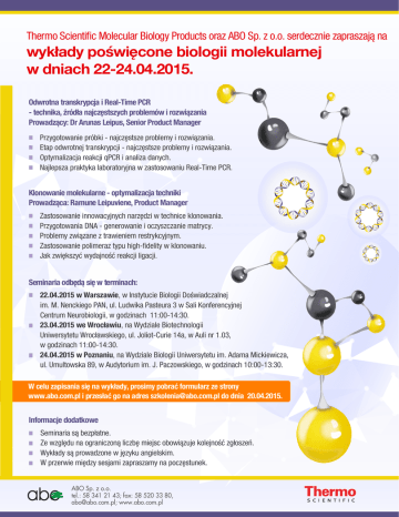 Thermo Scientific Molecular Biology Products oraz ABO Sp. z o.o. serdecznie zapraszają na wykłady poświęcone biologii molekularnej w dniach 22-24.04.2015. Odwrotna transkrypcja i Real-Time PCR - technika, źródła najczęstszych problemów i rozwiązania Prowadzący: Dr Arunas Leipus, Senior Product Manager Przygotowanie próbki - najczęstsze problemy i rozwiązania. Etap odwrotnej transkrypcji - najczęstsze problemy i rozwiązania. Optymalizacja reakcji qPCR i analiza danych. Najlepsza praktyka laboratoryjna w zastosowaniu Real-Time PCR. Klonowanie molekularne - optymalizacja techniki Prowadząca: Ramune Leipuviene, Product Manager Zastosowanie innowacyjnych narzędzi w technice klonowania. Przygotowania DNA - generowanie i oczyszczanie matrycy. Problemy związane z trawieniem restrykcyjnym. Zastosowanie polimeraz typu high-fidelity w klonowaniu. Jak zwiększyć wydajność reakcji ligacji. Seminaria odbędą się w terminach: 22.04.2015 w Warszawie, w Instytucie Biologii Doświadczalnej im. M. Nenckiego PAN, ul. Ludwika Pasteura 3 w Sali Konferencyjnej Centrum Neurobiologii, w godzinach 11:00-14:30. 23.04.2015 we Wrocławiu, na Wydziale Biotechnologii Uniwersytetu Wrocławskiego, ul. Joliot-Curie 14a, w Auli nr 1.03, w godzinach 11:00-14:30. 24.04.2015 w Poznaniu, na Wydziale Biologii Uniwersytetu im. Adama Mickiewicza, ul. Umultowska 89, w Audytorium im. J. Paczowskiego, w godzinach 10:00-13:30. W celu zapisania się na wykłady, prosimy pobrać formularz ze strony www.abo.com.pl i przesłać go na adres [email protected] do dnia 20.04.2015. Informacje dodatkowe Seminaria są bezpłatne. Ze względu na ograniczoną liczbę miejsc obowiązuje kolejność zgłoszeń. Wykłady są prowadzone w języku angielskim. W przerwie między sesjami zapraszamy na poczęstunek. ABO Sp. z o.o. tel.: 58 341 21 43; fax: 58 520 33 80, [email protected]; www.abo.com.pl
