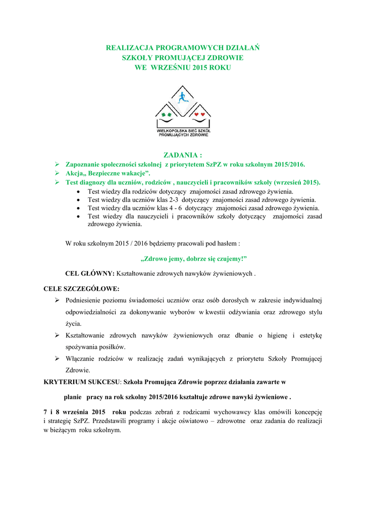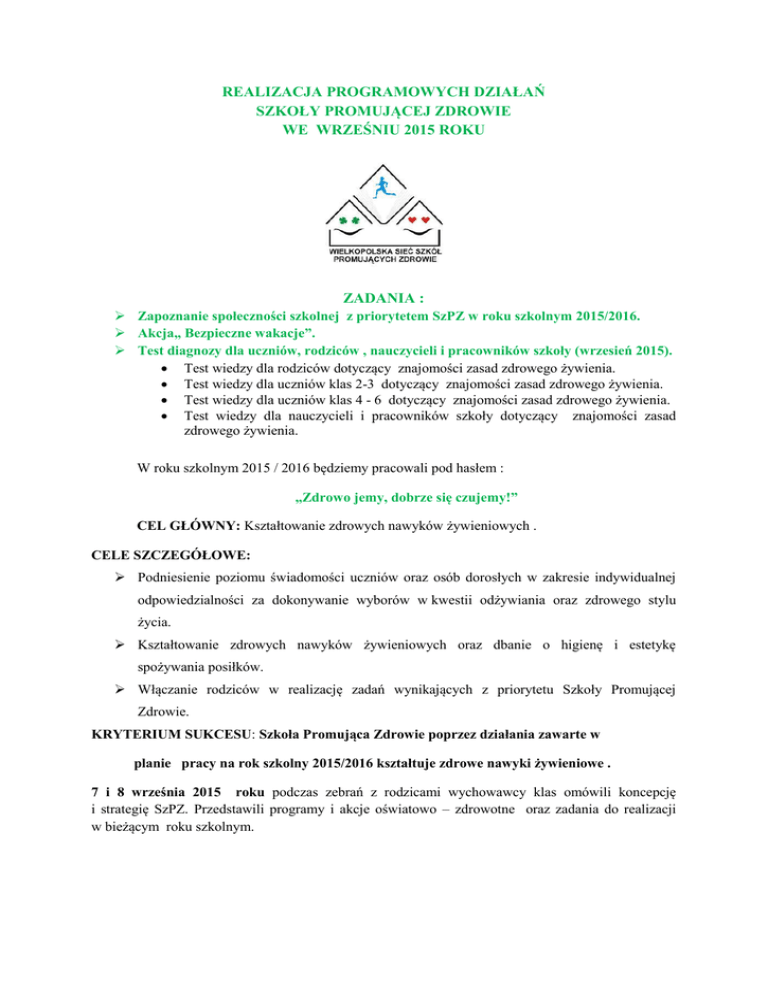 REALIZACJA PROGRAMOWYCH DZIAŁAŃ SZKOŁY PROMUJĄCEJ ZDROWIE WE WRZEŚNIU 2015 ROKU ZADANIA : Zapoznanie społeczności szkolnej z priorytetem SzPZ w roku szkolnym 2015/2016. Akcja„ Bezpieczne wakacje”. Test diagnozy dla uczniów, rodziców , nauczycieli i pracowników szkoły (wrzesień 2015). Test wiedzy dla rodziców dotyczący znajomości zasad zdrowego żywienia. Test wiedzy dla uczniów klas 2-3 dotyczący znajomości zasad zdrowego żywienia. Test wiedzy dla uczniów klas 4 - 6 dotyczący znajomości zasad zdrowego żywienia. Test wiedzy dla nauczycieli i pracowników szkoły dotyczący znajomości zasad zdrowego żywienia. W roku szkolnym 2015 / 2016 będziemy pracowali pod hasłem : „Zdrowo jemy, dobrze się czujemy!” CEL GŁÓWNY: Kształtowanie zdrowych nawyków żywieniowych . CELE SZCZEGÓŁOWE: Podniesienie poziomu świadomości uczniów oraz osób dorosłych w zakresie indywidualnej odpowiedzialności za dokonywanie wyborów w kwestii odżywiania oraz zdrowego stylu życia. Kształtowanie zdrowych nawyków żywieniowych oraz dbanie o higienę i estetykę spożywania posiłków. Włączanie rodziców w realizację zadań wynikających z priorytetu Szkoły Promującej Zdrowie. KRYTERIUM SUKCESU: Szkoła Promująca Zdrowie poprzez działania zawarte w planie pracy na rok szkolny 2015/2016 kształtuje zdrowe nawyki żywieniowe . 7 i 8 września 2015 roku podczas zebrań z rodzicami wychowawcy klas omówili koncepcję i strategię SzPZ. Przedstawili programy i akcje oświatowo – zdrowotne oraz zadania do realizacji w bieżącym roku szkolnym. PROGRAMY OŚWIATOWO – ZDROWOTNE REALIZOWANE w klasach 1-6 1. „ Nie pal przy mnie, proszę” Program obejmuje profilaktykę antytytoniową, mającą na celu wykształcenie u dzieci świadomej umiejętności radzenia sobie w sytuacjach, w których inne osoby palą przy nich papierosy. 2. „ Moje dziecko idzie do szkoły” Program ma na celu podniesienie poziomu wiedzy rodziców i uczniów na temat wybranych elementów zdrowego stylu życia, w tym: prawidłowego żywienia, otyłości, wymogów sanitarnych przy przygotowaniu i spożywaniu posiłków, wad wymowy, szczepień ochronnych, także higieny: osobistej, jamy ustnej, wzroku, pracy. 3. „ Owoce i warzywa w szkole” Program, którego celem jest zmiana nawyków żywieniowych uczniów poprzez zwiększenie udziału owoców i warzyw w ich codziennej diecie. 4. „ Szklanka mleka” Program, dzięki któremu uczniowie kształtują dobre nawyki żywieniowe poprzez spożycie mleka i przetworów mlecznych. 5. „ Fluoryzacja” Program realizowany w trosce o zdrowie jamy ustnej i ochronę przed próchnicą. W ciągu roku przeprowadza się 6 zabiegów fluoryzacji w odstępie co 6 tygodni każdy. Jest to bardzo ważny rodzaj profilaktyki próchnicy, gdyż podczas fluoryzacji dziecko również nabywa prawidłowych nawyków mycia i szczotkowania zębów. 6. „Znajdź właściwe rozwiązanie” Program obejmuje profilaktykę antytytoniową. Cele programu opierają się głównie na psychospołecznych mechanizmach kształtujących postawy i zachowania uczniów. 7. „ Trzymaj formę” Celem działań w ramach programu jest edukacja w zakresie trwałego kształtowania prozdrowotnych nawyków wśród młodzieży poprzez promocję aktywnego stylu życia i zbilansowanej diety, w oparciu o indywidualną odpowiedzialność i wolny wybór jednostki. 8. „ Szkolny Program Edukacji Zdrowotnej” ZADANIA DO REALIZACJI ZAWARTE W PLANIE PRACY SzPZ: Projekt rządowy „ Bezpieczna i przyjazna szkoła” Akcja „Wspólne drugie śniadanie” Dzień Walki z Otyłością Badanie wskaźnika BMI Akcja Dzień Zdrowego Śniadania:„ Śniadanie daje moc” Akcja „Jogurtowy dzień” Konkurs plastyczny dla uczniów klas 1-3 „5 kolorów dobrej diety” Wykonanie plakatów „ Śmietnik niezdrowych produktów” Europejski Dzień Walki z Otyłością „Światowy Dzień Zdrowia”. W holu szkoły została umieszczona gazetka promująca zdrowy styl odżywiania. Na początku września został przeprowadzony szkolny etap konkursu plastycznego „Moje Bezpieczne Wakacje 2015”. Organizatorem konkursu jest Fundacja „Bezpieczne Wakacje” z siedzibą w Szczecinie. Celem ogólnopolskiej akcji „Bezpieczne Wakacje”jest zwiększenie poziomu bezpieczeństwa podczas spędzania wolnego czasu przez dzieci, młodzież i dorosłych. Akcja adresowana jest do dzieci, młodzieży i dorosłych oraz do instytucji publicznych. Celem konkursu „Moje bezpieczne wakacje 2014” jest: a) popularyzacja wiedzy na temat bezpieczeństwa, b) uświadamianie dzieciom i młodzieży zagrożeń związanych z wakacyjnymi wyjazdami oraz poprawa bezpieczeństwa w okresie roku szkolnego, c) promocja bezpiecznych zachowań i form spędzania wolnego czasu. Zasady Konkursu polegały na przesłaniu drogą elektroniczną KUPONU KONKURSOWEGO fotografii zapisanej w pliku jpg, jpeg, o wielkości do 10MB dotyczącej tematu „Moje Bezpieczne Wakacje 2015. (Nie)znane atrakcje mojego regionu”. W klasach I-VI w konkursie brało udział 6 osób : • Franciszek Wołk- lat 12 • Julia Witczak – lat 7 • Katarzyna Barańska – lat 12 • Marta Wasielewska – lat 8 • Mateusz Baran – lat 10 • Aleksandra Michalak – lat 11 Wszystkie prace zostały zakwalifikowane i wysłane drogą elektroniczną. Szkolna komisja w składzie: Ewa Giżewska i Anna Szymańska zakwalifikowała i wysłała, zgodnie z regulaminem konkursu, 6 prac plastycznych. Czekamy na rozstrzygnięcie konkursu i trzymamy kciuki za naszych szkolnych laureatów! Kolejnym zadaniem z planu SzPZ była realizacja Projektu rządowego „Bezpieczna i przyjazna szkoła”. Po przeprowadzonej diagnozie potrzeb SzPZ na rok szkolny 2015 / 2016 ustalono priorytet „ Zdrowe odżywianie”. Zaplanowany projekt wpłynie korzystnie na wynik ewaluacji, a tym samym będzie sprzyjał podniesieniu jakości pracy szkoły. Projekt, którego autorką jest pani Ewa Giżewska, doskonale wpisu