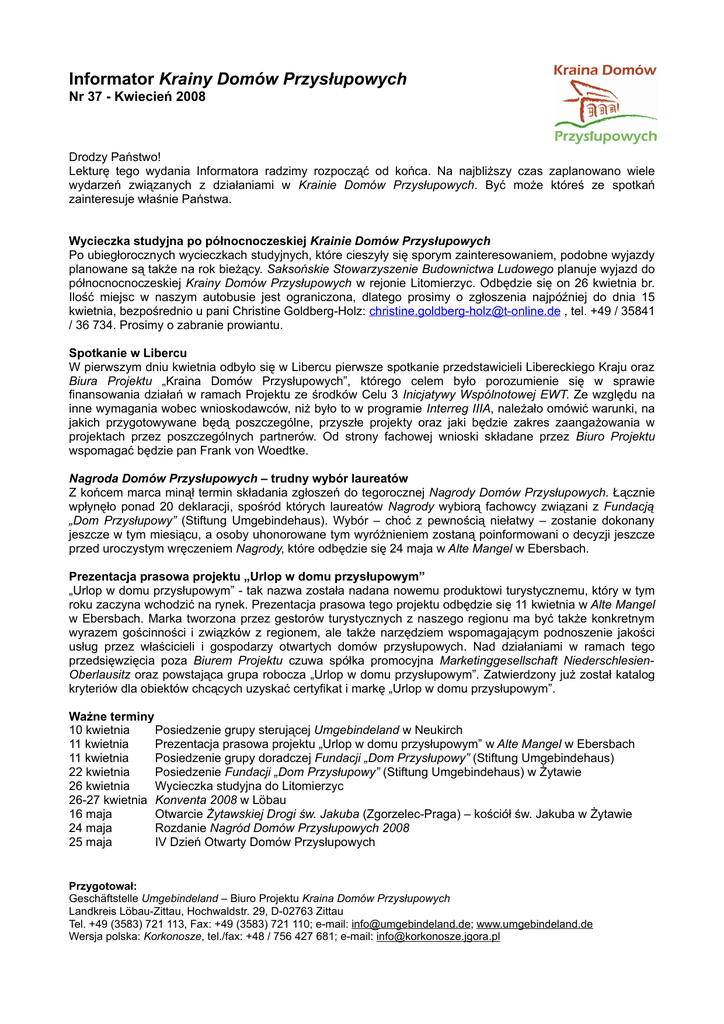 Informator Krainy Domów Przysłupowych Nr 37 - Kwiecień 2008 Drodzy Państwo! Lekturę tego wydania Informatora radzimy rozpocząć od końca. Na najbliższy czas zaplanowano wiele wydarzeń związanych z działaniami w Krainie Domów Przysłupowych. Być może któreś ze spotkań zainteresuje właśnie Państwa. Wycieczka studyjna po północnoczeskiej Krainie Domów Przysłupowych Po ubiegłorocznych wycieczkach studyjnych, które cieszyły się sporym zainteresowaniem, podobne wyjazdy planowane są także na rok bieżący. Saksońskie Stowarzyszenie Budownictwa Ludowego planuje wyjazd do północnocnoczeskiej Krainy Domów Przysłupowych w rejonie Litomierzyc. Odbędzie się on 26 kwietnia br. Ilość miejsc w naszym autobusie jest ograniczona, dlatego prosimy o zgłoszenia najpóźniej do dnia 15 kwietnia, bezpośrednio u pani Christine Goldberg-Holz: [email protected] , tel. +49 / 35841 / 36 734. Prosimy o zabranie prowiantu. Spotkanie w Libercu W pierwszym dniu kwietnia odbyło się w Libercu pierwsze spotkanie przedstawicieli Libereckiego Kraju oraz Biura Projektu „Kraina Domów Przysłupowych”, którego celem było porozumienie się w sprawie finansowania działań w ramach Projektu ze środków Celu 3 Inicjatywy Wspólnotowej EWT. Ze względu na inne wymagania wobec wnioskodawców, niż było to w programie Interreg IIIA, należało omówić warunki, na jakich przygotowywane będą poszczególne, przyszłe projekty oraz jaki będzie zakres zaangażowania w projektach przez poszczególnych partnerów. Od strony fachowej wnioski składane przez Biuro Projektu wspomagać będzie pan Frank von Woedtke. Nagroda Domów Przysłupowych – trudny wybór laureatów Z końcem marca minął termin składania zgłoszeń do tegorocznej Nagrody Domów Przysłupowych. Łącznie wpłynęło ponad 20 deklaracji, spośród których laureatów Nagrody wybiorą fachowcy związani z Fundacją „Dom Przysłupowy” (Stiftung Umgebindehaus). Wybór – choć z pewnością niełatwy – zostanie dokonany jeszcze w tym miesiącu, a osoby uhonorowane tym wyróżnieniem zostaną poinformowani o decyzji jeszcze przed uroczystym wręczeniem Nagrody, które odbędzie się 24 maja w Alte Mangel w Ebersbach. Prezentacja prasowa projektu „Urlop w domu przysłupowym” „Urlop w domu przysłupowym” - tak nazwa została nadana nowemu produktowi turystycznemu, który w tym roku zaczyna wchodzić na rynek. Prezentacja prasowa tego projektu odbędzie się 11 kwietnia w Alte Mangel w Ebersbach. Marka tworzona przez gestorów turystycznych z naszego regionu ma być także konkretnym wyrazem gościnności i związków z regionem, ale także narzędziem wspomagającym podnoszenie jakości usług przez właścicieli i gospodarzy otwartych domów przysłupowych. Nad działaniami w ramach tego przedsięwzięcia poza Biurem Projektu czuwa spółka promocyjna Marketinggesellschaft NiederschlesienOberlausitz oraz powstająca grupa robocza „Urlop w domu przysłupowym”. Zatwierdzony już został katalog kryteriów dla obiektów chcących uzyskać certyfikat i markę „Urlop w domu przysłupowym”. Ważne terminy 10 kwietnia Posiedzenie grupy sterującej Umgebindeland w Neukirch 11 kwietnia Prezentacja prasowa projektu „Urlop w domu przysłupowym” w Alte Mangel w Ebersbach 11 kwietnia Posiedzenie grupy doradczej Fundacji „Dom Przysłupowy” (Stiftung Umgebindehaus) 22 kwietnia Posiedzenie Fundacji „Dom Przysłupowy” (Stiftung Umgebindehaus) w Żytawie 26 kwietnia Wycieczka studyjna do Litomierzyc 26-27 kwietnia Konventa 2008 w Löbau 16 maja Otwarcie Żytawskiej Drogi św. Jakuba (Zgorzelec-Praga) – kościół św. Jakuba w Żytawie 24 maja Rozdanie Nagród Domów Przysłupowych 2008 25 maja IV Dzień Otwarty Domów Przysłupowych Przygotował: Geschäftstelle Umgebindeland – Biuro Projektu Kraina Domów Przysłupowych Landkreis Löbau-Zittau, Hochwaldstr. 29, D-02763 Zittau Tel. +49 (3583) 721 113, Fax: +49 (3583) 721 110; e-mail: [email protected]; www.umgebindeland.de Wersja polska: Korkonosze, tel./fax: +48 / 756 427 681; e-mail: [email protected]