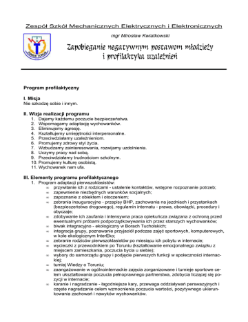 Zespół Szkół Mechanicznych Elektrycznych i Elektronicznych mgr Mirosław Kwiatkowski Zapobieganie negatywnym postawom młodzieży i profilaktyka uzależnień Program profilaktyczny I. Misja Nie szkodzę sobie i innym. II. Wizja realizacji programu 1. Dajemy kaŜdemu poczucie bezpieczeństwa. 2. Wspomagamy adaptację wychowanków. 3. Eliminujemy agresję. 4. Kształtujemy umiejętności interpersonalne. 5. Przeciwdziałamy uzaleŜnieniom. 6. Promujemy zdrowy styl Ŝycia. 7. Wzbudzamy zainteresowania, rozwijamy uzdolnienia. 8. Uczymy pracy nad sobą. 9. Przeciwdziałamy trudnościom szkolnym. 10. Promujemy kulturę osobistą. 11. Wychowanek nam ufa. III. Elementy programu profilaktycznego 1. Program adaptacji pierwszoklasistów: • przywitanie ich z rodzicami - ustalenie kontaktów, wstępne rozpoznanie potrzeb; • zapewnienie niezbędnych warunków socjalnych; • zapoznanie z obiektem i otoczeniem; • zebrania inauguracyjne - przepisy BHP, zachowania na jezdniach i przystankach (bezpieczeństwa drogowego), regulamin internatu - prawa, obowiązki, procedury i obyczaje; • zdobywanie ich zaufania i intensywna praca opiekuńcza związana z ochroną przed ewentualnymi próbami podporządkowywania ich przez starszych wychowanków; • biwak integracyjno - ekologiczny w Borach Tucholskich; • integracja grupy, poznawanie przyjaciół podczas zajęć sportowych, komputerowych, w kole ekologicznym InterEko; • zebranie rodziców pierwszoklasistów po miesiącu ich pobytu w internacie; • wycieczki z przewodnikiem po Toruniu (kształtowanie emocjonalnego związku z miejscem zamieszkania, poczucia bycia u siebie); • wybory do samorządu grupy i podjęcie pierwszych funkcji w społeczności internackiej; • turniej Wiedzy o Toruniu; • zaangaŜowanie w ogólnointernackie zajęcia zorganizowane i turnieje sportowe celem ukształtowania poczucia pełnoprawnego partnerstwa, zdobycia liczącej się pozycji w internacie; • karanie i nagradzanie - łagodniejsze kary, przewaga oddziaływań perswazyjnych i częste nagradzanie celem wzmocnienia poczucia wartości, pozytywnego ukierunkowania zachowań i nawyków wychowanków. mgr Mirosław Kwiatkowski - Zapobieganie negatywnym postawom młodzieŜy i profilaktyka uzaleŜnień 2 2. Dobra znajomość potrzeb wychowanków: • ankieta obejmująca róŜne aspekty Ŝycia internatu; • SAMORZĄDNOŚĆ; • zasada uczestnictwa przewodniczącego MłodzieŜowej Rady Internatu na Radach Wychowawczych Internatu z głosem opiniującym i doradczym. 3. Dobra znajomość wychowanków: • indywidualna praca z wychowankiem punktem wyjścia do pracy z zespołem i grupą wychowawczą; • nie moŜna zapobiec trudnościom wychowawczym i szkolnym bez wymiany informacji z rodzicami i szkołą; • dobra bieŜąca znajomość ocen i frekwencji wychowanków skutecznym narzędziem pozwalającym na szybką reakcję i udzielenie wsparcia; • dobre rozeznanie wszystkich wychowawców w rozkładzie zajęć wszystkich wychowanków - prowadzenie przejrzystej dokumentacji pozwalającej zlokalizować uczniów opuszczających zajęcia bez usprawiedliwienia. 4. Sprawiedliwość: • nagradzanie i karanie jest zgodne ze statutem internatu; • długofalowym celem nagradzania i karania jest dobro wychowanka i sprawiedliwość; • wychowanek zna przyczyny nagrody lub kary; • kara nałoŜona przez Radę Wychowawców Internatu jest opiniowana przez przewodniczącego MłodzieŜowej Rady Internatu. 5. Przeciwdziałanie skutkom ubóstwa: Bieda moŜe wiązać się z zachowaniami patologicznymi i uzaleŜnieniami w środowisku rodzinnym wychowanka. ZagraŜa bezpośrednio jego planom edukacyjnym. MoŜe być dla niego źródłem niezasłuŜonego wstydu albo buntu, co w konsekwencji zaburza jego rozwój osobisty i kontakty społeczne. Grono pedagogiczne internatu: • jak najszybciej rozpoznaje sytuację materialną dziecka i monitoruje ją przez cały okres pobytu; • reaguje na przejawy wartościowania wg kryteriów materialnych w grupach rówieśniczych; • oferuje wsparcie dowartościowujące lub korygujące negatywne przejawy odreagowywania wynikające z ubóstwa. Kierownik internatu organizując wsparcie materialne: • wchodzi w skład Szkolnej Komisji Stypendialnej; • ściśle współpracuje z Komitetem Rodzicielskim szkoły zapewniając dofinansowanie kosztów pobytu w internacie najbardziej potrzebującym. 6. Współpraca z rodzicami: Największym utrudnieniem we wzajemnych kontaktach jest: • odległość między domem rodzinnym, a szkołą; • coraz słabsza wydolność wychowawcza rodzin wychowanków trudnych i zagroŜonych demoralizacją; • coraz gorsza sytuacja materialna rodzin wychowanków. Powoduje to, Ŝe inicjatywę we wzajemnych kontaktach musi przyjąć Internat. Oznacza to: • zasadę natychmiastowego pisemnego powiadamiania rodziców o istotnych wydarzeniach w postępowaniu wychowanków; • mobilizowanie ich do współdziałania i wywierania przez nich pozytywnej presji na dzieci; • udzielanie im wsparcia poprzez pedagogizację indywidualną ze szczególnym uwzględnieniem prezentacji sfery psychicznej, emocjonalnej i społecznej wychowanka w okresie dojrzewania; • udzielanie im wsparcia poprzez skierowanie do pedagoga szkolnego, wskazanie moŜliwości pomocy psychologicznej obejmującej wychowanka, a w niektórych sytuacjach rodzinę; • zasadę częstych kontaktów telefonicznych niwelujących czynnik terytorialny; • osobiste spotkania z rodzicami przynajmniej cztery razy w roku szkolnym mgr Mirosław Kwiatkowski - Zapobieganie negatywnym postawom młodzieŜy i profilaktyka uzaleŜnień 3 Kontakt z rodzicami przywoŜącymi po raz pierwszoklasistów jest najwaŜniejszy. Kierownictwo i wychowawcy internatu inicjują wówczas klimat sprzyjający dalszej współpracy. Zasadą jest dąŜenie do czynnego zaangaŜowania rodziców w sprawy internatu i poprawy warunków pobytu dziecka. Wychowanek w obliczu dobrych i częstych kontaktów wychowawcy z r