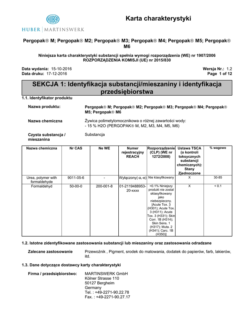 Karta charakterystyki PergopakÒ M; PergopakÒ M2; PergopakÒ M3; PergopakÒ M4; PergopakÒ M5; PergopakÒ M6 Ni ni ej szakar t achar akt er yst ykisubst ancj ispeł ni awymogir ozpor ządzeni a( WE)nr1907/ 2006 ROZPORZĄDZENI AKOMI SJI( UE)nr2015/ 830 Data wydania: 15-10-2016 Data druku: 17-12-2016 Wersja Nr.: 1.2 Page 1 of 12 SEKCJA 1: Identyfikacja substancji/mieszaniny i identyfikacja pr zedsi ębi or st wa 1.1. Identyfikator produktu Nazwa produktu: PergopakÒ M; PergopakÒ M2; PergopakÒ M3; PergopakÒ M4; PergopakÒ M5; PergopakÒ M6 Nazwa chemiczna Żywi capol i met yl omoczni kowaor óżnejzawar t ościwody: - 15 % H2O (PERGOPAKÒ M, M2, M3, M4, M5, M6) Czysta substancja / mieszanina Substancja Nazwa chemiczna Nr CAS Ne WE Urea, polymer with formaldehyde Formaldehyd 9011-05-6 - 50-00-0 200-001-8 Numer Rozpor ządzeni e Ustawa TSCA rejestracyjny (CLP) (WE nr (o kontroli REACH 1272/2008) toksycznych substancji chemicznych): Stany Zjednoczone X Wył ączony( a, e)Nie klasyfikowany 01-2119488953- <0.1% Niniejszy produkt nie zostal 20-xxxx % wagowo X 30-85 < 0.1 sklasyfikowany jako niebezpieczny. [Acute Tox. 3 (H301); Acute Tox. 3 (H311); Acute Tox. 3 (H331); Skin Corr. 1B (H314); Skin Sens. 1 (H317); Muta. 2 (H341); Carc. 1B (H350)] 1.2. Istotne zidentyfikowane zastosowania substancji lub mieszaniny oraz zastosowania odradzane Zalecane zastosowanie Pr zewoźni k,Pi gment ,sr odekdomat owani a,dodat ekdopapi er ów,f ar b,l aki er ów, itd. 1. 3.Danedot yczącedost awcykar t ychar akt er yst yki Fi r ma/pr zedsi ębi or st wo: MARTINSWERK GmbH Kölner Strasse 110 50127 Bergheim Germany Tel. : +49-2271-90.22.78 Fax. : +49-2271-90.27.17 HUBER Karta charakterystyki PergopakÒ M; PergopakÒ M2; PergopakÒ M3; PergopakÒ M4; PergopakÒ M5; PergopakÒ M6 Data wydania: 15-10-2016 Data druku: 17-12-2016 Wersja Nr.: 1.2 Page 2 of 12 Internet www.hubermaterials.com E-mail [email protected] 1.4. Numer telefonu alarmowego CHEMTREC: +1 800 424 9300 or International +1 703 527 3887 Kr aj oweCent r um Toksykol ogi cznePL:+48. 22. 619. 66. 54( OśodekI nf or macj i Toksykol ogi cznej-ŁódźWar szawa) Numert el ef onuośr odka toksykologicznego SEKCJA2:I dent yf i kacj azagr ożeń 2.1. Klasyfikacja substancji lub mieszaniny Rozpor ządzeni e( CLP)( WEnr Nie klasyfikowany 1272/2008) I dent yf i kacj azagr ożeń Zagr ożeni ef i zyczne Nie klasyfikowany Zagr ożeni adl azdr owi a Nie klasyfikowany Zagr ożeni eśr odowi skowe Nie klasyfikowany 2.2. Elementy oznakowania Symbole/Piktogramy Żaden( a, e) Hasł oOst r zegawcze Żaden( a, e) Zwr ot ywskazuj ąceRodzaj Zagr ożeni a Żaden( a, e) Ten produkt nie jest sklasyfikowany jako niebezpieczny zgodnie z wytycznymi GHS ONZ i nie jest wymagane oznakowanie Zwr ot ywskazuj ącenaśr odki ost r ożności Zapobieganie Pr zest r zegaćzasadhi gi enypr zemysł owej Dokł adni eumyćr ęcepoużyci u Reakcja W PRZYPADKUDOSTANI ASI ĘDO OCZU:Ost r ożni epł ukaćwodąpr zezki l ka mi nut .Wyj ąćsoczewkikont akt owe,j eżel isąimożnaj eł at wousunąć.Nadal pł ukać W PRZYPADKUKONTAKTUZESKÓRĄ:Umyćdużąi l ości ąwodyzmydł em Przechowywanie Tr zymaćwsuchym mi ej scu Utylizacja Ut yl i zacj ęnal eżypr zepr owadzaćzgodni ezobowi ązuj ącym pr awem ipr zepi sami regionalnymi, krajowymi i miejscowymi. 2. 3.I nnezagr ożeni a Brak danych. SEKCJA3:Skł ad/ i nf or macj aoskł adni kach 3.1. Substancje Substancja HUBER Karta charakterystyki PergopakÒ M; PergopakÒ M2; PergopakÒ M3; PergopakÒ M4; PergopakÒ M5; PergopakÒ M6 Data wydania: 15-10-2016 Data druku: 17-12-2016 Wersja Nr.: 1.2 Page 3 of 12 Nazwa chemiczna Nr CAS Ne WE Urea, polymer with formaldehyde Formaldehyd 9011-05-6 - 50-00-0 200-001-8 Numer rejestracyjny REACH Rozpor ządzeni Zał ączni ku e (CLP) (WE nr 1272/2008) Wył ączony( a, e) Nie klasyfikowany 01-2119488953- <0.1% Niniejszy 20-xxxx produkt nie zostal sklasyfikowany jako niebezpieczny. [Acute Tox. 3 (H301); Acute Tox. 3 (H311); Acute Tox. 3 (H331); Skin Corr. 1B (H314); Skin Sens. 1 (H317); Muta. 2 (H341); Carc. 1B (H350)] Ustawa TSCA (o kontroli toksycznych substancji chemicznych) : Stany Zjednoczone % wagowo -- X 30-85 -- X < 0.1 SEKCJA4:Śr odkipi er wszejpomocy 4. 1.Opi sśr odków pi er wszejpomocy Wskazówka ogólna Wr azi ewąt pl i wościl ubzaobser wowani aobj awów,zwr óci ćsi ęopomoc medyczną.Upewni ćsi ę,czyper sonelmedycznywi e,oj aki ( e)mat er i ał ( y)chodzii podj ąłśr odkiost r ożności ,abysi ępr zedni m( i )zabezpi eczyć. Kontakt z oczyma W PRZYPADKUDOSTANI ASI ĘDO OCZU:Ost r ożni epł ukaćwodąpr zezki l ka mi nut .Wyj ąćsoczewkikont akt owe,j eżel isąimożnaj eł at wousunąć.Nadal pł ukać.Jeśl iobj awyni eust ępuj ą,wezwaćl ekar za. Kont aktzeskór ą Umyćdużąi l ości ąwodyzmydł em. Wdychanie W PRZYPADKUDOSTANI ASI ĘDO DRÓG ODDECHOWYCH:Wypr owadzi ćl ub wyni eśćposzkodowanegonaświ eżepowi et r zeizapewni ćwar unkidoodpoczynku wpozycj iumożl i wi aj ącejswobodneoddychani e. Spożyci e Dokł adni epr zepł ukaćust awodą. Zagr ożeni epr zywdychani u W opar ci uodost ępnedane,kr yt er i akl asyf i kacj ini esąspeł ni one. Uwagi dla lekarza Leczyćobj awowo. Kont aktpył uzoczymamożepr owadzi ćdowyst ąpi eni amechani cznego 4. 2.Naj ważni ej szeost r ei ażni eni a.Kont aktzpył em możepowodowaćpodr ażni eni emechani cznel ub opóźni oneobj awyor azskut ki podr wysuszenie skóry. nar ażeni a Leczyćobj awowo.Nal eżysi ęupewni ć,żeper sonelmedycznyj estświ adomy 4. 3.Wskazani adot yczące zast osowanego( ych)mat er i ał u( ów)ipodej mi eśr odkizar adcze,abyzabezpi eczyć wszelkiej natychmiastowej si ebi eor azzapobi egaćr ozpr zest r zeni ani usi ęskażeni a. pomocy lekarskiej i szczegól negopost ępowani az poszkodowanym HUBER Karta charakterystyki PergopakÒ M; PergopakÒ M2; PergopakÒ M3; PergopakÒ M4; PergopakÒ M5; PergopakÒ M6 Data wydania: 15-10-2016 Data druku: 17-12-2016 Wersja Nr.: 1.2 Page 4 of 12 SEKCJA5:Post ępowani ew pr 