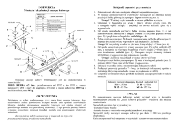 INSTRUKCJA MontaŜu i eksploatacji zaczepu kulowego M10x80 8 8 7 Oznaczenie zacisku wg ISO PN 1 L 2 + 3 31 4 R 5 58R 6 54 7 58L Kolejność czynności przy montaŜu Łączenie przewodów Kierunkowskazy lewe Tylne światła przeciwmgłowe Masa Kierunkowskazy prawe Światła pozycyjne prawe Światła hamowania Światła pozycyjne lewe M10x35 7 C 4 C 5 B M12x70 A 1 6 M10x35 M12x75 4 B 2 A 3 Niniejszy zaczep kulowy przeznaczony jest do zamontowania w samochodzie: FORD SIERRA 4/5 drz., produkowanym od 1992 r. do 1993 r., numer katalogowy C04 i słuŜy do ciągnięcia przyczep o masie całkowitej 1500 kg i nacisku na kulę max 50 kg. OD PRODUCENTA Dziękujemy za wybór produkowanego przez naszą firmę zaczepu kulowego. Jego niezawodność została potwierdzona licznymi testami oraz opiniami zadowolonych klientów. JednakŜe niezawodność zaczepów kulowych jest zaleŜna równieŜ od prawidłowego montaŜu oraz prawidłowej eksploatacji. Z tego powodu prosimy Państwa o staranne przeczytanie niniejszej instrukcji montaŜu oraz przestrzeganie właściwych wskazówek. Zaczep kulowy naleŜy zamontować w miejscach do tego celu przeznaczonych przez producenta samochodu. 1. Zdemontować zderzak a następnie odkręcić wsporniki mocujące. 2. W miejsce zdemontowanych wsporników mocujących do zderzaka naleŜy przykręcić belkę główną zaczepu (poz. 1) poprzez otwory poz. A. Uwaga! W dolnej części zderzaka wykonać półkoliste wycięcie. 3. Odszukać w bagaŜniku po lewej i prawej stronie otwory (poz. B), a następnie wybić zaślepki i przyłoŜyć na otwory nakładki (poz. 4) z wyposaŜenia. 4. Od spodu samochodu przyłoŜyć belkę główną zaczepu (poz. 1) z juŜ zamontowanym zderzakiem i skręcić śrubami M10x35mm poprzez otwory (poz. B) i przyłoŜone w bagaŜniku nakładki (poz. 4). 5. Tylną cześć zaczepu (poz. 5) skręcić z zamontowaną juŜ belką główną (poz.1) poprzez dwa tylne otwory wsporników kuli śrubami M12x70mm. Uwaga! W rurę naleŜy wsadzić na pierwszą śrubą tulejkę L=25mm (poz. 6). 6. Od spodu samochodu poprzez otwory zaczepu (poz. C) wybić zaślepki ø25 mm, a następnie od wewnątrz bagaŜnika włoŜyć tulejki L=45mm (poz. 7) oraz kwadratowe nakładki (poz. 8). Następnie skręcić elementy śrubami M10x80mm z wyposaŜenia jak pokazano na rysunku. Uwaga! JeŜeli nie ma zaślepek wykonać otwory ø25 mm 7. Przykręcić część kulistą zaczepu (poz. 2) wraz z blachą pod gniazdo (poz. 3) śrubami M12x75mm oraz M12x70mm z wyposaŜenia. 8. Dokręcić wszystkie śruby z momentem jak pokazano w tabeli. 9. Podłączyć przewody gniazdka 7 – bieg. do instalacji elektrycznej zgodnie z instrukcją fabryczną samochodu (zaleca się wykonanie w ASO). 10. Uzupełnić ewentualne ubytki powłoki malarskiej zaczepu powstałe w trakcie montaŜu. Zalecany moment skręcający dla śrub i nakrętek 8,8: M 8 - 25 Nm M 10 - 55 Nm M 12 - 85 Nm M 14 - 135 Nm UWAGA Po zamontowaniu zaczepu kulowego naleŜy uzyskać wpis w dowodzie rejestracyjnym pojazdu na „stacji kontroli pojazdów” właściwej dla miejsca zamieszkania. Samochód powinien być wyposaŜony w: -kierunkowskazy boczne -lusterka boczne o rozstawie co najmniej szerokości przyczepy Sprawdzić śruby mocujące zaczepu kulowego po około 1 000 km przebiegu eksploatacji. Kula zaczepu musi być utrzymana w czystości i konserwowana smarem stałym PPUH AUTO-HAK S.J. KARTA GWARANCYJNA Produkcja Zaczepów Kulowych Henryk & Zbigniew Nejman 76-200 SŁUPSK ul. Słoneczna 16K tel./fax. (059) 8-414-414; 8-414-413 E-mail: [email protected] www. autohak.com.pl Producent udziela gwarancji niniejszą kartą gwarancyjną na okres 24 miesięcy licząc od dnia zakupu zaczepu kulowego do samochodu: FORD SIERRA 4/5 drz. produkowanego od 1992 r. do 1993 r. Data produkcji .............................. Data zakupu............................................. Zakres gwarancji obejmuje wyłącznie wady jakościowe wynikające z winy producenta. Gwarancja nie obejmuje natomiast uszkodzeń zawinionych przez nabywcę, wynikających z niewłaściwego montaŜu, uŜytkowania lub konserwacji, uszkodzeń mechanicznych, normalnego zuŜycia podczas eksploatacji itp. Gwarancja udzielona na zakupiony towar nie wyłącza, nie ogranicza ani nie zawiesza uprawnień kupującego wynikających z niezgodności towaru z umową. Reklamacje naleŜy zgłaszać w punkcie sprzedaŜy, składając jednocześnie kartę gwarancyjną. Usunięcie "wady" następuje po stwierdzeniu przez punkt sprzedaŜy wspólnie z producentem słuszności złoŜonej reklamacji. Reklamacja powinna być załatwiona w ciągu 14 dni od dnia uznania reklamacji. Karta gwarancyjna jest niewaŜna, jeŜeli nie jest wypełniona i podpisana. Data zgłoszenia reklamacji: ................................................................... Zaczep kulowy bez wyposaŜenia elektrycznego C04 Klasa: A50-X Nr kat. Przeznaczony do zamontowania w samochodzie: Producent: FORD Model: SIERRA Typ: 4/5 drz. produkowanym od 1992 r. do 1993 r. Dane techniczne: wartość siły D: 8,16 kN maksymalna masa przyczepy: 1500 kg maksymalny nacisk na kulę: 50 kg Numer homologacji zgodnie z Dyrektywą 94/20/WE: INFORMACJA WSTĘPNA Niniejszy zaczep kulowy jest skonstruowany zgodnie z zasadami bezpieczeństwa ruchu drogowego. Zaczep kulowy jest elementem wpływającym na bezpieczeństwo jazdy i moŜe zostać zainstalowany wyłącznie przez personel wyspecjalizowany. Niedopuszczalne jest dokonywanie jakichkolwiek zmian w konstrukcji zaczepu. Powoduje to wygaśniecie dopuszczenia do stosowania. W przypadku obecności masy izolacyjnej lub osłony podwozia w miejscu przylegania zaczepu, naleŜy ją usunąć. Nieosłonięte miejsca karoserii oraz wywiercone otwory naleŜy pomalować farbą antykorozyjną. Informacjami wiąŜącymi odnośnie wartości obciąŜeń są dane podawane przez producenta samochodu, względnie wartości maksymalnej masy przyczepy oraz maksymalnego nacisku na kulę, przy czym wartości parametrów za