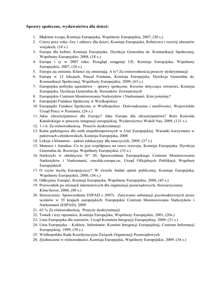 Sprawy społeczne, wydawnictwa dla dzieci: 1. Błękitna wyspa, Komisja Europejska, Wspólnoty Europejskie, 2007, (20 s.) 2. Cztery pory roku. Gry i zabawy dla dzieci, Komisja Europejska, Rolnictwo i rozwój obszarów wiejskich, (18 s.) 3. Europa dla kobiet, Komisja Europejska, Dyrekcja Generalna ds. Komunikacji Społecznej, Wspólnoty Europejskie, 2008, (18 s.) 4. Europa i ty w 2007 roku. Przegląd osiągnięć UE, Komisja Europejska, Wspólnoty Europejskie, 2007, (24 s.) 5. Europa się zmienia. Klienci się zmieniają. A ty? Za różnorodnością przeciw dyskryminacji 6. Europa w 12 lekcjach, Pascal Fontaine, Komisja Europejska, Dyrekcja Generalna ds. Komunikacji Społecznej, Wspólnoty Europejskie, 2009, (63 s.) 7. Europejska polityka sąsiedztwa – sprawy społeczne. Kwestie dotyczące równości, Komisja Europejska, Dyrekcja Generalna ds. Stosunków Zewnętrznych 8. Europejskie Centrum Monitorowania Narkotyków i Narkomanii. Kim jesteśmy? 9. Europejski Fundusz Społeczny w Wielkopolsce 10. Europejski Fundusz Społeczny w Wielkopolsce. Doświadczenia i możliwości, Wojewódzki Urząd Pracy w Poznaniu, (24 s.) 11. Jakie chrześcijaństwo dla Europy? Jaka Europa dla chrześcijaństwa? Rola Kościoła Katolickiego w procesie integracji europejskiej, Wydawnictwo Wokół Nas, 2009, (131 s.) 12. 1 z 6. Za różnorodnością. Przeciw dyskryminacji 13. Karta parkingowa dla osób niepełnosprawnych w Unii Europejskiej. Warunki korzystania w państwach członkowskich, Komisja Europejska, 2008 14. Lekcje z klimatem – pakiet edukacyjny dla nauczycieli, 2009, (37 s.) 15. Mateusz i Amadou. Co to jest współpraca na rzecz rozwoju, Komisja Europejska, Dyrekcja Generalna ds. Rozwoju, Wspólnoty Europejskie, (33 s.) 16. Narkotyki w obiektywie N° 20, Sprawozdanie Europejskiego Centrum Monitorowania Narkotyków i Narkomanii, emcdda.europa.eu, Urząd Oficjalnych Publikacji Wspólnot Europejskich 17. O czym myślą Europejczycy? W świetle badań opinii publicznej, Komisja Europejska, Wspólnoty Europejskie, 2000, (56 s.) 18. Odkryjmy Europę!, Komisja Europejska, Wspólnoty Europejskie, 2008, (43 s.) 19. Przewodnik po stronach internetowych dla organizacji pozarządowych, Stowarzyszenie Klon/Jawor, 2006, (88 s.) 20. Streszczenie. Sprawozdanie ESPAD z 2007r.. Zażywanie substancji psychoaktywnych przez uczniów w 35 krajach europejskich. Europejskie Centrum Monitorowania Narkotyków i Narkomanii (ESPAD), 2009 21. 62 % Za różnorodnością. Przeciw dyskryminacji 22. Tomek i trzy tajemnice, Komisja Europejska, Wspólnoty Europejskie, 2001, (20s.) 23. Unia Europejska dla seniorów, Urząd Komitetu Integracji Europejskiej, 2009, (31 s.) 24. Unia Europejska – Kobiety. Informator, Komitet Integracji Europejskiej, Centrum Informacji Europejskiej, 1999, (39 s.) 25. Wielkopolska Rada Koordynacyjna Związek Organizacji Pozarządowych 26. Zjednoczeni w różnorodności, Komisja Europejska, Wspólnoty Europejskie, 2009, (36 s.) Wydawnictwa w języku angielskim : 1. An opportunity and a challenge. Migration in the European Union, European Commission, Directorate-General for Communication, European Communities, 2009, (15 pp.) 2. Demography report 2008 – Meeting social needs in an ageing society, European Commission, January 2009, (254 pp.) 3. Discover the European Economic and Social Committee ,(6 pp.) 4. Drugnet Europe – Newsletter of the European Monitoring Centre for Drugs and Drug Addiction – January – March 2009, N° 65 5. Drugnet Europe – Newsletter of the European Monitoring Centre for Drugs and Drug Addiction – April – June 2009, N°66 6. Drugnet Europe – Newsletter of the European Monitoring Centre for Drugs and Drug Addiction – July – September 2009, N°67 7. Drugnet Europe – Newsletter of the European Monitoring Centre for Drugs and Drug Addiction – October – December 2009, N°68, (7 pp.) 8. Ensuring accessibility and non-discrimination of people with disabilities, Toolkit for using EU Structural and Cohesion Funds, European Commission (January 2009), (47 pp.) 9. Europe & Agriculture, European Commission, Directorate-General for Agriculture and Rural Development, (30 s.) 10. European Employment Observatory Review :Autumn 2008 (European Commission, Directorate-General for Employment, Social Affairs and Equal Opportunities, Unit D.2, November 2008),(26 pp.) 11. Mutual Information System on Social Protection (MISSOC 2008) – Social Protection in the Member States of the European Union, the European Economic Area and in Switzerland – Situation on 1st January 2008 (34 pp. + DVD) 12. On the farm, European Commission, European Communities, 2006 13. Parking card for people with disabilities in the European Union, http://parkingcard.europa.eu, European Commission, (8 pp.) 14. Parking card for people with disabilities in the European Union: conditions in the Member States, European Commission (2009), (34 pp.) 15. Progress – 2008 Annual Performance Monitoring Report – Performance at a glance, European Communities, 2009, (4 pp.) 16. Report on equality between women and men 2009 (February 2009, European Commission, Directorate-General for Employment, Social Affairs and Equal Opportunities, Unit G.1, (40 pp.) 17. Report on the risk assessment of BZP in the framework of the Council decision on new psychoactive substances (European Monitoring Centre for Drugs and Drug Addiction, 2009), (91 pp.) 18. Selected Issue 2009. Polydrug use: patterns and responses, European Monitoring Centre for Drugs and Drug Addiction, 2009, (26 pp.) 19. Social Agenda – Jumping the Generation gap, The European Commission’s magazine on employment and social affairs, Issue no 21, July 2009 (27 pp.) 20. Social dialogue – All in this together?, Foundation Focus, European Foundation for the Improvement of Living and Working Conditions, Issue 7, July 2009, (14 pp.) 21. The EESC: a bridge between Europe and organized civil society. European Economic and Social Committee, “Visits and Publications” Unit,