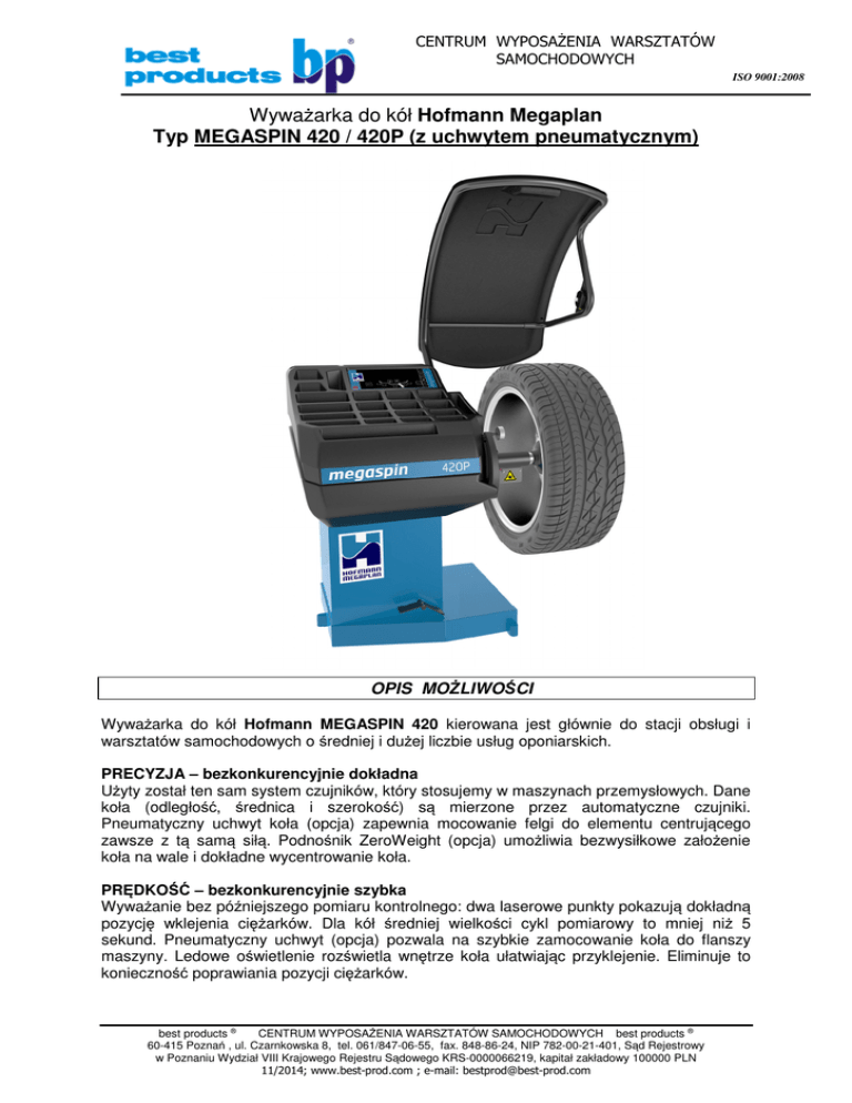 CENTRUM WYPOSAŻENIA WARSZTATÓW SAMOCHODOWYCH ISO 9001:2008 Wyważarka do kół Hofmann Megaplan Typ MEGASPIN 420 / 420P (z uchwytem pneumatycznym) OPIS MOŻLIWOŚCI Wyważarka do kół Hofmann MEGASPIN 420 kierowana jest głównie do stacji obsługi i warsztatów samochodowych o średniej i dużej liczbie usług oponiarskich. PRECYZJA – bezkonkurencyjnie dokładna Użyty został ten sam system czujników, który stosujemy w maszynach przemysłowych. Dane koła (odległość, średnica i szerokość) są mierzone przez automatyczne czujniki. Pneumatyczny uchwyt koła (opcja) zapewnia mocowanie felgi do elementu centrującego zawsze z tą samą siłą. Podnośnik ZeroWeight (opcja) umożliwia bezwysiłkowe założenie koła na wale i dokładne wycentrowanie koła. PRĘDKOŚĆ – bezkonkurencyjnie szybka Wyważanie bez późniejszego pomiaru kontrolnego: dwa laserowe punkty pokazują dokładną pozycję wklejenia ciężarków. Dla kół średniej wielkości cykl pomiarowy to mniej niż 5 sekund. Pneumatyczny uchwyt (opcja) pozwala na szybkie zamocowanie koła do flanszy maszyny. Ledowe oświetlenie rozświetla wnętrze koła ułatwiając przyklejenie. Eliminuje to konieczność poprawiania pozycji ciężarków. best products ® CENTRUM WYPOSAŻENIA WARSZTATÓW SAMOCHODOWYCH best products ® 60-415 Poznań , ul. Czarnkowska 8, tel. 061/847-06-55, fax. 848-86-24, NIP 782-00-21-401, Sąd Rejestrowy w Poznaniu Wydział VIII Krajowego Rejestru Sądowego KRS-0000066219, kapitał zakładowy 100000 PLN 11/2014; www.best-prod.com ; e-mail: [email protected] CENTRUM WYPOSAŻENIA WARSZTATÓW SAMOCHODOWYCH ISO 9001:2008 ERGONOMIA – bezkonkurencyjnie łatwa obsługa Dzięki kompletnie nowej obudowie maszyny przestrzeń robocza jest znacząco bardziej dostępna niż w konwencjonalnych wyważarkach. Oświetlenie LED ułatwia operatorowi wyczyszczenie felgi w miejscach do wklejenia ciężarków. Podnośnik ZeroWeight (opcja) pomaga operatorowi sprawnie obsługiwać nawet najcięższe koła. W wersji Megaspin 420P uchwyt pneumatyczny w standardzie. ISS – PRZEMYSŁOWY SYSTEM CZUJNIKÓW Wszystkie wyważarki megaspin używają tych samych wysokiej precyzji systemów, które także są zintegrowane w przemysłowych wyważarkach dla przemysłu motoryzacyjnego i producentów oryginalnego wyposażenia oponiarskiego. OPCJONALNIE (płatne dodatkowo) 1. Uniwersalny uchwyt mocujący do felg nieprzelotowych z 3,4 lub 5 otworami i rozstawem śrub 95-210 mm. Specjalny stożek (patent) do centrowania felgi przez jej otwór. 2. Pokrywa dociskowa do felg aluminiowych 3. Pierścień centrujący do średnic 56,5; 57; 66,5; i 72,5 mm 4. Zestaw podkładek dla kół z bardzo dużych przesunięciach (SUV, 4WD) 5. Pierścienie i stożki do Vanów, aut z 4x4 i lekkich ciężarówek z otworami 97-180mm 6. Uchwyt do kół motocyklowych ŁATWOŚĆ OBSŁUGI Wyświetlacz Cyfrowy, diodowy Liczba operatorów 2 operatorów Pozycje odważników na felgach aluminiowych Nieograniczone Program podziału odważników AUTO SPLIT Zawarty MINISTAT (patent) Zawarty WeightLess Zawarty Wprowadzanie danych dla felg stalowych: Odległość automatyczne Średnica automatyczne Szerokość bezdotykowe DANE TECHNICZNE Szerokość felgi 1,5 – 20 cali Średnica felgi 10 - 28 cali (30 cali ręcznie) Max. średnica koła 1016 mm Max. szerokość koła 480 mm Max. waga koła 75 kg Obroty (rpm) 100 Wymiary opakowania (SxDxW) 1130 x 1450 x 1150 mm Waga brutto 135 kg / 150 kg (wersja P) Zasilanie 230 V / 50 Hz / 1 Ph / 500 W best products ® CENTRUM WYPOSAŻENIA WARSZTATÓW SAMOCHODOWYCH best products ® 60-415 Poznań , ul. Czarnkowska 8, tel. 061/847-06-55, fax. 848-86-24, NIP 782-00-21-401, Sąd Rejestrowy w Poznaniu Wydział VIII Krajowego Rejestru Sądowego KRS-0000066219, kapitał zakładowy 100000 PLN 11/2014; www.best-prod.com ; e-mail: [email protected]