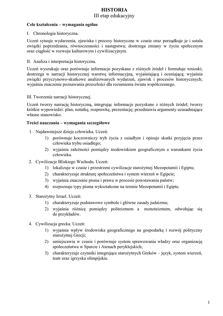 HISTORIA III etap edukacyjny Cele kształcenia – wymagania ogólne I. Chronologia historyczna. Uczeń sytuuje wydarzenia, zjawiska i procesy historyczne w czasie oraz porządkuje je i ustala związki poprzedzania, równoczesności i następstwa; dostrzega zmiany w Ŝyciu społecznym oraz ciągłość w rozwoju kulturowym i cywilizacyjnym. II. Analiza i interpretacja historyczna. Uczeń wyszukuje oraz porównuje informacje pozyskane z róŜnych źródeł i formułuje wnioski; dostrzega w narracji historycznej warstwę informacyjną, wyjaśniającą i oceniającą; wyjaśnia związki przyczynowo-skutkowe analizowanych wydarzeń, zjawisk i procesów historycznych; wyjaśnia znaczenie poznawania przeszłości dla rozumienia świata współczesnego. III. Tworzenie narracji historycznej. Uczeń tworzy narrację historyczną, integrując informacje pozyskane z róŜnych źródeł; tworzy krótkie wypowiedzi: plan, notatkę, rozprawkę, prezentację; przedstawia argumenty uzasadniające własne stanowisko. Treści nauczania – wymagania szczegółowe 1. Najdawniejsze dzieje człowieka. Uczeń: 1) porównuje koczowniczy tryb Ŝycia z osiadłym i opisuje skutki przyjęcia przez człowieka trybu osiadłego; 2) wyjaśnia zaleŜności pomiędzy środowiskiem geograficznym a warunkami Ŝycia człowieka. 2. Cywilizacje Bliskiego Wschodu. Uczeń: 1) lokalizuje w czasie i przestrzeni cywilizacje staroŜytnej Mezopotamii i Egiptu; 2) charakteryzuje strukturę społeczeństwa i system wierzeń w Egipcie; 3) wyjaśnia znaczenie pisma i prawa w procesie powstawania państw; 4) rozpoznaje typy pisma wykształcone na terenie Mezopotamii i Egiptu. 3. StaroŜytny Izrael. Uczeń: 1) charakteryzuje podstawowe symbole i główne zasady judaizmu; 2) wyjaśnia róŜnicę pomiędzy politeizmem a monoteizmem, odwołując się do przykładów. 4. Cywilizacja grecka. Uczeń: 1) wyjaśnia wpływ środowiska geograficznego na gospodarkę i rozwój polityczny staroŜytnej Grecji; 2) umiejscawia w czasie i porównuje system sprawowania władzy oraz organizację społeczeństwa w Sparcie i Atenach peryklejskich; 3) charakteryzuje czynniki integrujące staroŜytnych Greków – język, system wierzeń, teatr oraz igrzyska olimpijskie. 1 5. Cywilizacja rzymska. Uczeń: 1) umiejscawia w czasie i charakteryzuje system sprawowania władzy oraz organizację społeczeństwa w Rzymie republikańskim i cesarstwie; 2) wyjaśnia przyczyny i wskazuje skutki ekspansji Rzymu, opisując postawy Rzymian wobec niewolników i ludów podbitych; 3) podaje przykłady wpływu kultury greckiej na kulturę rzymską; 4) rozróŜnia wewnętrzne i zewnętrzne przyczyny upadku staroŜytnego państwa rzymskiego. 6. Dziedzictwo antyku. Uczeń: 1) charakteryzuje najwaŜniejsze osiągnięcia kultury materialnej i duchowej antycznego świata w róŜnych dziedzinach: filozofii, nauce, architekturze, sztuce, literaturze; 2) podaje przykłady osiągnięć cywilizacyjnych antyku, które mają wpływ na cywilizację współczesną. 7. Chrześcijaństwo. Uczeń: 1) umiejscawia w czasie i przestrzeni narodziny i rozprzestrzenianie się chrześcijaństwa; 2) wskazuje przyczyny i przykłady prześladowania chrześcijan w państwie rzymskim. 8. Arabowie i świat islamski. Uczeń: 1) umiejscawia w czasie i przestrzeni kierunki i zasięg podbojów arabskich; 2) opisuje podstawowe zasady i symbole islamu; 3) wyjaśnia rolę Arabów w przekazywaniu dorobku kulturowego pomiędzy Wschodem a Zachodem. 9. Początki cywilizacji zachodniego chrześcijaństwa. Uczeń: 1) umiejscawia w czasie i przestrzeni monarchię Karola Wielkiego, Państwo Kościelne oraz Cesarstwo w Europie Zachodniej; 2) charakteryzuje działalność Karola Wielkiego i wyjaśnia, na czym polegał renesans karoliński; 3) charakteryzuje główne idee uniwersalnego cesarstwa Ottona III; 4) opisuje relacje pomiędzy władzą cesarską a papieską w X-XI w. 10. Bizancjum i Kościół wschodni. Uczeń: 1) lokalizuje w czasie i przestrzeni cesarstwo bizantyjskie; 2) charakteryzuje rolę Bizancjum jako kontynuatora cesarstwa rzymskiego i rozpoznaje osiągnięcia kultury bizantyjskiej (prawo, architektura, sztuka); 3) wyjaśnia przyczyny i skutki rozłamu w Kościele w XI w. 11. Społeczeństwo średniowiecznej Europy. Uczeń: 1) rozpoznaje typowe instytucje systemu lennego; 2) wyjaśnia pojęcie stanu i charakteryzuje podziały społeczne w średniowieczu; 3) charakteryzuje funkcje gospodarcze, polityczne i kulturowe miast średniowieczu. w 2 12. Kultura materialna i duchowa łacińskiej Europy. Uczeń: 1) wyjaśnia kulturotwórczą rolę Kościoła w dziedzinie nauki, architektury, sztuki i Ŝycia codziennego średniowiecznego społeczeństwa; 2) porównuje główne elementy kultury rycerskiej i kultury miejskiej; 3) rozpoznaje zabytki kultury średniowiecza, wskazując róŜnice pomiędzy stylem romańskim a stylem gotyckim, z uwzględnieniem przykładów z własnego regionu. 13. Polska pierwszych Piastów. Uczeń: 1) sytuuje w czasie i przestrzeni państwo pierwszych Piastów; 2) wskazuje, na przykładzie państwa pierwszych Piastów, charakterystyczne cechy monarchii patrymonialnej; 3) wyjaśnia okoliczności przyjęcia chrztu przez Piastów oraz następstwa kulturowe, społeczne i polityczne chrystianizacji Polski; 4) ocenia dokonania pierwszych Piastów w dziedzinie polityki, gospodarki i kultury. 14. Polska dzielnicowa i zjednoczona. Uczeń: 1) sytuuje w czasie i przestrzeni Polskę okresu rozbicia dzielnicowego; 2) opisuje postanowienia statutu Bolesława Krzywoustego; 3) porządkuje i sytuuje w czasie najwaŜniejsze wydarzenia związane z relacjami polsko-krzyŜackimi w epoce Piastów; 4) opisuje zmiany społeczno-gospodarcze w epoce rozbicia dzielnicowego i dostrzega związki pomiędzy rozwojem ruchu osadniczego a oŜywieniem gospodarczym; 5) ocenia dokonania Kazimierza Wielkiego w dziedzinie polityki wewnętrznej (system obronny, urbanizacja kraju, prawo, nauka) oraz w polityce zagranicznej; 6) chara