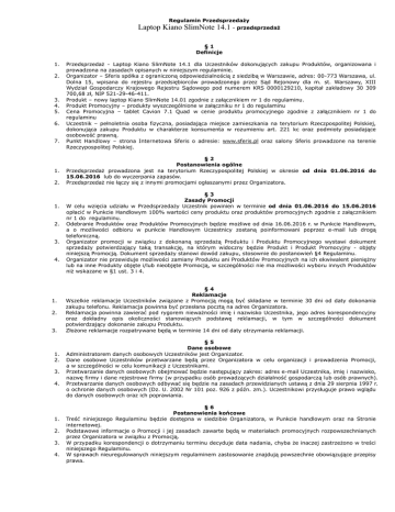 Regulamin Przedsprzedaży Laptop Kiano SlimNote 14.1 - przedsprzedaż §1 Definicje 1. 2. 3. 4. 5. 6. 7. 1. 2. 1. 2. 3. 4. 1. 2. 3. 1. 2. 3. 4. 1. 2. 3. 4. Przedsprzedaż - Laptop Kiano SlimNote 14.1 dla Uczestników dokonujących zakupu Produktów, organizowana i prowadzona na zasadach opisanych w niniejszym regulaminie. Organizator – Sferis spółka z ograniczoną odpowiedzialnością z siedzibą w Warszawie, adres: 00-773 Warszawa, ul. Dolna 15, wpisana do rejestru przedsiębiorców prowadzonego przez Sąd Rejonowy dla m. st. Warszawy, XIII Wydział Gospodarczy Krajowego Rejestru Sądowego pod numerem KRS 0000129210, kapitał zakładowy 30 309 700,68 zł, NIP 521-29-46-411. Produkt – nowy laptop Kiano SlimNote 14.01 zgodnie z załącznikiem nr 1 do regulaminu. Produkt Promocyjny – produkty wyszczególnione w załączniku nr 1 do regulaminu Cena Promocyjna – tablet Cavion 7.1 Quad w cenie produktu promocyjnego zgodnie z załącznikiem nr 1 do regulaminu Uczestnik – pełnoletnia osoba fizyczna, posiadająca miejsce zamieszkania na terytorium Rzeczpospolitej Polskiej, dokonująca zakupu Produktu w charakterze konsumenta w rozumieniu art. 221 kc oraz podmioty posiadające osobowość prawną. Punkt Handlowy – strona Internetowa Sferis o adresie: www.sferis.pl oraz salony Sferis prowadzone na terenie Rzeczypospolitej Polskiej. §2 Postanowienia ogólne Przedsprzedaż prowadzona jest na terytorium Rzeczypospolitej Polskiej w okresie od dnia 01.06.2016 do 15.06.2016 lub do wyczerpania zapasów. Przedsprzedaż nie łączy się z innymi promocjami ogłaszanymi przez Organizatora. §3 Zasady Promocji W celu wzięcia udziału w Przedsprzedaży Uczestnik powinien w terminie od dnia 01.06.2016 do 15.06.2016 opłacić w Punkcie Handlowym 100% wartości ceny produktu oraz produktów promocyjnych zgodnie z załącznikiem nr 1 do regulaminu. Odebranie Produktów oraz Produktów Promocyjnych będzie możliwe od dnia 16.06.2016 r. w Punkcie Handlowym, a o możliwości odbioru w punkcie Handlowym Uczestnicy zostaną poinformowani poprzez e-mail lub drogą telefoniczną. Organizator promocji w związku z dokonaną sprzedażą Produktu i Produktu Promocyjnego wystawi dokument sprzedaży potwierdzający taką transakcję, na którym widoczny będzie Produkt i Produkt Promocyjny - objęty niniejszą Promocją. Dokument sprzedaży stanowi dowód zakupu, stosownie do postanowień §4 Regulaminu. Organizator nie przewiduje możliwości zamiany Produktu ani Produktów Promocyjnych na ich ekwiwalent pieniężny lub na inne Produkty objęte i/lub nieobjęte Promocją, w szczególności nie ma możliwości wyboru innych Produktów niż wskazane w §1 ust. 3 i 4. §4 Reklamacje Wszelkie reklamacje Uczestników związane z Promocją mogą być składane w terminie 30 dni od daty dokonania zakupu telefonu. Reklamacja powinna być przesłana pocztą na adres Organizatora. Reklamacja powinna zawierać pod rygorem nieważności imię i nazwisko Uczestnika, jego adres korespondencyjny oraz dokładny opis okoliczności stanowiących podstawę reklamacji, w tym w szczególności dokument potwierdzający dokonanie zakupu Produktu. Złożone reklamacje rozpatrywane będą w terminie 14 dni od daty otrzymania reklamacji. §5 Dane osobowe Administratorem danych osobowych Uczestników jest Organizator. Dane osobowe Uczestników przetwarzane będą przez Organizatora w celu organizacji i prowadzenia Promocji, a w szczególności w celu komunikacji z Uczestnikami. Przetwarzanie danych osobowych obejmować będzie następujący zakres: adres e-mail Uczestnika, imię i nazwisko, nazwę firmy i dane rejestrowe firmy (w przypadku osób prowadzących działalność gospodarczą lub osób prawnych). Przetwarzanie danych osobowych odbywać się będzie na zasadach przewidzianych ustawą z dnia 29 sierpnia 1997 r. o ochronie danych osobowych (Dz. U. 2002 Nr 101 poz. 926 z późn. zm.). Uczestnikowi przysługuje prawo wglądu do danych osobowych oraz ich poprawiania. §6 Postanowienia końcowe Treść niniejszego Regulaminu będzie dostępna w siedzibie Organizatora, w Punkcie handlowym oraz na Stronie internetowej. Podstawowe informacje o Promocji i jej zasadach zawarte będą w materiałach promocyjnych rozpowszechnianych przez Organizatora w związku z Promocją. W przypadku korespondencji o dotrzymaniu terminu decyduje data nadania, chyba że inaczej zastrzeżono w treści niniejszego Regulaminu. W sprawach nieuregulowanych niniejszym regulaminem zastosowanie znajdują powszechnie obowiązujące przepisy prawa. ZAŁĄCZNIK NR 1 DO REGULAMINU PRODUKTY Laptop Kiano SlimNote 14.1 PRODUKTY PROMOCYJNE Tablet Cavion 7.1 Quad INDEX DAX 001KNON000024 INDEX DAX 001KNON000021 CENA BRUTTO 798 zł CENA BRUTTO 1 zł