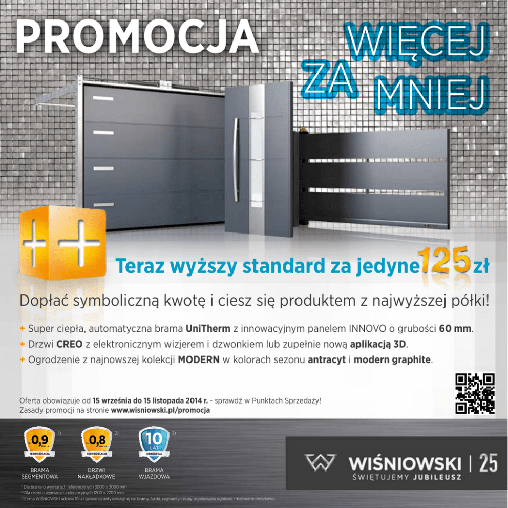 PROMOCJA WIĘCEJ ZA MNIEJ Teraz wyższy standard za jedyne zł Dopłać symboliczną kwotę i ciesz się produktem z najwyższej półki! + Super ciepła, automatyczna brama UniTherm z innowacyjnym panelem INNOVO o grubości 60 mm. + Drzwi CREO z elektronicznym wizjerem i dzwonkiem lub zupełnie nową aplikacją 3D. + Ogrodzenie z najnowszej kolekcji MODERN w kolorach sezonu antracyt i modern graphite. Oferta obowiązuje od 15 września do 15 listopada 2014 r. - sprawdź w Punktach Sprzedaży! Zasady promocji na stronie www.wisniowski.pl/promocja 1) BRAMA SEGMENTOWA 1) 2) 3) 2) DRZWI NAKŁADKOWE 3) BRAMA WJAZDOWA Dla bramy o wymiarach referencyjnych 3000 x 3000 mm Dla drzwi o wymiarach referencyjnych 1200 x 2200 mm Firma WIŚNIOWSKI udziela 10 lat gwarancji antykorozyjnej na: bramy, furtki, segmenty i słupy ocynkowane ogniowo i malowane proszkowo. Automatyczne bramy garażowe UniTherm NOWOŚĆ Panel INNOVO o grubości 60 mm Więcej zaoszczędzonej energii dzięki automatycznej bramie UniTherm ze skrzydłem o grubości 60 mm. Teraz dopłacając jedyne 125 zł do bramy z panelem 40 mm, zyskujesz bramę UniTherm z płaszczem o grubości 60 mm! Brama garażowa UniTherm została zaprojektowana z myślą o jak najlepszych parametrach izolacji cieplnej. Jej skrzydło zbudowane jest w oparciu o najnowszej generacji panel INNOVO o grubości 60 mm. Współczynnik przenikania ciepła panelu INNOVO wynosi 0,37 W/m2K, co wraz z nowoczesnym systemem uszczelnień przekłada się na znakomitą termoizolację całej bramy ze współczynnikiem ciepła na poziomie 0,9 W/m2K. Kolory i struktury bram objętych promocją złoty dąb orzech smoothgrain RAL 9016 smoothgrain antracyt silkline RAL 7016 sandgrain silkline Napęd MIDO Tabela wymiarów bram w ofercie promocyjnej Wysokość bramy Szerokość bramy 2100 2400 2500 2600 2750 3000 3250 3500 3750 4000 4250 4500 4750 5000 2125 2400 2500 2600 2750 3000 3250 3500 3750 4000 4250 4500 4750 5000 2250 2400 2500 2600 2750 3000 3250 3500 3750 4000 4250 4500 4750 5000 Drzwi aluminiowe nakładkowe CREO NOWOŚĆ Aplikacja 3D Więcej możliwości aranżacyjnych dzięki nowym aplikacjom 3D w drzwiach CREO. Teraz za jedyne 125 zł dopłaty, dajemy nowe możliwości – drzwi z aplikacją 3D lub nowoczesny wizjer z dzwonkiem i kamerą umożliwiającą wykonywanie zdjęć w podczerwieni! CREO to nowe podejście do projektowania drzwi - łączą dobry styl i świetne parametry techniczne. Dają niezliczoną ilość kombinacji wzorów i kolorów skrzydła i ościeżnicy oraz swobodę aranżacji własnej koncepcji. Ogromnym atutem są świetne parametry przenikania ciepła na poziomie U=0,8 W/m2K. Wizjer elektroniczny z dzwonkiem CREO 324 CREO 325 CREO 326 Ogrodzenia posesyjne Kolekcja MODERN NOWOŚĆ Więcej luksusu za sprawą najnowszej kolekcji ogrodzeń MODERN. Teraz za niewielką dopłatą 125 zł wyjątkowe wzory kolekcji MODERN dostępne będą w najbardziej atrakcyjnych kolorach antracyt oraz modern graphite! Najnowsza kolekcja ogrodzeń MODERN to w dużej mierze wzory z wypełnieniem z szerokich elementów z blachy pełnej lub perforowanej. Wzory kolekcji MODERN przyciągają uwagę nieskomplikowanymi, prostymi kształtami. Pomimo zredukowania wszelkich elementów ozdobnych emanują dyskretną elegancją, która podkreśla ich funkcję. To minimalistyczne wzornictwo świetnie wpisuje się w nowoczesne trendy architektoniczne. Wzory i kolory ogrodzeń objętych promocją MODERN AW.10.100 MODERN AW.10.101 MODERN AW.10.102 MODERN AW.10.103 MODERN AW.10.104 MODERN AW.10.105 MODERN AW.10.107 MODERN AW.10.108 MODERN AW.10.109 MODERN AW.10.110 MODERN AW.10.111 MODERN AW.10.112 MODERN AW.10.106 antracyt modern graphite