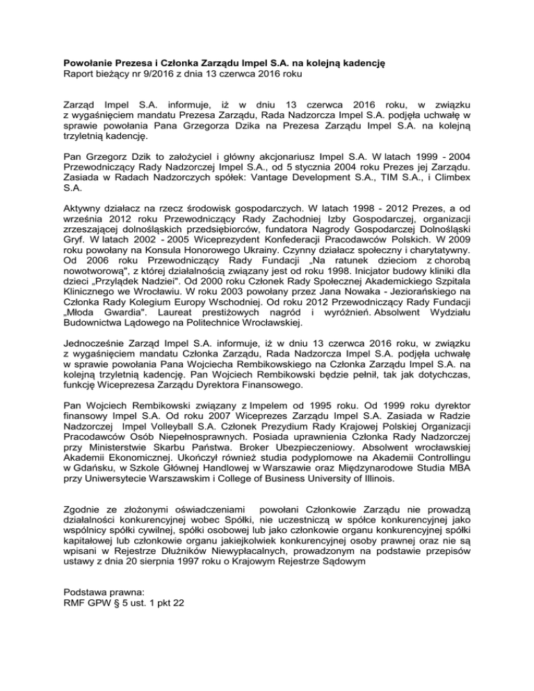 Powołanie Prezesa i Członka Zarządu Impel S.A. na kolejną kadencję Raport bieżący nr 9/2016 z dnia 13 czerwca 2016 roku Zarząd Impel S.A. informuje, iż w dniu 13 czerwca 2016 roku, w związku z wygaśnięciem mandatu Prezesa Zarządu, Rada Nadzorcza Impel S.A. podjęła uchwałę w sprawie powołania Pana Grzegorza Dzika na Prezesa Zarządu Impel S.A. na kolejną trzyletnią kadencję. Pan Grzegorz Dzik to założyciel i główny akcjonariusz Impel S.A. W latach 1999 - 2004 Przewodniczący Rady Nadzorczej Impel S.A., od 5 stycznia 2004 roku Prezes jej Zarządu. Zasiada w Radach Nadzorczych spółek: Vantage Development S.A., TIM S.A., i Climbex S.A. Aktywny działacz na rzecz środowisk gospodarczych. W latach 1998 - 2012 Prezes, a od września 2012 roku Przewodniczący Rady Zachodniej Izby Gospodarczej, organizacji zrzeszającej dolnośląskich przedsiębiorców, fundatora Nagrody Gospodarczej Dolnośląski Gryf. W latach 2002 - 2005 Wiceprezydent Konfederacji Pracodawców Polskich. W 2009 roku powołany na Konsula Honorowego Ukrainy. Czynny działacz społeczny i charytatywny. Od 2006 roku Przewodniczący Rady Fundacji „Na ratunek dzieciom z chorobą nowotworową", z której działalnością związany jest od roku 1998. Inicjator budowy kliniki dla dzieci „Przylądek Nadziei". Od 2000 roku Członek Rady Społecznej Akademickiego Szpitala Klinicznego we Wrocławiu. W roku 2003 powołany przez Jana Nowaka - Jeziorańskiego na Członka Rady Kolegium Europy Wschodniej. Od roku 2012 Przewodniczący Rady Fundacji „Młoda Gwardia". Laureat prestiżowych nagród i wyróżnień. Absolwent Wydziału Budownictwa Lądowego na Politechnice Wrocławskiej. Jednocześnie Zarząd Impel S.A. informuje, iż w dniu 13 czerwca 2016 roku, w związku z wygaśnięciem mandatu Członka Zarządu, Rada Nadzorcza Impel S.A. podjęła uchwałę w sprawie powołania Pana Wojciecha Rembikowskiego na Członka Zarządu Impel S.A. na kolejną trzyletnią kadencję. Pan Wojciech Rembikowski będzie pełnił, tak jak dotychczas, funkcję Wiceprezesa Zarządu Dyrektora Finansowego. Pan Wojciech Rembikowski związany z Impelem od 1995 roku. Od 1999 roku dyrektor finansowy Impel S.A. Od roku 2007 Wiceprezes Zarządu Impel S.A. Zasiada w Radzie Nadzorczej Impel Volleyball S.A. Członek Prezydium Rady Krajowej Polskiej Organizacji Pracodawców Osób Niepełnosprawnych. Posiada uprawnienia Członka Rady Nadzorczej przy Ministerstwie Skarbu Państwa. Broker Ubezpieczeniowy. Absolwent wrocławskiej Akademii Ekonomicznej. Ukończył również studia podyplomowe na Akademii Controllingu w Gdańsku, w Szkole Głównej Handlowej w Warszawie oraz Międzynarodowe Studia MBA przy Uniwersytecie Warszawskim i College of Business University of Illinois. Zgodnie ze złożonymi oświadczeniami powołani Członkowie Zarządu nie prowadzą działalności konkurencyjnej wobec Spółki, nie uczestniczą w spółce konkurencyjnej jako wspólnicy spółki cywilnej, spółki osobowej lub jako członkowie organu konkurencyjnej spółki kapitałowej lub członkowie organu jakiejkolwiek konkurencyjnej osoby prawnej oraz nie są wpisani w Rejestrze Dłużników Niewypłacalnych, prowadzonym na podstawie przepisów ustawy z dnia 20 sierpnia 1997 roku o Krajowym Rejestrze Sądowym Podstawa prawna: RMF GPW § 5 ust. 1 pkt 22