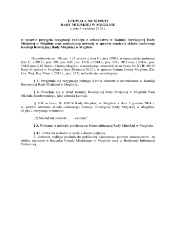 UCHWAŁA NR XII/98/15 RADY MIEJSKIEJ W MOGILNIE z dnia 9 września 2015 r. w sprawie przyjęcia rezygnacji radnego z członkostwa w Komisji Rewizyjnej Rady Miejskiej w Mogilnie oraz zmieniająca uchwałę w sprawie ustalenia składu osobowego Komisji Rewizyjnej Rady Miejskiej w Mogilnie Na podstawie art. 18a ust. 1 i 2 ustawy z dnia 8 marca 1990 r. o samorządzie gminnym (Dz. U. z 2013 r. poz. 594, poz. 645, poz. 1318, z 2014 r., poz. 379 i 1072 oraz z 2015r., poz. 1045) oraz § 82 Statutu Gminy Mogilno, stanowiącego załącznik do uchwały Nr XVII/186/12 Rady Miejskiej w Mogilnie z dnia 28 marca 2012 r. w sprawie Statutu Gminy Mogilno, (Dz. Urz. Woj. Kuj.-Pom. z 2012 r., poz. 877), uchwala się, co następuje: § 1. Przyjmuje się rezygnację radnego Karola Nawrota z członkostwa w Komisji Rewizyjnej Rady Miejskiej w Mogilnie. § 2. Powołuje się w skład Komisji Rewizyjnej Rady Miejskiej w Mogilnie Pana Michała Jakubowskiego, jako członka komisji. § 3.W uchwale Nr II/8/14 Rady Miejskiej w Mogilnie z dnia 5 grudnia 2014 r. w sprawie ustalenia składu osobowego Komisji Rewizyjnej Rady Miejskiej w Mogilnie, §1 pkt 2 otrzymuje brzmienie: „2) Michał Jakubowski - członek” § 3. Wykonanie uchwały powierza się Przewodniczącej Rady Miejskiej w Mogilnie. § 4.1. Uchwała wchodzi w życie z dniem podjęcia. 2. Uchwała podlega podaniu do publicznej wiadomości poprzez umieszczenie na tablicy ogłoszeń w budynku Urzędu Miejskiego w Mogilnie oraz w Biuletynie Informacji Publicznej. UZASADNIENIE DO UCHWAŁY NR XII/98/15 RADY MIEJSKIEJ W MOGILNIE z dnia 9 września 2015 r. w sprawie przyjęcia rezygnacji radnego z członkostwa w Komisji Rewizyjnej Rady Miejskiej w Mogilnie oraz zmieniająca uchwałę w sprawie ustalenia składu osobowego Komisji Rewizyjnej Rady Miejskiej w Mogilnie Projekt niniejszej uchwały przedkłada się w związku z wyborem radnego Karola Nawrota na funkcję Wiceprzewodniczącego Rady Miejskiej w Mogilnie i rezygnacją radnego z członkostwa w Komisji Rewizyjnej Rady Miejskiej w Mogilnie.