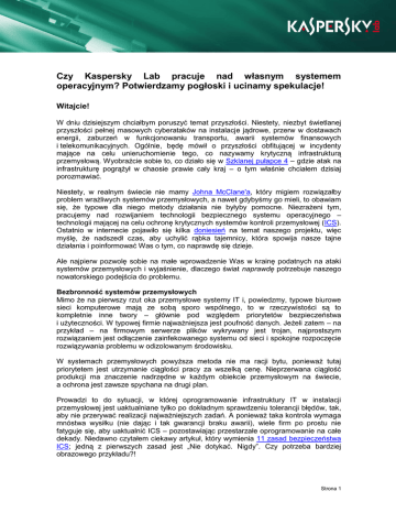 Czy Kaspersky Lab pracuje nad własnym systemem operacyjnym? Potwierdzamy pogłoski i ucinamy spekulacje! Witajcie! W dniu dzisiejszym chciałbym poruszyć temat przyszłości. Niestety, niezbyt świetlanej przyszłości pełnej masowych cyberataków na instalacje jądrowe, przerw w dostawach energii, zaburzeń w funkcjonowaniu transportu, awarii systemów finansowych i telekomunikacyjnych. Ogólnie, będę mówił o przyszłości obfitującej w incydenty mające na celu unieruchomienie tego, co nazywamy krytyczną infrastrukturą przemysłową. Wyobraźcie sobie to, co działo się w Szklanej pułapce 4 – gdzie atak na infrastrukturę pogrążył w chaosie prawie cały kraj – o tym właśnie chciałem dzisiaj porozmawiać. Niestety, w realnym świecie nie mamy Johna McClane'a, który migiem rozwiązałby problem wrażliwych systemów przemysłowych, a nawet gdybyśmy go mieli, to obawiam się, że typowe dla niego metody działania nie byłyby pomocne. Niezrażeni tym, pracujemy nad rozwijaniem technologii bezpiecznego systemu operacyjnego – technologii mającej na celu ochronę krytycznych systemów kontroli przemysłowej (ICS). Ostatnio w internecie pojawiło się kilka doniesień na temat naszego projektu, więc myślę, że nadszedł czas, aby uchylić rąbka tajemnicy, która spowija nasze tajne działania i poinformować Was o tym, co naprawdę się dzieje. Ale najpierw pozwolę sobie na małe wprowadzenie Was w krainę podatnych na ataki systemów przemysłowych i wyjaśnienie, dlaczego świat naprawdę potrzebuje naszego nowatorskiego podejścia do problemu. Bezbronność systemów przemysłowych Mimo że na pierwszy rzut oka przemysłowe systemy IT i, powiedzmy, typowe biurowe sieci komputerowe mają ze sobą sporo wspólnego, to w rzeczywistości są to kompletnie inne twory – głównie pod względem priorytetów bezpieczeństwa i użyteczności. W typowej firmie najważniejsza jest poufność danych. Jeżeli zatem – na przykład – na firmowym serwerze plików wykrywany jest trojan, najprostszym rozwiązaniem jest odłączenie zainfekowanego systemu od sieci i spokojne rozpoczęcie rozwiązywania problemu w odizolowanym środowisku. W systemach przemysłowych powyższa metoda nie ma racji bytu, ponieważ tutaj priorytetem jest utrzymanie ciągłości pracy za wszelką cenę. Nieprzerwana ciągłość produkcji ma znaczenie nadrzędne w każdym obiekcie przemysłowym na świecie, a ochrona jest zawsze spychana na drugi plan. Prowadzi to do sytuacji, w której oprogramowanie infrastruktury IT w instalacji przemysłowej jest uaktualniane tylko po dokładnym sprawdzeniu tolerancji błędów, tak, aby nie przerywać realizacji najważniejszych zadań. A ponieważ taka kontrola wymaga mnóstwa wysiłku (nie dając i tak gwarancji braku awarii), wiele firm po prostu nie fatyguje się, aby uaktualnić ICS – pozostawiając przestarzałe oprogramowanie na całe dekady. Niedawno czytałem ciekawy artykuł, który wymienia 11 zasad bezpieczeństwa ICS; jedną z pierwszych zasad jest „Nie dotykać. Nigdy”. Czy potrzeba bardziej obrazowego przykładu?! Strona 1 Aktualizacja oprogramowania może być również wyraźnie zabroniona przez przemysłowe lub infrastrukturalne reguły bezpieczeństwa firmy. Nawet jeżeli istniałaby możliwość aktualizacji oprogramowania i załatania „dziur”, to niewiele by to pomogło. Producenci specjalistycznego oprogramowania nie są zainteresowani stałą analizą kodu źródłowego i tworzeniem poprawek łatających dziury. Jak pokazuje doświadczenie, nakłady finansowe na tego rodzaju działalność są zazwyczaj ucinane, a poprawki są publikowane okazjonalnie dla wykrytych exploitów, które zostały umieszczone w internecie i stały się powszechnie dostępne. W rzeczywistości jest to prawdą nie tylko dla specjalistycznego oprogramowania, ale także dla ogółu tworów programistycznych, niemniej dziś mówimy konkretnie o oprogramowaniu przemysłowym. Problem polega na tym, że luki w oprogramowaniu kontrolnym, programowalnych kontrolerach i przemysłowych sieciach komunikacyjnych powodują, że operatorzy systemów przemysłowych i infrastrukturalnych nie mają możliwości otrzymywania wiarygodnych informacji o całkowitym stanie operacyjnym poszczególnych systemów! Teoretycznie możliwa jest sytuacja, w której np. atakowany jest system dystrybucji energii elektrycznej, a w wyniku tego ataku awaria pojawia się w jakiejś odległej instalacji, usytuowanej w innej części kraju. Ale centrum sterowania nic o tym nie wie, bo napastnicy zawczasu przesłali fałszywe dane na odpowiednie komputery. Przykłady Nie trzeba się bardzo natrudzić, aby znaleźć przykłady opisanej powyżej sytuacji w realnym świecie. Przykładem cybersabotażu, w jego potencjalnie najbardziej niebezpiecznej formie, był bezpośredni atak na systemy SCADA, przeprowadzony w 2000 r. w Australii. Pracownik podwykonawcy, zajmujący się systemami kontroli Maroochy Shire Council, zdołał w 46 (!) atakach spowodować kompletne zatrzymanie lub nieprawidłową pracę pomp kanalizacyjnych. Nikt nie mógł zrozumieć, co się dzieje, i dlaczego naruszona została komunikacja wewnątrz systemu kontroli. Dopiero po miesiącach od całego incydentu władzom przedsiębiorstwa i lokalnym organom ścigania udało się rozpracować, co właściwie zaszło. Okazało się, że pewien pracownik bardzo chciał dostać pracę w firmie kanalizacyjnej, a kiedy jego aplikacja została odrzucona, postanowił on zalać ściekami ogromny obszar Queensland! Istnieje wiele takich przykładów, a nie słyszymy o nich na co dzień, ponieważ po prostu nie przedostają się one do mediów. Poza tym, firmy padające ofiarą naruszeń bezpieczeństwa na ogół nie są zbyt chętne do ogłaszania całemu światu, że ich systemy zostały naruszone. Występuje tak wiele incydentów, że często nawet same ofiary nie wiedzą o ataku. Nie tak dawno temu w routerach przemysłowych Rugg
