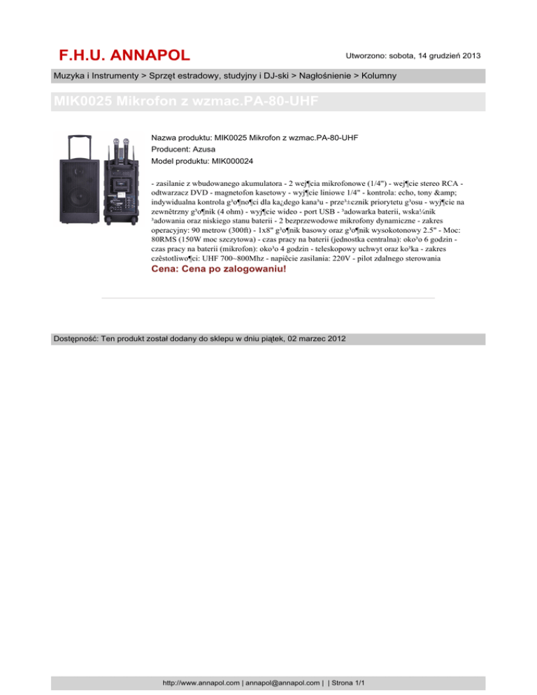 F.H.U. ANNAPOL Utworzono: sobota, 14 grudzień 2013 Muzyka i Instrumenty > Sprzęt estradowy, studyjny i DJ-ski > Nagłośnienie > Kolumny MIK0025 Mikrofon z wzmac.PA-80-UHF Nazwa produktu: MIK0025 Mikrofon z wzmac.PA-80-UHF Producent: Azusa Model produktu: MIK000024 - zasilanie z wbudowanego akumulatora - 2 wej¶cia mikrofonowe (1/4") - wej¶cie stereo RCA odtwarzacz DVD - magnetofon kasetowy - wyj¶cie liniowe 1/4" - kontrola: echo, tony & indywidualna kontrola g³o¶no¶ci dla ka¿dego kana³u - prze³±cznik priorytetu g³osu - wyj¶cie na zewnêtrzny g³o¶nik (4 ohm) - wyj¶cie wideo - port USB - ³adowarka baterii, wska¼nik ³adowania oraz niskiego stanu baterii - 2 bezprzewodowe mikrofony dynamiczne - zakres operacyjny: 90 metrow (300ft) - 1x8" g³o¶nik basowy oraz g³o¶nik wysokotonowy 2.5" - Moc: 80RMS (150W moc szczytowa) - czas pracy na baterii (jednostka centralna): oko³o 6 godzin czas pracy na baterii (mikrofon): oko³o 4 godzin - teleskopowy uchwyt oraz ko³ka - zakres czêstotliwo¶ci: UHF 700~800Mhz - napiêcie zasilania: 220V - pilot zdalnego sterowania Cena: Cena po zalogowaniu! Dostępność: Ten produkt został dodany do sklepu w dniu piątek, 02 marzec 2012 http://www.annapol.com | [email protected] | | Strona 1/1