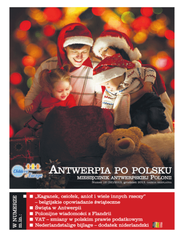 ANTWERPIA PO POLSKU MIESIĘCZNIK ANTWERPSKIEJ W NUMERZE m.in.: Numer 12 (32)/2013, grudzień 2013. POLONII GAZETA BEZPŁATNA n „Kaganek, osiołek, anioł i wiele innych rzeczy” – belgijskie opowiadanie świąteczne n Święta w Antwerpii n Polonijne wiadomości z Flandrii n VAT – zmiany w polskim prawie podatkowym n Nederlandstalige bijlage – dodatek niderlandzki 2 Antwerpia po polsku grudzień 2013 Spis treści: Wiersz wigilijny 4..... Święta Bożego Narodzenia 6..... Kaganek, osiolek i anioł i wiele innych rzeczy 10..... O choince prawie wszystko Czekając, kiedy wzejdzie wigilijna gwiazda, Do wpół zmarzniętej szyby przywarł chłopiec mały. Patrzył – zimowe ptaki wracały do gniazda, Jakby tego wieczoru też świętować chciały. 12..... Grudniowe refleksje 15..... Święta w Antwerpii 16..... Poznajemy i odkrywamy Antwerpię 18..... Kosztowne pamiatki z wakacji Niegdyś gwiazda z Betlejem mędrców prowadziła, Dziś znak daje, by zasiąść do świętej wieczerzy, By krucha biel opłatka skłóconych godziła, A w sercu znów zamieszkał Ten, co „w żłobie leży”. 19..... Przegląd prasy belgijskiej 22..... Szkoda, że Was tam nie było 25..... Kącik historyczny 27..... Znani nieznani 31..... Dodatek niderlandzki Dla tych, co żyli dawniej, co będą w przyszłości I dla nas, byśmy w każdym dostrzegali brata, Odwieczny Bóg w Dziecięciu zesłał znak miłości, Przemieniając oblicze człowieka i świata. 35..... Z życia posiej szkoły w Antwerpii 36..... Polonijne wiadomości sportowe 38..... Polonijne wiadomości z Flandrii – Mechelen 39..... Polonijne wiadomości z Flandrii – Leuven 40..... Polonijne wiadomości z Flandrii – Geel O. FRANCISZEK CZARNOWSKI, FRANCISZKANIN 41..... Polonijne wiadomości z Flandrii – Gent 43..... Przegląd prasy polskiej 45..... VAT - zmiany w polskim prawie podatkowym Zdrowych, spokojnych, szczęśliwych Świąt Bożego Narodzenia oraz szczęśliwego Nowego Roku – życzy redakcja „Antwerpii po polsku”. 48..... Co tam Panie słychać w Belgii? 50..... Autobusem do Polski 52..... Słowo o byle czym 56..... Kulinaria 58..... Ciekawostki 60 .... Job Talent 61 .... Ogłoszenia drobne 63 .... Ważne numery telefonów w Antwerpii Projekt jest współfinansowany ze środków finansowych otrzymanych od Ministerstwa Spraw Zagranicznych w ramach konkursu na realizację zadania „Współpraca z Polonią i Polakami za granicą”, przy współpracy z Fundacją Semper Polonia w Warszawie. SKŁAD REDAKCJI: Agata Kocińska, Magdalena Wawryszuk, Anna Janicka Kontakt: [email protected], tel.: 0489/823803 WYDAWCA: Fundacja „Children of Europe”, www.antwerpiapopolsku.be Redakcja nie ponosi odpowiedzialności za treść reklam i ogłoszeń Jesteśmy na Facebooku, szukaj: [email protected] lub bezpośrednio: http://facebook.com/Children.of.Europe grudzień 2013 Antwerpia po polsku 3 4 Antwerpia po polsku grudzień 2013 Święta Bożego Narodzenia - polskie opowiadanie świąteczne C zerwona tarcza słońca coraz szybciej chyliła się ku zachodowi. Ostatnie długie promienie przetykały łagodnie czuby najwyższych sosen, wzniecając kręgi iskier w napotkanych pojedynczych płatkach śniegu. Dobiegał końca kolejny, mroźny grudniowy dzień. Na skraju niewielkiej świerkowej polany tkwił nieruchomo samotny człowiek. Zamyślonym wzrokiem błądził po obsypanych świeżym śnieżnym pierzem drzewach, jak gdyby czegoś jeszcze poszukiwał. Tuż za nim, na starych drewnianych saneczkach, leżała ścięta przeszło godzinę temu mała choinka na święta. Nic nie mąciło przedwczesnej ciszy, nawet urwis – wiatr z rzadka tylko potrącał tę czy inną gałązkę. – Najwyższy czas wracać już do domu – pomyślał samotny człowiek. Było już naprawdę późno. Zdecydował się nie wracać tą samą drogą co zawsze, tylko wybrał mniej wygodny skrót przez sosnowy zagajnik. Dokuczało mu zmęczenie i niewiele go obchodziły pierwsze płatki śniegu, które niebawem poczęły wirować w powietrzu. Odetchnął za to z ulgą, kiedy doleciało go znajome naszczekiwanie psów, a później zamajaczyły tuż przed nim – niczym wielkie śnieżne grzyby – wtulone w grudniową noc domki rodzinnej wioski. W każdym z nich paliło się światło, rozlegały się krzyki zachwyconych dzieci, raz nawet poczuł zapach przyrządzonej świątecznej ryby. Tylko ostatni domek mocno odróżniał się od pozostałych: nienaturalnie cichy, mroczny, jakiś nieswój – nawet dróżkę prowadzącą do drzwi zdążył przysypać świeży śnieg. Był to jego dom. Dom – przyjaciel, ale również niemy świadek bolesnych wydarzeń. Dwa lata wcześniej przetoczyła się przez wioskę epidemia szkarlatyny. Bezlitosna choroba, drwiąc z wysiłków lekarzy, wyciągała drapieżne ręce po coraz to nowe ofiary. Zanim została pokonana, wielu ludziom nadszarpnęła zdrowie. W domu leśniczego poczyniła największe spustoszenie: najpierw straciła życie córka, a w parę dni później również młoda żona leśniczego. Usłużny i miły do tej pory człowiek zmienił się w samotnika o ponurym spojrzeniu. Ludzie zaczęli się go bać. Prawie nikt go nie odwiedzał, zresztą on sam wolał całe dnie przesiadywać w lesie, gdzie spędził też pierwsze święta po stracie rodziny. Upływający czas łagodził stopniowo ból tęsknoty za najbliższymi. Młody leśniczy stał się spokojniejszy i przestał stronić od ludzi. Nadal jednak częstym gościem na jego twarzy był bezbrzeżny smutek, zwłaszcza kiedy widział inne rodziny, rozbrzmiewające hałasem dziecięcych zabaw. On był sam i to najbardziej go gryzło. „Wśród nocnej ciszy głos się rozchodzi: wstańcie, pasterze...” – doleciał go w pewnej chwili donośny śpiew kolędy z domu sąsiada – piekarza. – Tak, to prawda – pomyślał leśniczy. – Ja też mam powstać i nie dać się zwyciężyć rozpaczy, chociaż straciłem najbliższe mi istoty. Może i dla mnie za