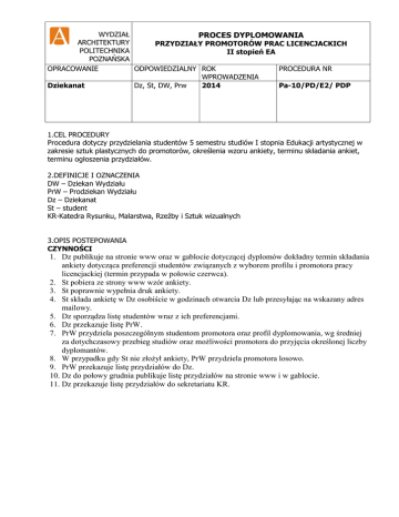 WYDZIAŁ PROCES DYPLOMOWANIA ARCHITEKTURY PRZYDZIAŁY PROMOTORÓW PRAC LICENCJACKICH POLITECHNIKA II stopień EA POZNAŃSKA OPRACOWANIE ODPOWIEDZIALNY ROK PROCEDURA NR WPROWADZENIA Dziekanat Dz, St, DW, Prw 2014 Pa-10/PD/E2/ PDP 1.CEL PROCEDURY Procedura dotyczy przydzielania studentów 5 semestru studiów I stopnia Edukacji artystycznej w zakresie sztuk plastycznych do promotorów, określenia wzoru ankiety, terminu składania ankiet, terminu ogłoszenia przydziałów. 2.DEFINICJE I OZNACZENIA DW – Dziekan Wydziału PrW – Prodziekan Wydziału Dz – Dziekanat St – student KR-Katedra Rysunku, Malarstwa, Rzeźby i Sztuk wizualnych 3.OPIS POSTEPOWANIA CZYNNOŚCI 1. Dz publikuje na stronie www oraz w gablocie dotyczącej dyplomów dokładny termin składania ankiety dotycząca preferencji studentów związanych z wyborem profilu i promotora pracy licencjackiej (termin przypada w połowie czerwca). 2. St pobiera ze strony www wzór ankiety. 3. St poprawnie wypełnia druk ankiety. 4. St składa ankietę w Dz osobiście w godzinach otwarcia Dz lub przesyłając na wskazany adres mailowy. 5. Dz sporządza listę studentów wraz z ich preferencjami. 6. Dz przekazuje listę PrW. 7. PrW przydziela poszczególnym studentom promotora oraz profil dyplomowania, wg średniej za dotychczasowy przebieg studiów oraz możliwości promotora do przyjęcia określonej liczby dyplomantów. 8. W przypadku gdy St nie złożył ankiety, PrW przydziela promotora losowo. 9. PrW przekazuje listę przydziałów do Dz. 10. Dz do połowy grudnia publikuje listę przydziałów na stronie www i w gablocie. 11. Dz przekazuje listę przydziałów do sekretariatu KR.