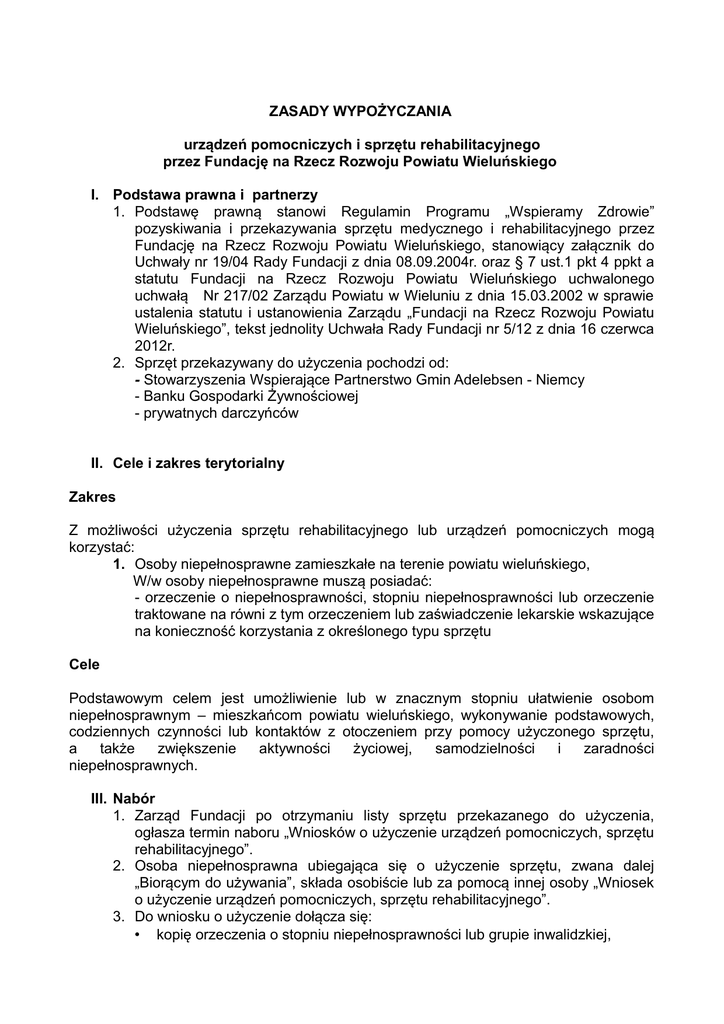 ZASADY WYPOŻYCZANIA urządzeń pomocniczych i sprzętu rehabilitacyjnego przez Fundację na Rzecz Rozwoju Powiatu Wieluńskiego I. Podstawa prawna i partnerzy 1. Podstawę prawną stanowi Regulamin Programu „Wspieramy Zdrowie” pozyskiwania i przekazywania sprzętu medycznego i rehabilitacyjnego przez Fundację na Rzecz Rozwoju Powiatu Wieluńskiego, stanowiący załącznik do Uchwały nr 19/04 Rady Fundacji z dnia 08.09.2004r. oraz § 7 ust.1 pkt 4 ppkt a statutu Fundacji na Rzecz Rozwoju Powiatu Wieluńskiego uchwalonego uchwałą Nr 217/02 Zarządu Powiatu w Wieluniu z dnia 15.03.2002 w sprawie ustalenia statutu i ustanowienia Zarządu „Fundacji na Rzecz Rozwoju Powiatu Wieluńskiego”, tekst jednolity Uchwała Rady Fundacji nr 5/12 z dnia 16 czerwca 2012r. 2. Sprzęt przekazywany do użyczenia pochodzi od: - Stowarzyszenia Wspierające Partnerstwo Gmin Adelebsen - Niemcy - Banku Gospodarki Żywnościowej - prywatnych darczyńców II. Cele i zakres terytorialny Zakres Z możliwości użyczenia sprzętu rehabilitacyjnego lub urządzeń pomocniczych mogą korzystać: 1. Osoby niepełnosprawne zamieszkałe na terenie powiatu wieluńskiego, W/w osoby niepełnosprawne muszą posiadać: - orzeczenie o niepełnosprawności, stopniu niepełnosprawności lub orzeczenie traktowane na równi z tym orzeczeniem lub zaświadczenie lekarskie wskazujące na konieczność korzystania z określonego typu sprzętu Cele Podstawowym celem jest umożliwienie lub w znacznym stopniu ułatwienie osobom niepełnosprawnym – mieszkańcom powiatu wieluńskiego, wykonywanie podstawowych, codziennych czynności lub kontaktów z otoczeniem przy pomocy użyczonego sprzętu, a także zwiększenie aktywności życiowej, samodzielności i zaradności niepełnosprawnych. III. Nabór 1. Zarząd Fundacji po otrzymaniu listy sprzętu przekazanego do użyczenia, ogłasza termin naboru „Wniosków o użyczenie urządzeń pomocniczych, sprzętu rehabilitacyjnego”. 2. Osoba niepełnosprawna ubiegająca się o użyczenie sprzętu, zwana dalej „Biorącym do używania”, składa osobiście lub za pomocą innej osoby „Wniosek o użyczenie urządzeń pomocniczych, sprzętu rehabilitacyjnego”. 3. Do wniosku o użyczenie dołącza się: • kopię orzeczenia o stopniu niepełnosprawności lub grupie inwalidzkiej, zaświadczenie lekarskie potwierdzające potrzebę posiadania wnioskowanego urządzenia lub sprzętu, • zaświadczenie o wysokości dochodu na jednego członka rodziny. 4. Do umowy o użyczenie dołącza się: • dowód wpłaty kaucji na konto Fundacji • (Kaucja jest określona w tabeli punkt VI, a jej wysokość zależy od rodzaju użyczanego sprzętu. Kaucja jest zabezpieczeniem Użyczającego w przypadku uszkodzenia jak i utraty sprzętu.) 5. W imieniu Fundacji sprzęt przyznaje Komisja powołana przez Zarząd Fundacji. 6. W skład Komisji wchodzą 3 osoby powołane przez Zarząd Fundacji, w tym dwóch przedstawicieli Fundacji i przedstawiciel Powiatowego Centrum Pomocy Rodzinie. 7. W skład Komisji nie mogą wchodzić osoby zainteresowane otrzymaniem sprzętu. 8. Protokół z posiedzenia Komisji zostaje przekazany do zatwierdzenia Zarządowi Fundacji. IV. Ogólne zasady świadczenia usług 1. Sprzęt udostępniany jest osobom niepełnosprawnym nieodpłatnie. 2. Podstawę użyczenia sprzętu stanowi umowa użyczenia zawarta pomiędzy Fundacją na Rzecz Rozwoju Powiatu Wieluńskiego zwanym Użyczającym a Biorącym w używanie, która określa szczegółowy zakres obowiązków każdej ze stron. 3. Biorący w używanie ma obowiązek używać sprzęt zgodnie z jego przeznaczeniem 4. Odbiór i zwrot sprzętu własnym transportem. 5. Dezynfekcja po stronie Biorącego w używanie. 6. Biorący w używanie jest zobowiązany do powiadomienia Użyczającego o każdorazowej zmianie miejsca eksploatacji użyczonego sprzętu 7. Biorący w używanie zobowiązany jest dokonać wszelkich starań celem zabezpieczenia użyczonego sprzętu przed kradzieżą lub uszkodzeniem 8. W przypadku nieoczekiwanych okoliczności, takich jak kradzież, pożar itp., Biorący w używanie zobowiązany jest bezzwłocznie powiadomić Użyczającego oraz odpowiednie służby (policję, straż pożarną itd.) 9. Okres użyczenia biegnie od następnego dnia po wydaniu sprzętu i nie może być dłuższy niż 6 miesięcy. 10. Ewentualne przedłużenie okresu użyczenia może nastąpić w okresie obowiązywania umowy użyczenia, nie później niż 14 dni przed jej wygaśnięciem, po ponownym przedłożeniu aktualnego zaświadczenia od lekarza, zawierającego informację o konieczności korzystania z określonego typu sprzętu rehabilitacyjnego lub urządzeń pomocniczych. 11. Biorący w używanie zobowiązany jest do przeprowadzenia oględzin sprzętu przed rozpoczęciem używania i wskazania ewentualnych wad sprzętu Użyczającemu. 12. W przypadku stwierdzenia wadliwego działania urządzenia podczas jego eksploatacji, Biorący w używanie zobowiązany jest do niezwłocznego zgłoszenia tego faktu Użyczającemu i niekorzystanie z urządzenia do czasu sprawdzenia jego stanu przez Użyczającego. 13. W przypadku uszkodzenia lub częściowego zniszczenia sprzętu koszty jego naprawy ponosi Biorący w używanie. 14. W przypadku całkowitego zniszczenia sprzętu z powodu okoliczności, za które Biorący w używanie ponosi odpowiedzialność, jest on zobowiązany do zakupu takiego samego sprzętu, a w przypadku gdyby było to niemożliwe do zwrotu równowartości tego sprzętu. 15. W chwili podpisania Umowy Użyczenia, Biorący w używanie przejmuje na siebie obowiązek zabezpieczenia i ochrony użyczonego sprzętu przed kradzieżą i utratą. 16. W przypadku nie zwrócenia sprzętu w terminie, Fundacja obciąży Biorącego do używania karą umowna w wysokości 0,25% wartości sprzętu za każdy dzień opóźnienia. Po przekroczeniu sześćdziesięciu dni od ustalonej daty użyczenia, sprawa kierowana jest do sądu właściwego dla miejsca 