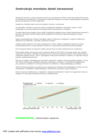 Instrukcja montażu deski tarasowej Wilgotność drewna w desce tarasowej waha się w granicach 25-30% i jako taka przeznaczona jest do zastosowań zewnętrznych. Montowanie wewnątrz obiektów wymaga wcześniejszego wysuszenia drewna do poziomu 9-10% wilgotności. Podłoże do montażu deski musi być stabilne, twarde i wyrównane. W przypadku montażu na gruncie należy przygotować podkład z mieszaniny piasku i żwiru usypanego na czarnej włókninie chroniącej przed przerastaniem chwastów. W czasie deszczowej pogody może dojść do plamienia podłoża przez związki garbnikowe zawarte w drewnie. Aby tego uniknąć należy pokryć podkłady cementowe malarską powłoką na bazie poliuretanu. Deskę antypoślizgową z drewna twardego należy montować na legarach o ciężarze właściwym zbliżonym do materiału, z którego wykonane są deski. Odstęp między deskami nie może przekraczać 5-10mm. Należy uwzględnić naturalny proces wysychania drewna w czasie gorących letnich dni i pęcznienia podczas deszczowej pogody. Do mocowania desek ta rasowych należy używać śrub ze stali nierdzewnej lub mosiężnych. Śruby bądź wkręty nie powinny być mocowane dalej niż 50-70mm od brzegu deski, aby uniknąć wyginania się końców. Długość śrub powinna być równa dwukrotnej grubości montowanej deski, a minimalna średnica śruby - 5mm. Wymagane nawiercanie wiertłem o średnicy co najmniej równej średnicy zastosowanych śrub. Montaż na podłożu nienasiąkliwym powinien zapewniać o odpływ wody spomiędzy legarów. W tym celu należy zastosować podkładki izolacyjne pod legary wykonane z materiału nienasiąkliwego (np. gumowe), dodatkowo chroniące drewno od kontaktu z wodą podsiąkającą z podłoża. Jeśli konstrukcja spodnia ma opierać się na betonowych klockach lub podkładkach muszą one być rozstawione w odstępach odpowiadających rozstawieniu graniaków (patrz diagram). Deski muszą być składowane w sztaplach i związane bandówkami. Deski nie mogą leżeć luzem ze względu na naturalną tendencję drewna do odkształcania. PRODEXPOL Parkiety krajowe i egzotyczne PDF created with pdfFactory trial version www.pdffactory.com