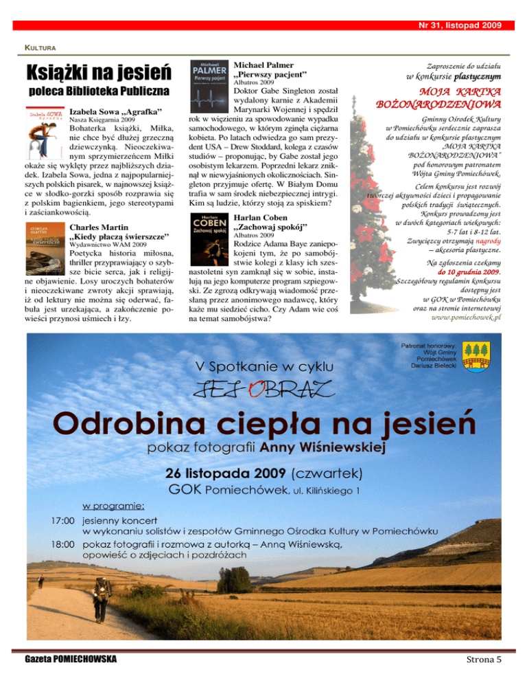 Nr 31, listopad 2009 KULTURA KsiąŜki na jesień poleca Biblioteka Publiczna Izabela Sowa „Agrafka” Nasza Księgarnia 2009 Bohaterka książki, Miłka, nie chce być dłużej grzeczną dziewczynką. Nieoczekiwanym sprzymierzeńcem Miłki okaże się wyklęty przez najbliższych dziadek. Izabela Sowa, jedna z najpopularniejszych polskich pisarek, w najnowszej książce w słodko-gorzki sposób rozprawia się z polskim bagienkiem, jego stereotypami i zaściankowością. Charles Martin „Kiedy płaczą świerszcze” Wydawnictwo WAM 2009 Poetycka historia miłosna, thriller przyprawiający o szybsze bicie serca, jak i religijne objawienie. Losy uroczych bohaterów i nieoczekiwane zwroty akcji sprawiają, iż od lektury nie można się oderwać, fabuła jest urzekająca, a zakończenie powieści przynosi uśmiech i łzy. Gazeta POMIECHOWSKA Michael Palmer „Pierwszy pacjent” Albatros 2009 Doktor Gabe Singleton został wydalony karnie z Akademii Marynarki Wojennej i spędził rok w więzieniu za spowodowanie wypadku samochodowego, w którym zginęła ciężarna kobieta. Po latach odwiedza go sam prezydent USA – Drew Stoddard, kolega z czasów studiów – proponując, by Gabe został jego osobistym lekarzem. Poprzedni lekarz zniknął w niewyjaśnionych okolicznościach. Singleton przyjmuje ofertę. W Białym Domu trafia w sam środek niebezpiecznej intrygi. Kim są ludzie, którzy stoją za spiskiem? Harlan Coben „Zachowaj spokój” Albatros 2009 Rodzice Adama Baye zaniepokojeni tym, że po samobójstwie kolegi z klasy ich szesnastoletni syn zamknął się w sobie, instalują na jego komputerze program szpiegowski. Ze zgrozą odkrywają wiadomość przesłaną przez anonimowego nadawcę, który każe mu siedzieć cicho. Czy Adam wie coś na temat samobójstwa? Zaproszenie do udziału w konkursie plastyczn plastycznym tycznym MOJA KARTKA BOś BOśONARODZENIOWA Gminny Ośrodek Kultury w Pomiechówku serdecznie zaprasza do udziału w konkursie plastycznym „MOJA KARTKA BOśONARODZENIOWA” pod honorowym patronatem Wójta Gminy Pomiechówek. Celem konkursu jest rozwój twórczej aktywności dzieci i propagowanie polskich tradycji świątecznych. Konkurs prowadzony jest w dwóch kategoriach wiekowych: 5-7 lat i 8-12 lat. Zwycięzcy otrzymają nagrody – akcesoria plastyczne. Na zgłoszenia czekamy do 10 grudnia 2009. 2009 Szczegółowy regulamin konkursu dostępny jest w GOK w Pomiechówku oraz na stronie internetowej www.pomiechowek.pl Strona 5