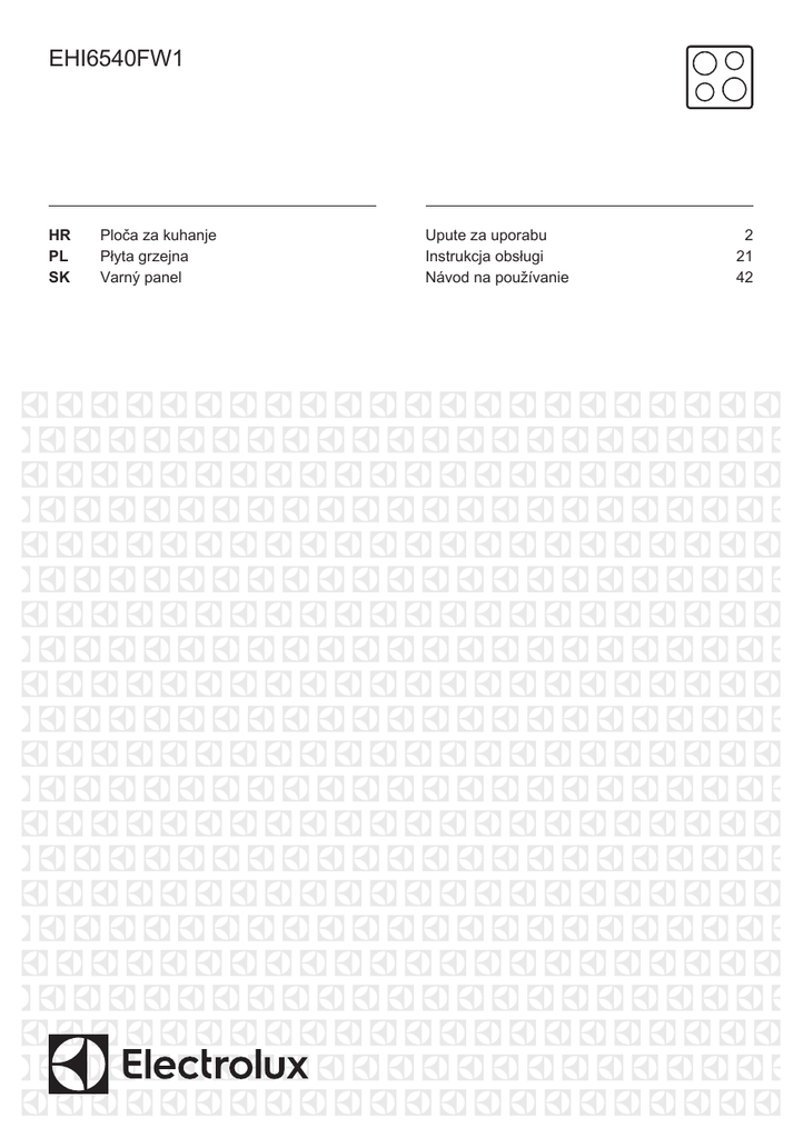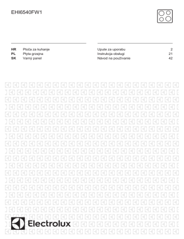 EHI6540FW1 HR PL SK Ploča za kuhanje Płyta grzejna Varný panel Upute za uporabu Instrukcja obsługi Návod na používanie 2 21 42 2 www.electrolux.com SADRŽAJ 1. INFORMACIJE O SIGURNOSTI........................................................................ 3 2. SIGURNOSNE UPUTE...................................................................................... 4 3. OPIS PROIZVODA............................................................................................. 7 4. SVAKODNEVNA UPORABA..............................................................................9 5. SAVJETI........................................................................................................... 12 6. ČIŠĆENJE I ODRŽAVANJE.............................................................................13 7. RJEŠAVANJE PROBLEMA..............................................................................14 8. POSTAVLJANJE.............................................................................................. 16 9. TEHNIČKI PODACI.......................................................................................... 18 10. ENERGETSKA UČINKOVITOST................................................................... 19 MISLIMO NA VAS Hvala vam što ste kupili Electrolux uređaj. Izabrali ste proizvod koji sa sobom donosi desetljeća profesionalnog iskustva i inovacija. Domišljat i elegantan, projektiran je misleći na vas. Stoga, uvijek kada ga koristite, možete biti sigurni znajući da ćete svaki put dobiti izvrsne rezultate. Dobrodošli u Electrolux. Posjetite našu internetsku stranicu za: Dobivanje savjeta o korištenju, prospekata, rješavanju problema, servisnim informacija: www.electrolux.com/webselfservice Registriranje vašeg proizvoda za bolji servis: www.registerelectrolux.com Kupovinu dodatne opreme, potrošnog materijala i originalnih rezervnih dijelova za vaš uređaj: www.electrolux.com/shop BRIGA O KUPCIMA I SERVIS Preporučujemo uporabu originalnih rezervnih dijelova. Prilikom kontaktiranja ovlaštenog servisnog centra, provjerite da su vam dostupni sljedeći podaci: Model, PNC, serijski broj. Informacije možete pronaći na nazivnoj pločici. Upozorenje / Oprez - sigurnosne informacije Opće informacije i savjeti Ekološke informacije Zadržava se pravo na izmjene. HRVATSKI 1. 3 INFORMACIJE O SIGURNOSTI Prije postavljanja i korištenja uređaja pažljivo pročitajte isporučene upute. Proizvođač nije odgovoran za bilo kakvu ozljedu ili oštećenje koji su rezultat neispravnog postavljanja ili korištenja. Upute uvijek držite na sigurnom i pristupačnom mjestu za buduću upotrebu. 1.1 Sigurnost djece i slabijih osoba • • • • • • • Ovaj uređaj mogu upotrebljavati djeca starija od 8 godina i osobe sa smanjenim sposobnostima uz uvjet da su dobile upute i/ili da ih se nadgleda zbog sigurne upotrebe uređaja i razumijevanja mogućih opasnosti. Ne dozvolite djeci da se igraju s uređajem. Sva pakiranja držite izvan dohvata djece i odlažite ih na odgovarajući način. Djeci i kućnim ljubimcima ne dozvoljavajte približavanje uređaju dok je u radu ili dok se hladi. Pristupačni dijelovi su vrući. Ako uređaj ima sigurnosno zaključavanje za zaštitu djece, morate ga aktivirati. Bez nadzora djeca ne smiju čistiti uređaj i provoditi održavanje koje izvršava korisnik. Djecu mlađu od 3 godine potrebno jew držati podalje od uređaja tijekom cijelog vremena uporabe uređaja. 1.2 Opća sigurnost • • • UPOZORENJE: Uređaj i njegovi dostupni dijelovi zagrijavaju se tijekom uporabe. Pazite da ne dodirujete grijače. Djeca mlađa od 8 godine trebaju se držati podalje ako nisu pod trajnim nadzorom. Ne upravljajte uređajem pomoću vanjskog uređaja za podešavanja vremena ili preko odvojenog sustava za daljinsko upravljanje. UPOZORENJE: Kuhanje na ploči za kuhanje bez nadzora uz upotrebu masnoće ili ulja može biti opasno i može dovesti do požara. 4 www.electrolux.com • • • • • • • • • Vatru NIKADA ne gasite vodom već isključite uređaj i tada prekrijte vatru, npr. poklopcem ili protupožarnim prekrivačem. OPREZ: Postupak kuhanja potrebno je nadgledati. Kratkotrajni postupak kuhanja potrebno je stalno nadgledati. UPOZORENJE: Opasnost od požara: Stvari ne držite na površinama za kuhanje. Metalne predmete kao što su noževi, vilice, žlice i poklopce ne stavljajte na površinu ploče za kuhanje jer će se zagrijati. Za čišćenje uređaja ne upotrebljavajte uređaje za parno čišćenje. Nakon uporabe, isključite element ploče za kuhanje odgovarajućom kontrolom, a ne oslanjajte se na detektor posuđa. Ako je staklokeramička/staklena površina napuknuta, isključite uređaj kako biste spriječili mogućnost električnog udara. Ako je kabel za napajanje oštećen, proizvođač ili ovlašteni servis ili osoba sličnih kvalifikacija mora ga zamijeniti kako bi se izbjegla opasnost. UPOZORENJE: Koristite samo zaštitu ploče za kuhanje koju je napravio proizvođač uređaja za kuhanje, koje je je u uputama za uporabu proizvođač naveo kao prikladne ili one koji su isporučeni s uređajem. Uporaba neodgovarajuće zaštite može uzrokovati nesreće. 2. SIGURNOSNE UPUTE 2.1 Postavljanje • • • • UPOZORENJE! Samo kvalificirana osoba smije postaviti ovaj uređaj. • Odstranite svu ambalažu. Ne postavljajte i ne koristite oštećeni uređaj. Slijedite upute za postavljanje isporučene s uređajem. • Održavajte minimalnu udaljenost od drugih uređaja i kuhinjskih elemenata. Prilikom pomicanja uređaja uvijek budite pažljivi jer je uređaj težak. Uvijek nosite zaštitne rukavice i zatvorenu obuću. Izrezane površine zabrtvite sredstvom za brtvljenje kako biste spriječili bubrenje uzrokovano vlagom. HRVATSKI • • • • • Donji dio uređaja zaštite od pare i vlage. Uređaj ne postavljajte u blizini vrata ili ispod prozora. Na taj se način sprječava pad vrućeg posuđa kada se vrata ili prozor otvore. A